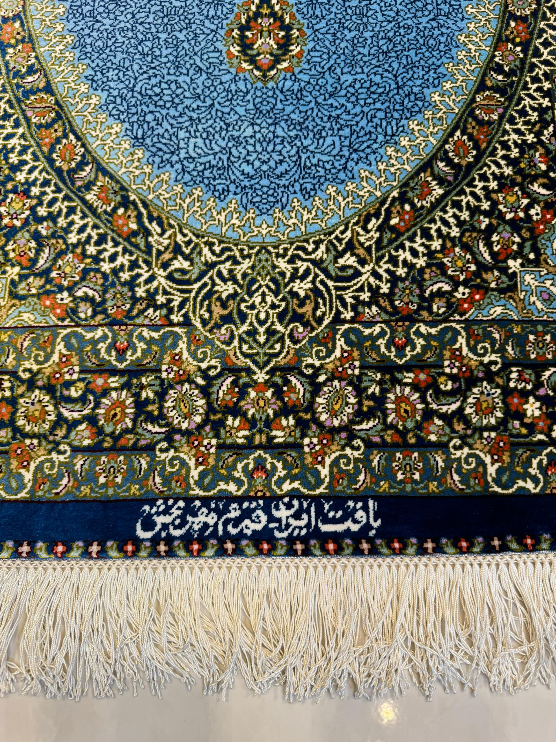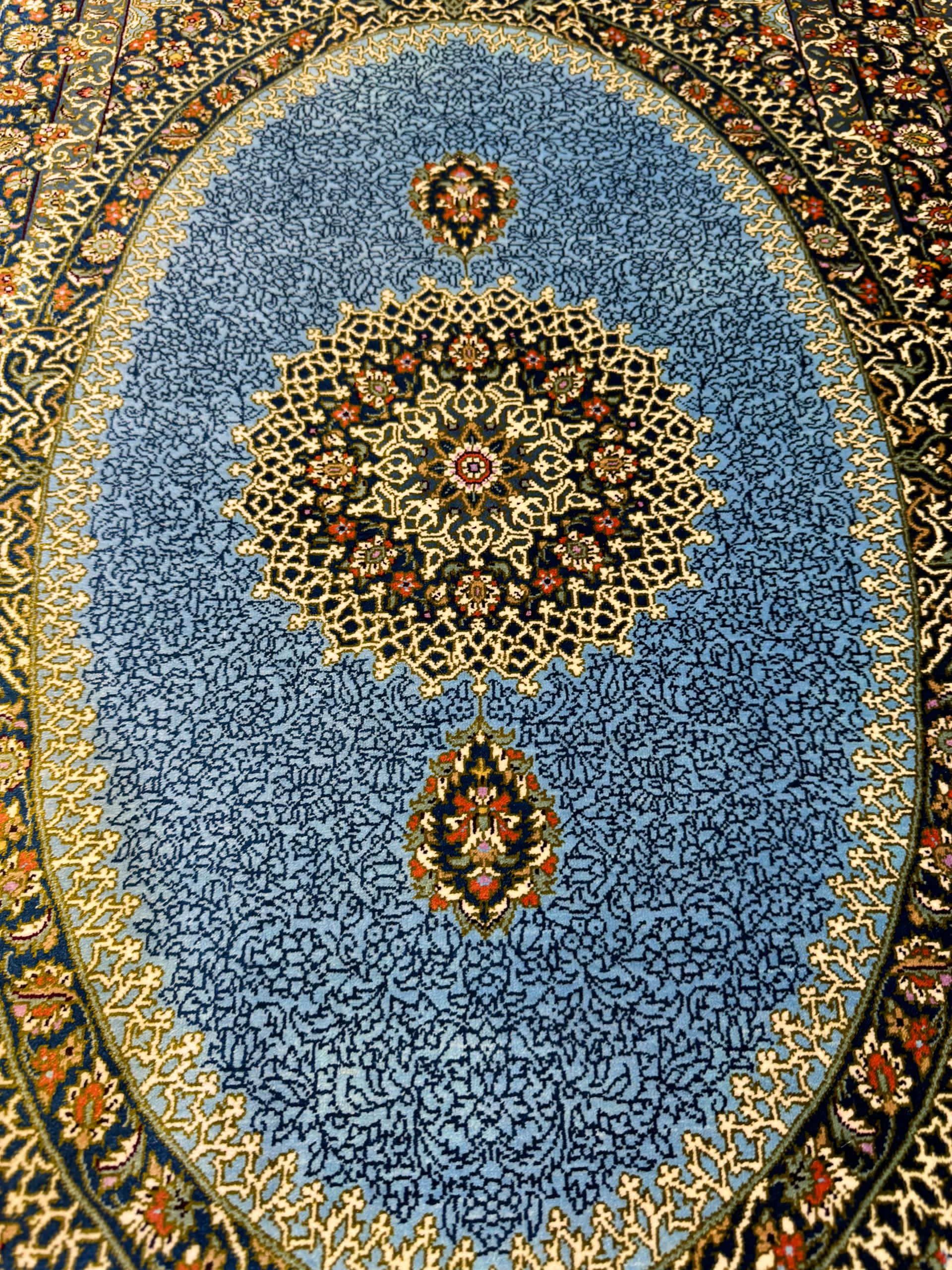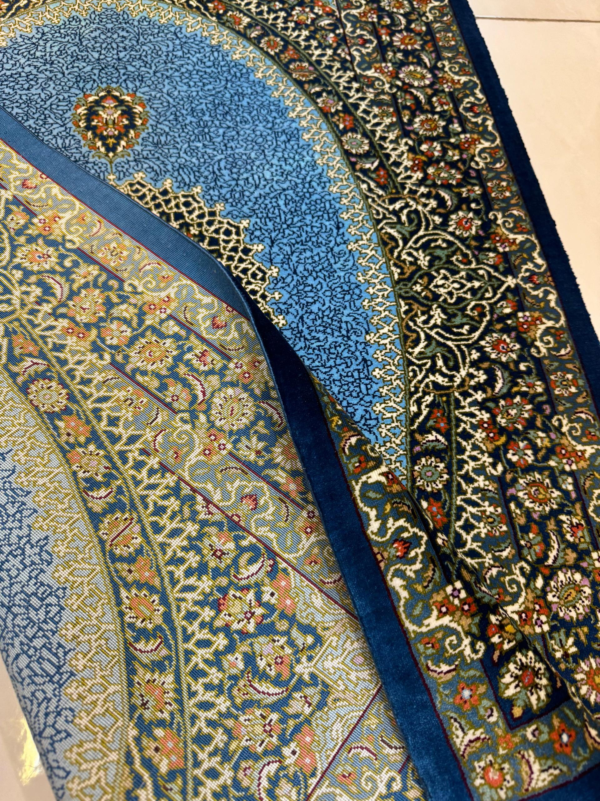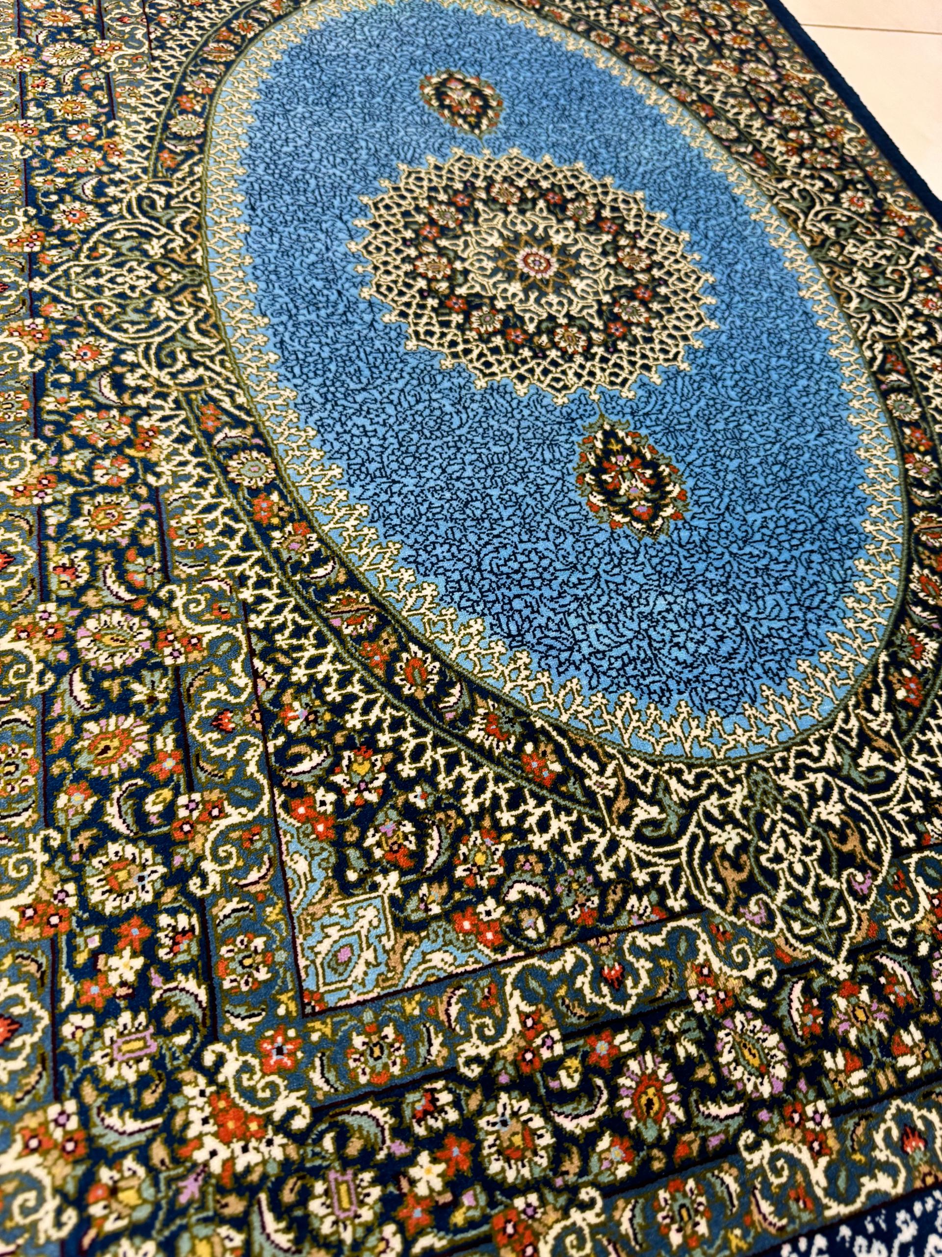驚くような細かな織り目とビロードのような生地、肌に吸い付くようなシルクの艶やかな光沢感が豪華絢爛。まさに、「The ペルシャ絨毯」と言うべき最高峰のペルシャ絨毯は、もはや工芸品ではなく美術品としての価値となります。メフルバフ工房のサイン入り。シルクの絨毯は毛足の光沢が見る向きによってまったく趣の異なる色合いになりますので、敷く際は向きを調整してください。