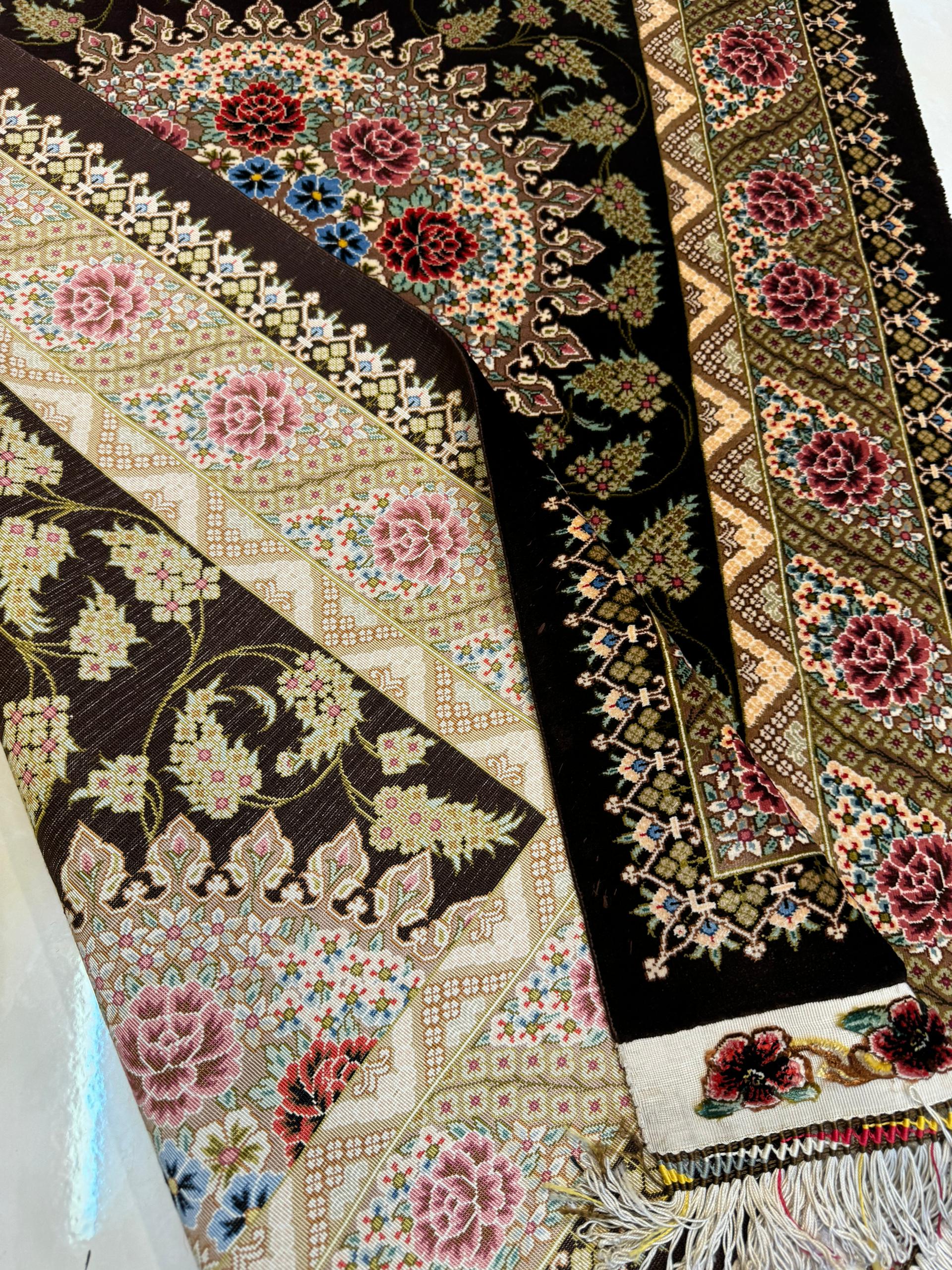 驚くような細かな織り目とビロードのような生地、肌に吸い付くようなシルクの艶やかな光沢感が豪華絢爛。まさに、「The ペルシャ絨毯」と言うべき最高峰のペルシャ絨毯は、もはや工芸品ではなく美術品としての価値となります。ジャディ工房のサイン入り。シルクの絨毯は毛足の光沢が見る向きによってまったく趣の異なる色合いになりますので、敷く際は向きを調整してください。