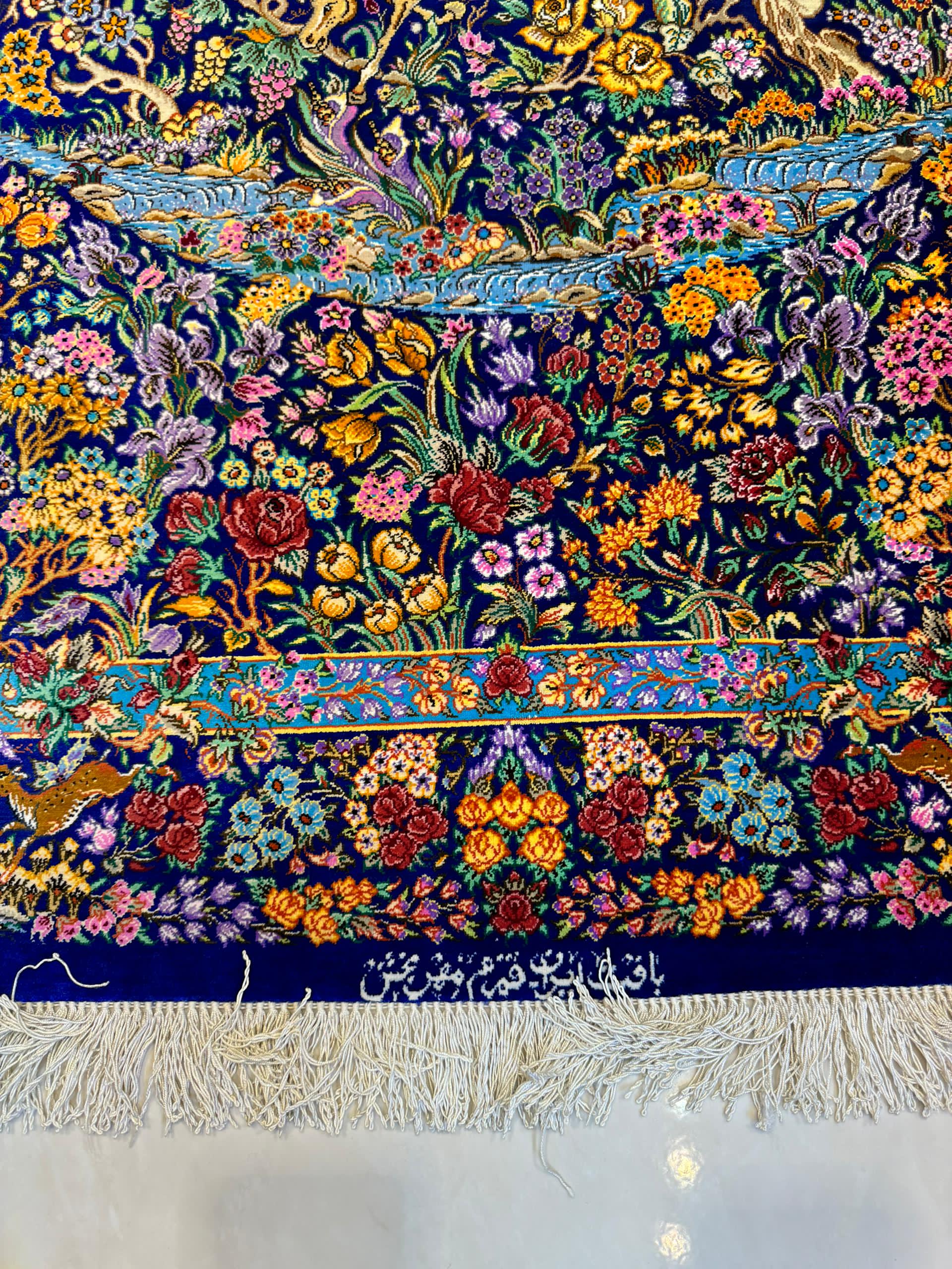 驚くような細かな織り目とビロードのような生地、肌に吸い付くようなシルクの艶やかな光沢感が豪華絢爛。まさに、「The ペルシャ絨毯」と言うべき最高峰のペルシャ絨毯は、もはや工芸品ではなく美術品としての価値となります。メフルバフ工房のサイン入り。シルクの絨毯は毛足の光沢が見る向きによってまったく趣の異なる色合いになりますので、敷く際は向きを調整してください。