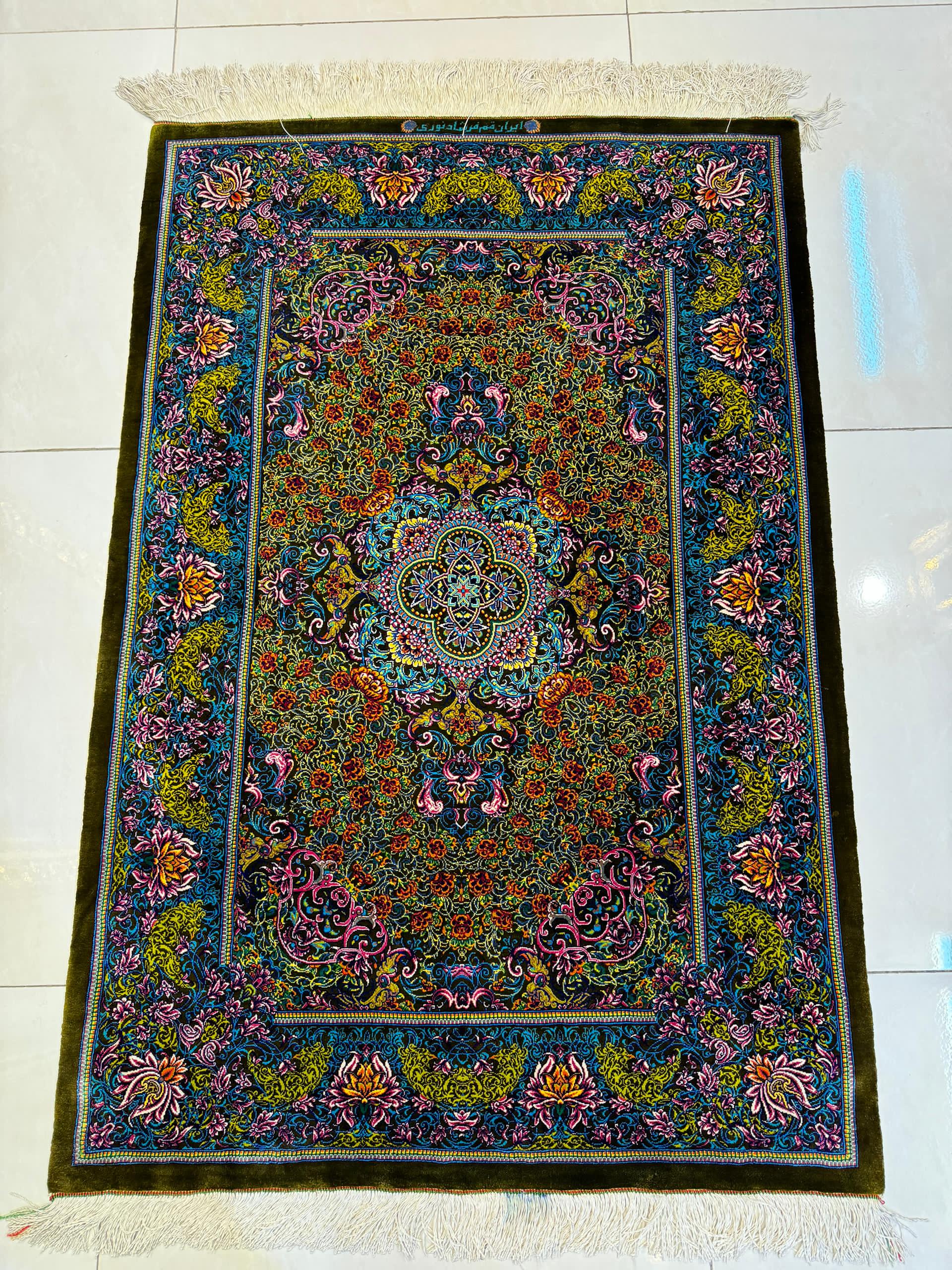 高級ペルシャ絨毯クム産シルク100% ノウリ工房 123×83cm(FN-10041)