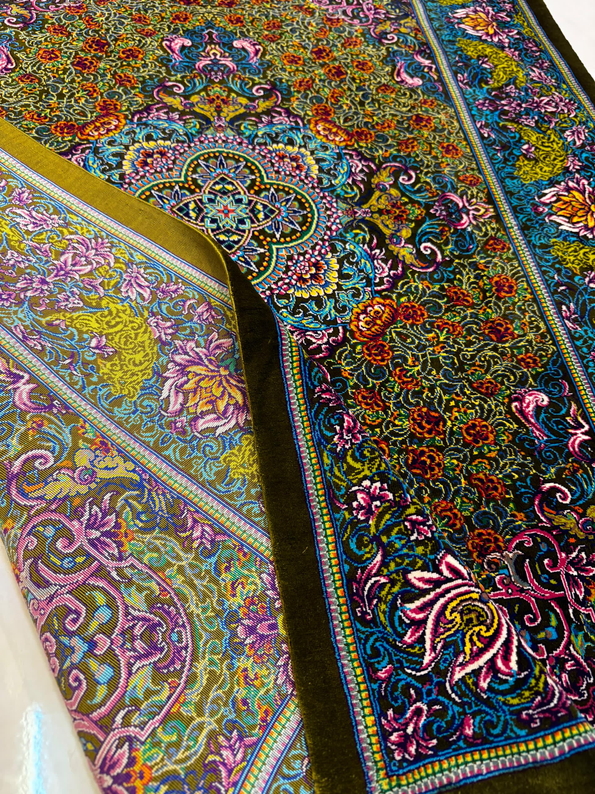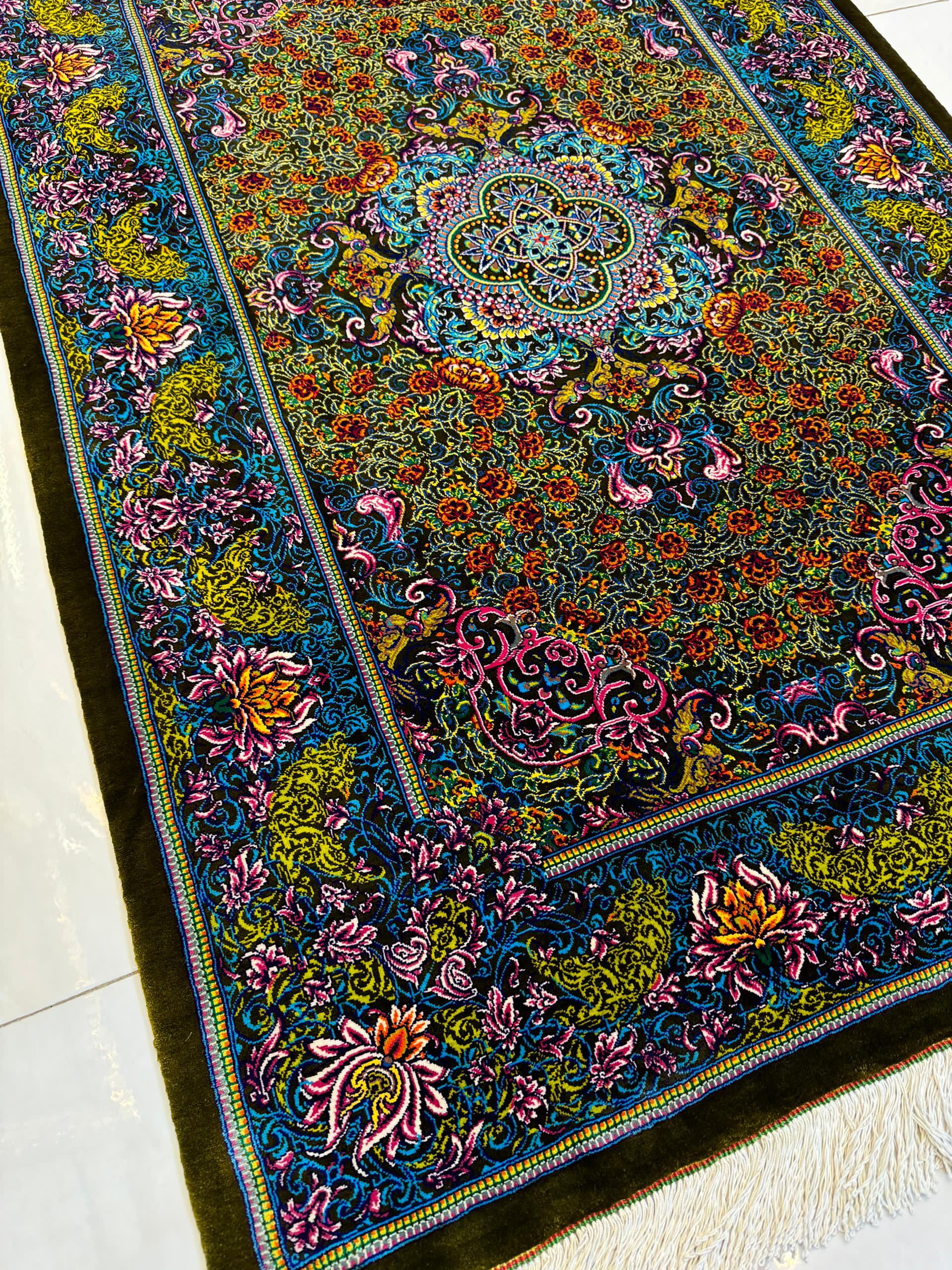 緑色を基調とし、伝統的な柄が織り込まれた豪華なデザイン。細部にまでこだわった華やかな模様が特徴で、リビングや寝室を一層引き立てるアイテムです。