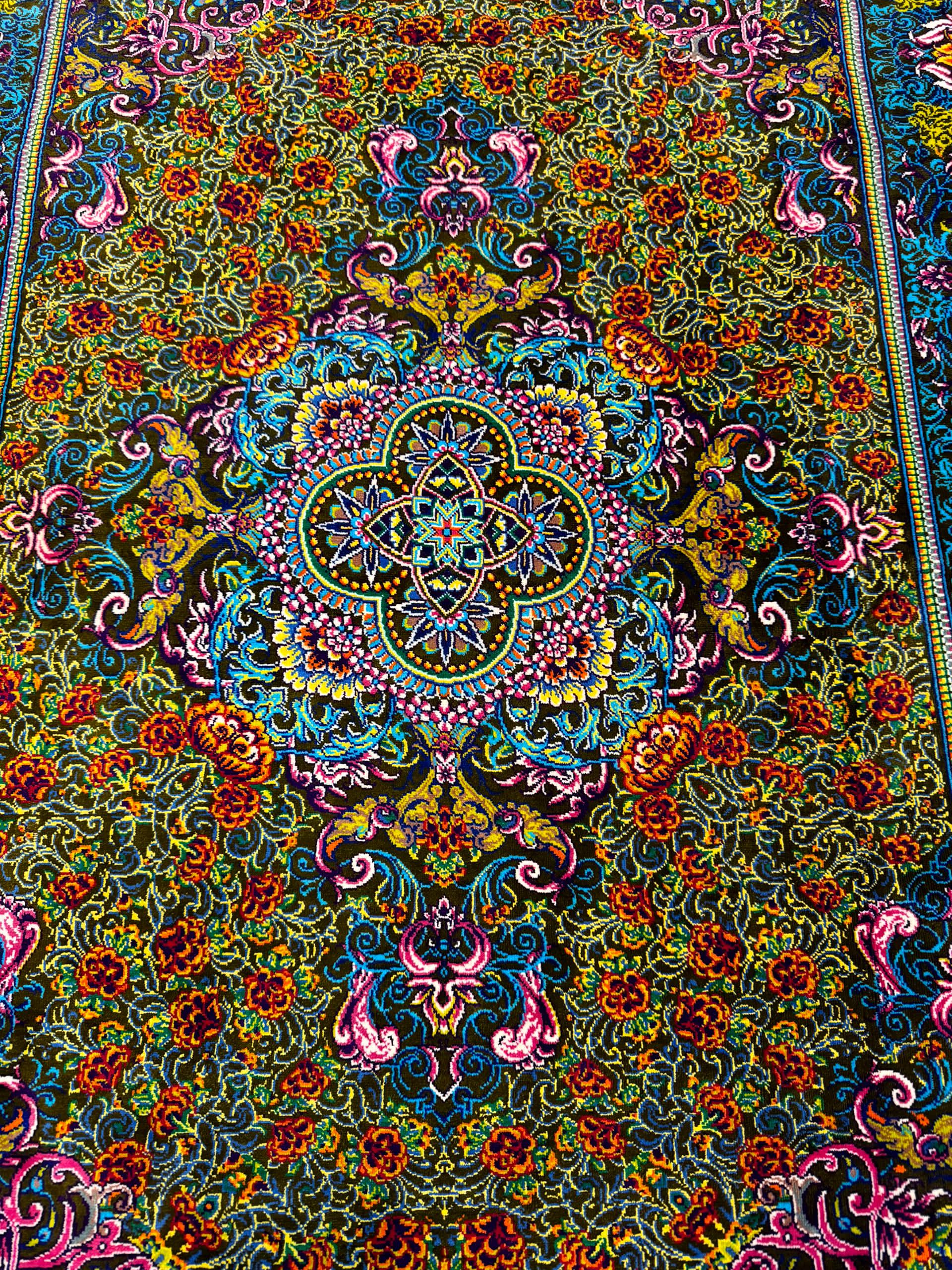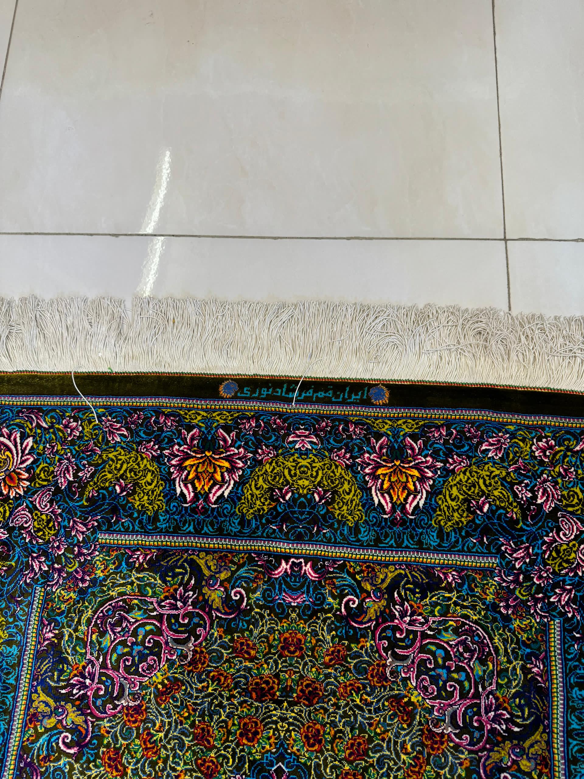 驚くような細かな織り目とビロードのような生地、肌に吸い付くようなシルクの艶やかな光沢感が豪華絢爛。まさに、「The ペルシャ絨毯」と言うべき最高峰のペルシャ絨毯は、もはや工芸品ではなく美術品としての価値となります。ノウリ工房のサイン入り。シルクの絨毯は毛足の光沢が見る向きによってまったく趣の異なる色合いになりますので、敷く際は向きを調整してください。