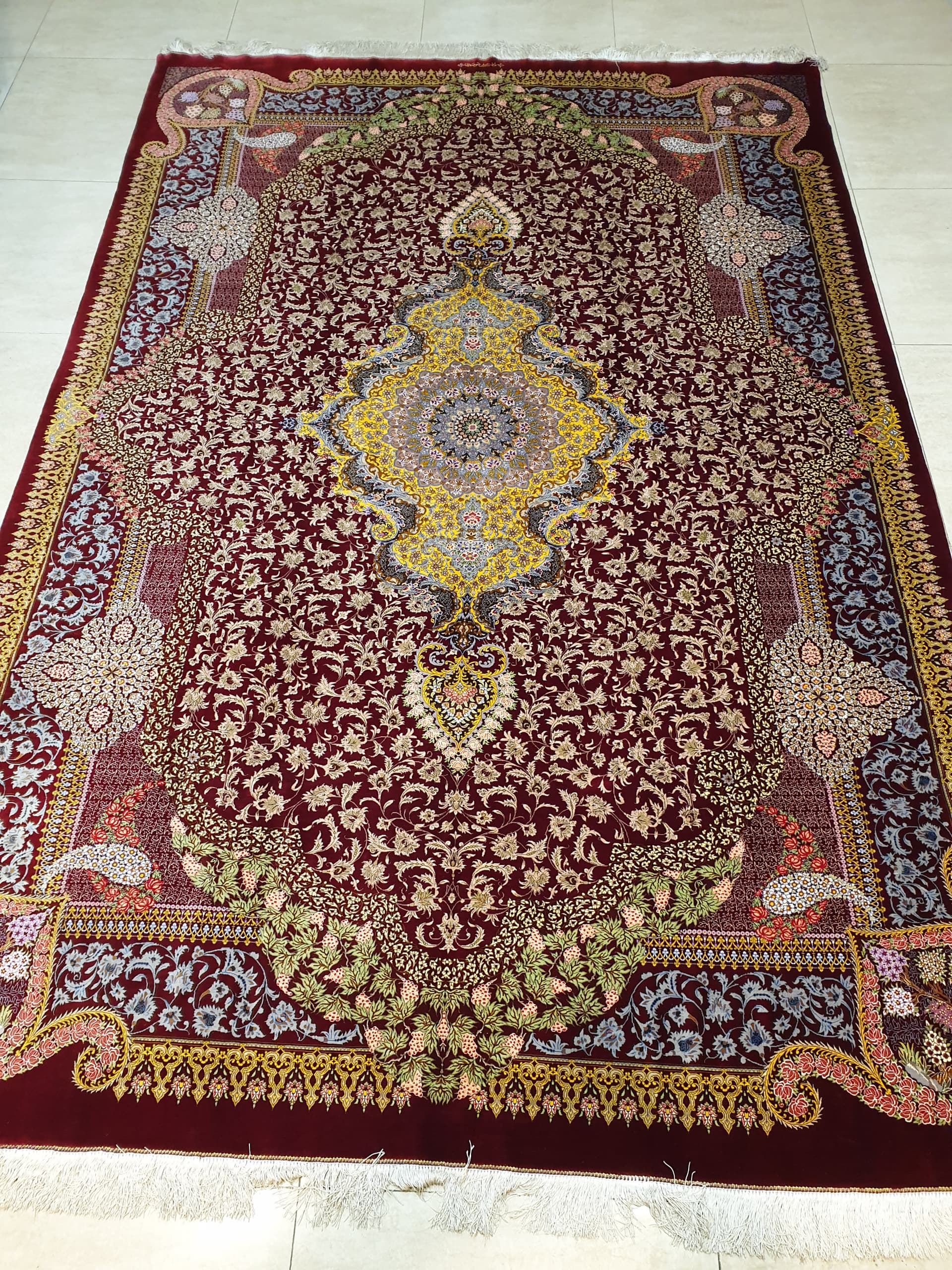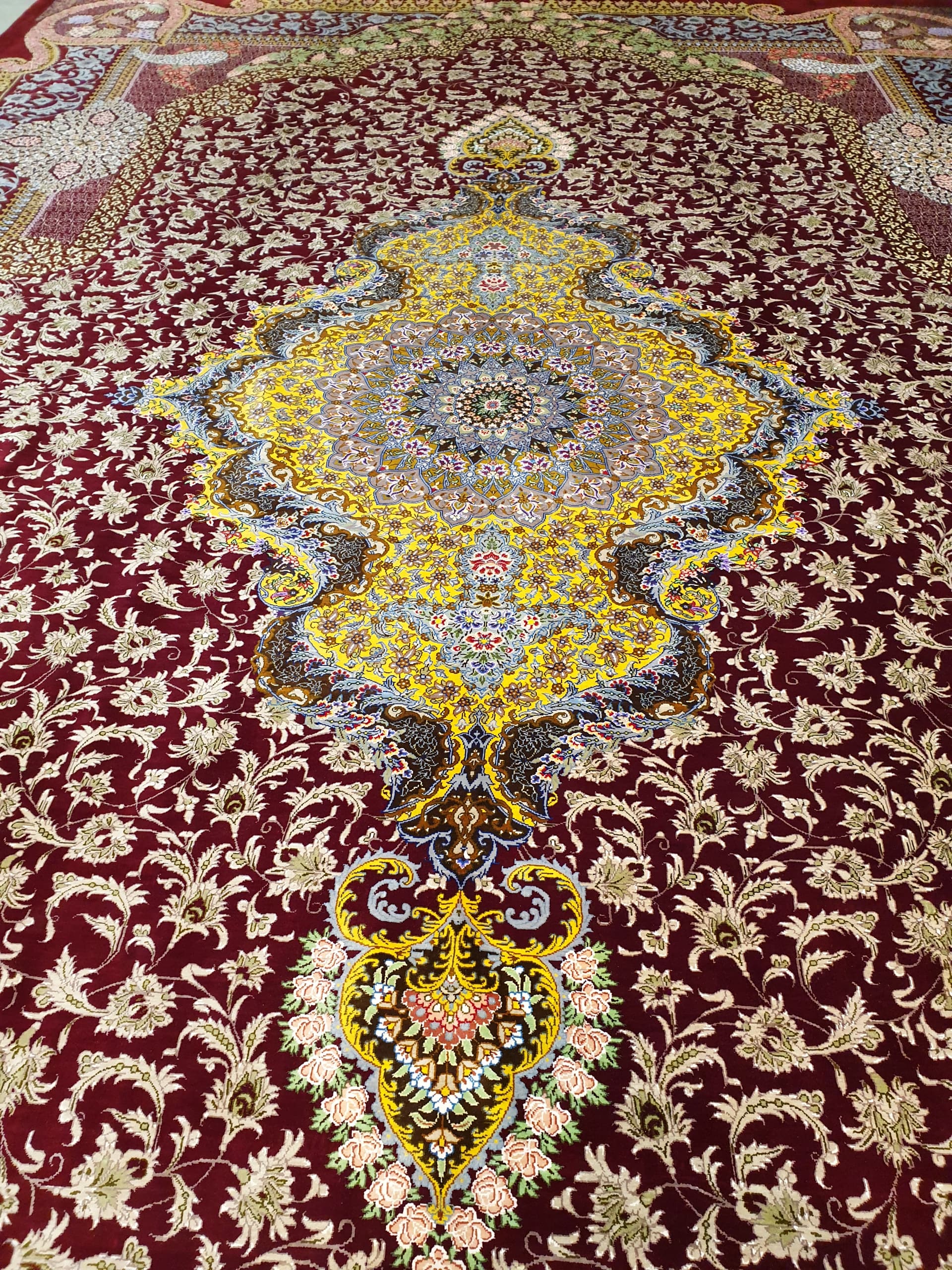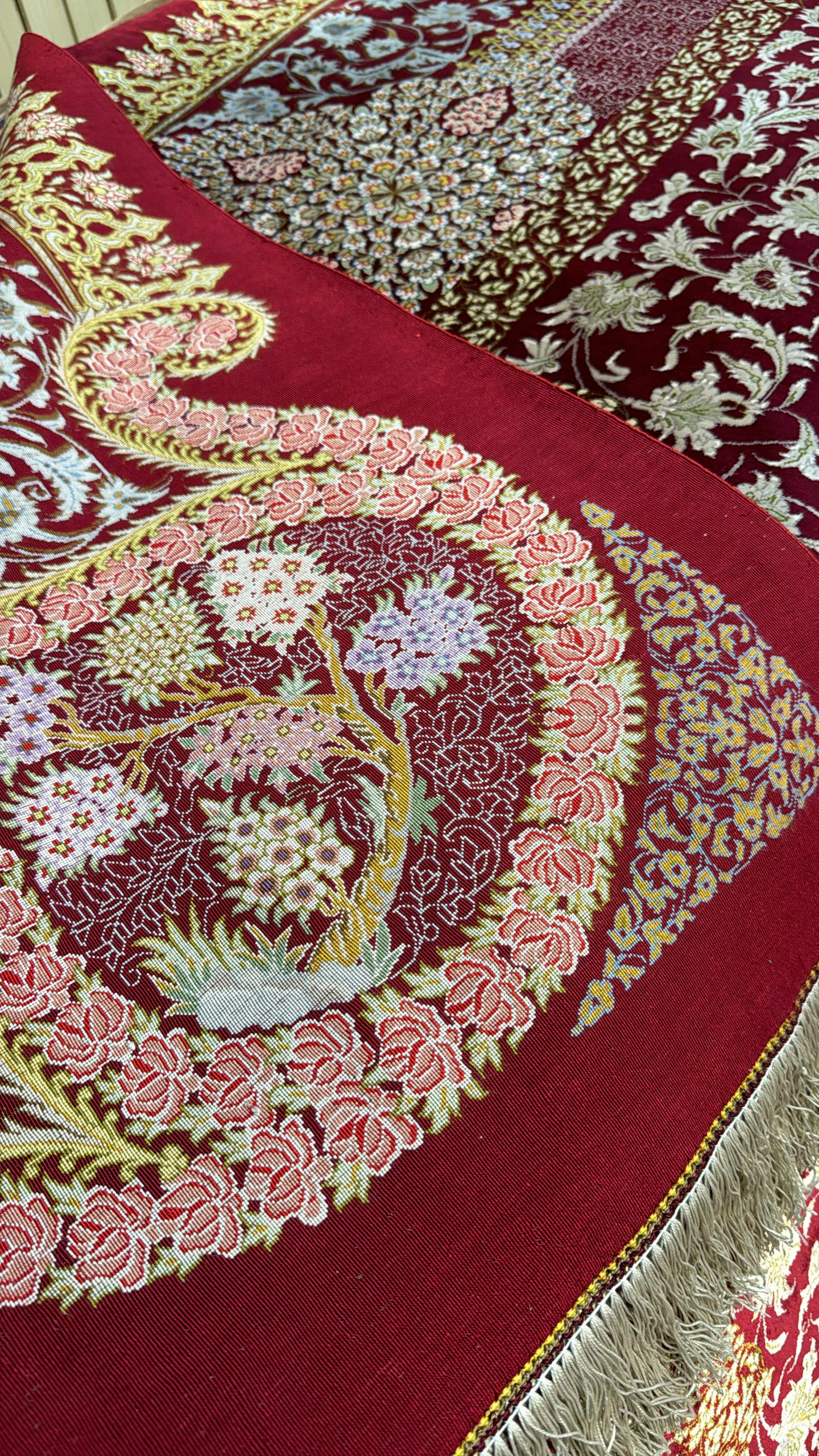 驚くような細かな織り目とビロードのような生地、肌に吸い付くようなシルクの艶やかな光沢感が豪華絢爛。まさに、「The ペルシャ絨毯」と言うべき最高峰のペルシャ絨毯は、もはや工芸品ではなく美術品としての価値となります。サマディ工房のサイン入り。シルクの絨毯は毛足の光沢が見る向きによってまったく趣の異なる色合いになりますので、敷く際は向きを調整してください。