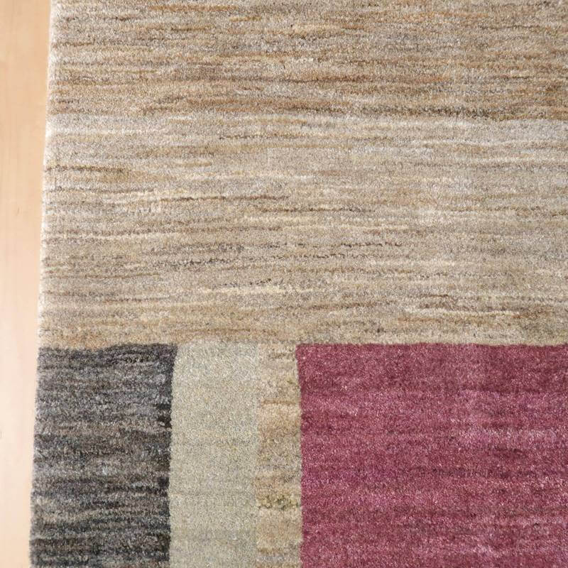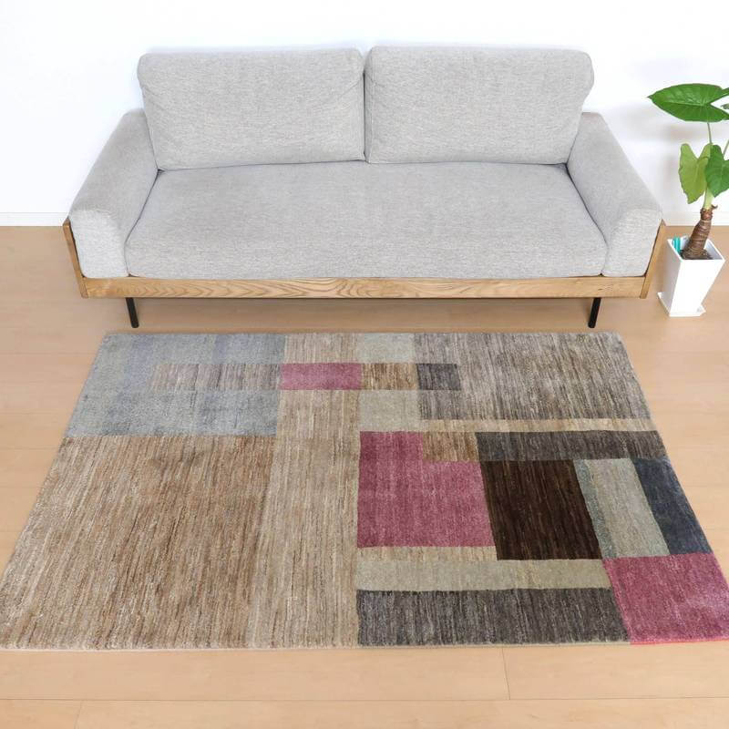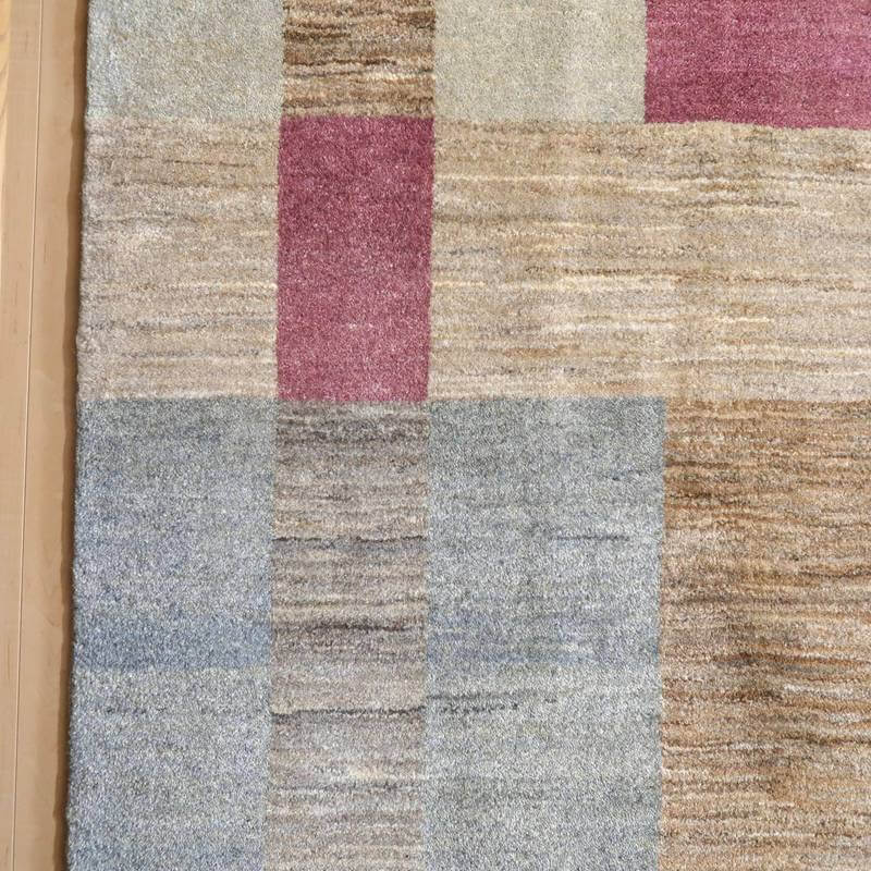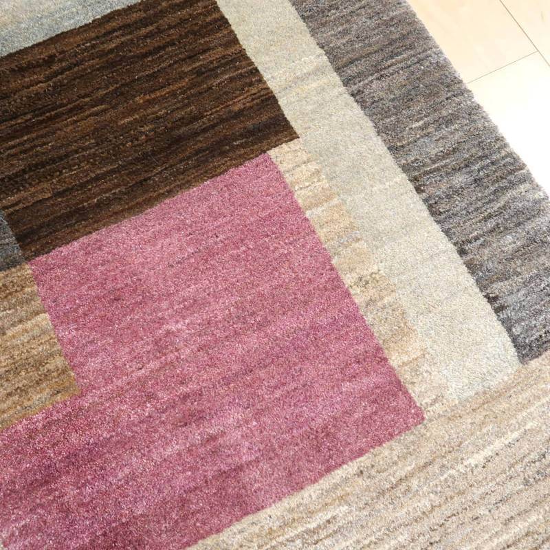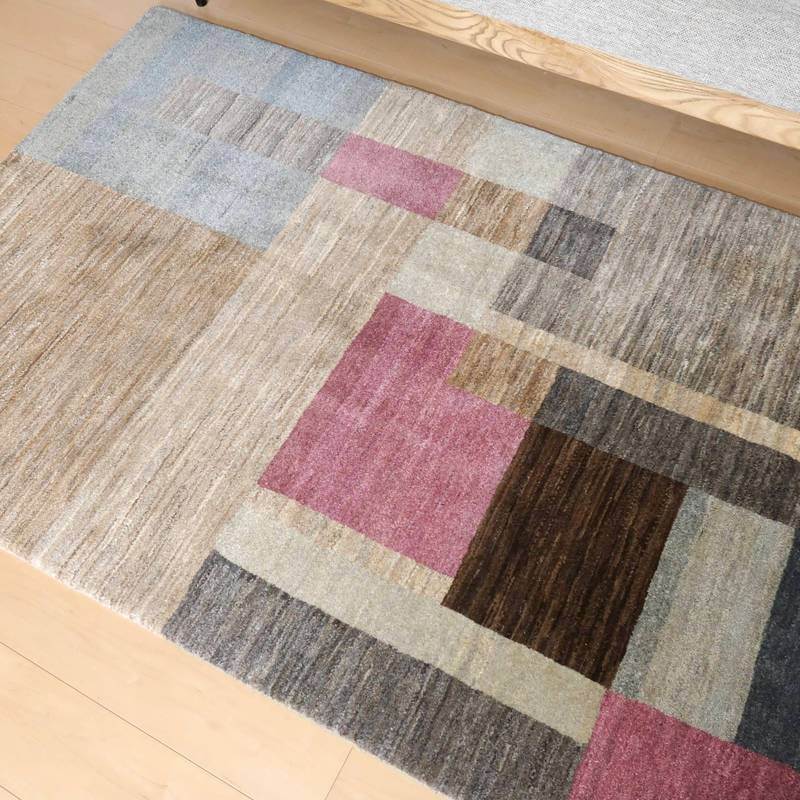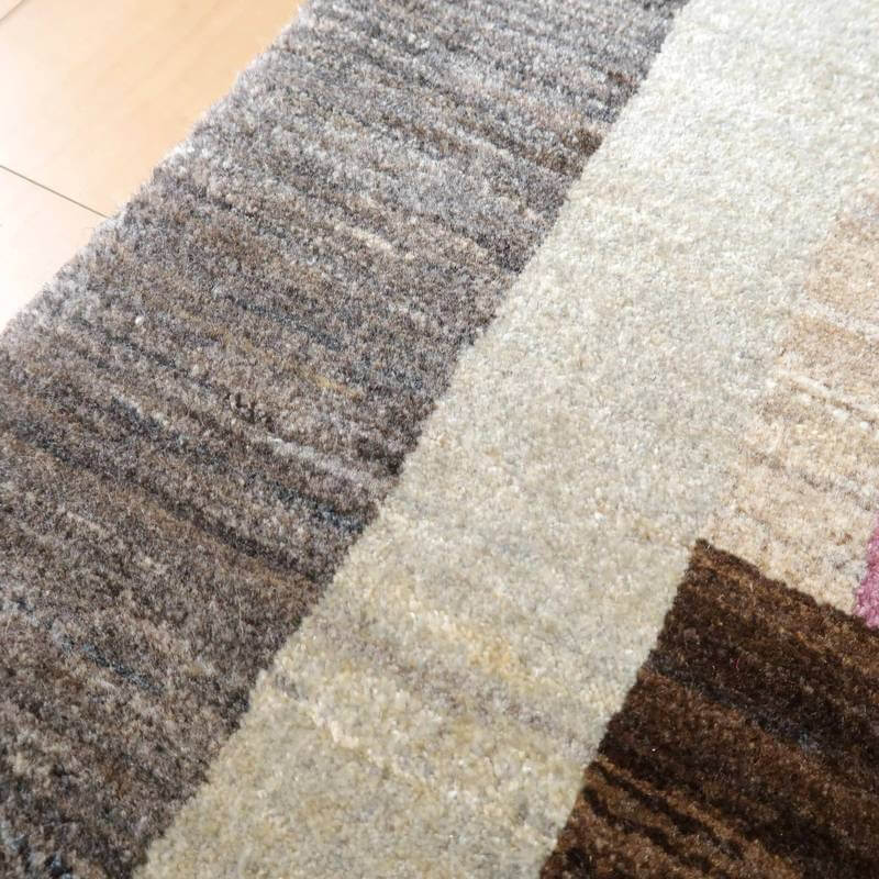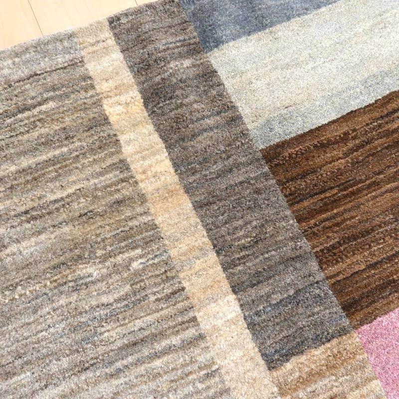 生成り、ベージュ、グレー、こげ茶部分は刈り取った羊の毛を染めずにそのままの原毛の色合いを活かしています。ブルーグレーとパープルはスモーキーな、くすみカラーで統一感のある落ち着いた色合いの美しさを堪能できます。暖かみのある木のインテリアでもモダンな空間でも馴染むスタイリッシュなアートデザインのギャッベ。冬毛の柔らかな最高部位のウールのみを使用して細かく編んだ最上級のソフトな手触りです。