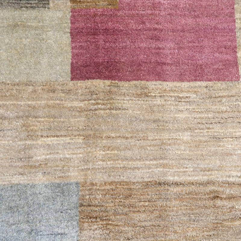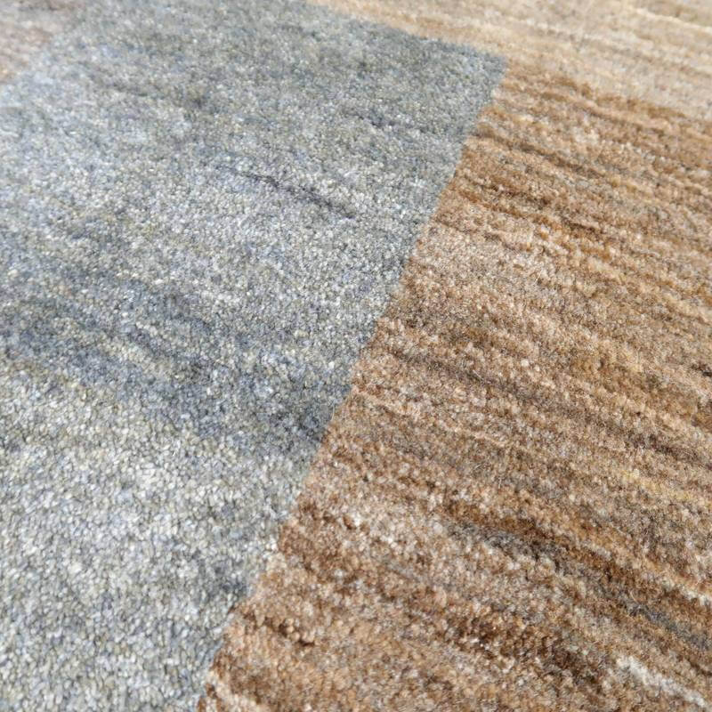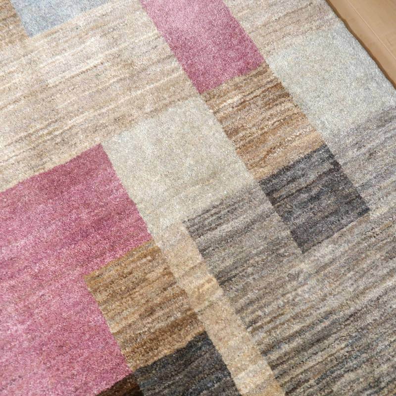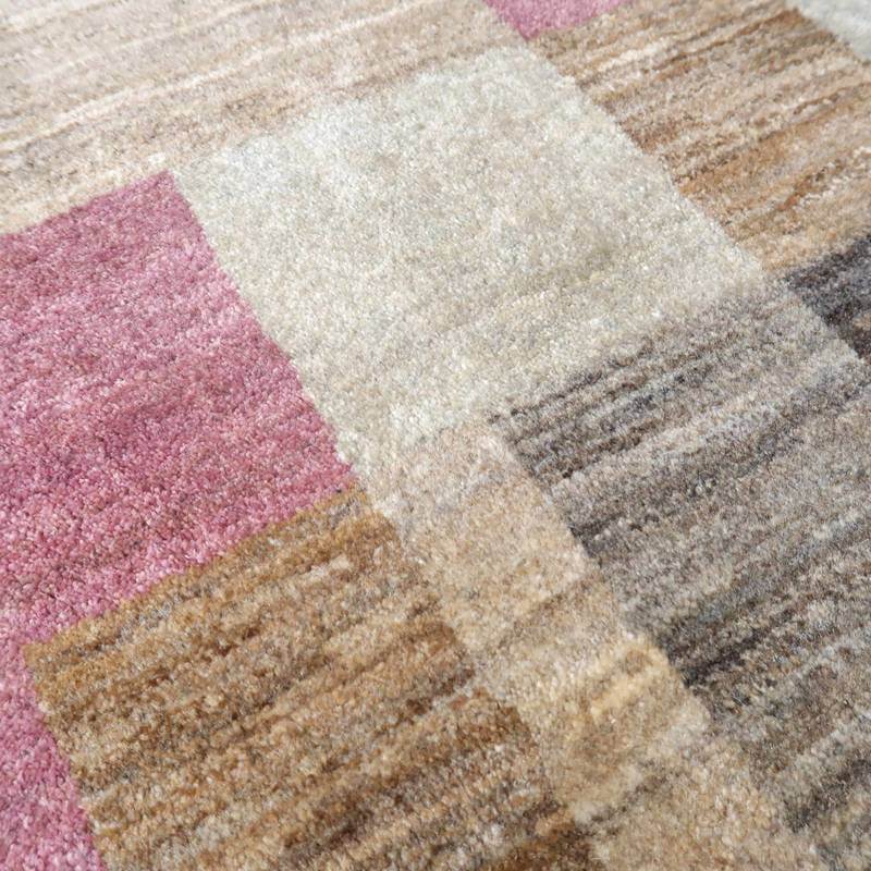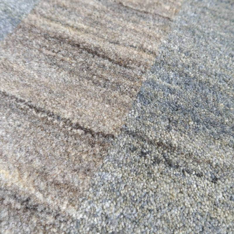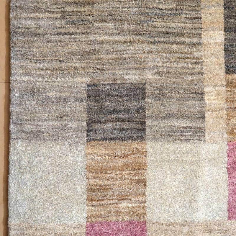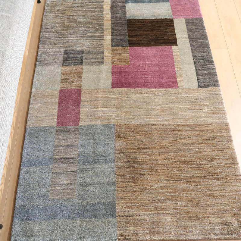 生成り、ベージュ、グレー、こげ茶部分は刈り取った羊の毛を染めずにそのままの原毛の色合いを活かしています。ブルーグレーとパープルはスモーキーな、くすみカラーで統一感のある落ち着いた色合いの美しさを堪能できます。暖かみのある木のインテリアでもモダンな空間でも馴染むスタイリッシュなアートデザインのギャッベ。冬毛の柔らかな最高部位のウールのみを使用して細かく編んだ最上級のソフトな手触りです。