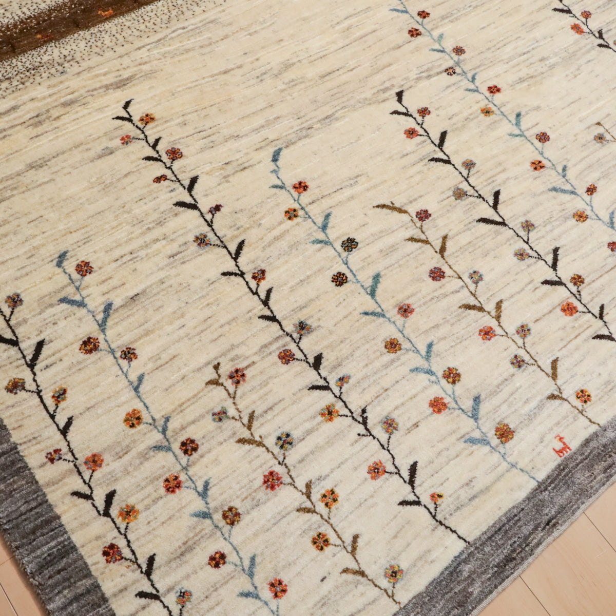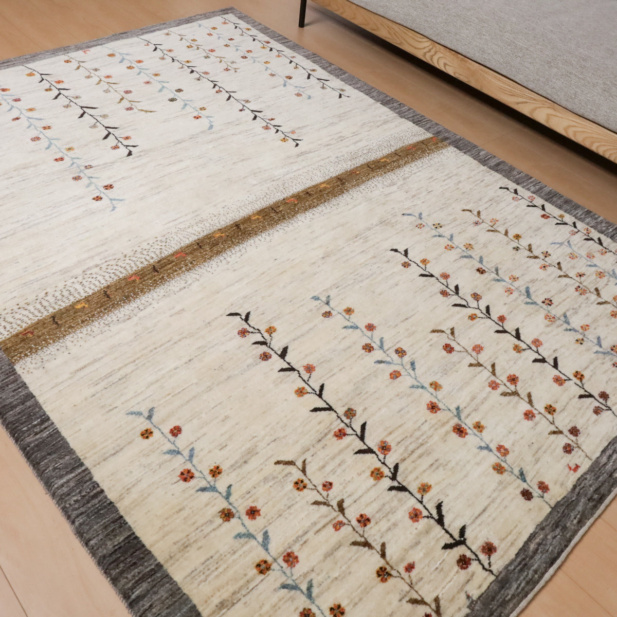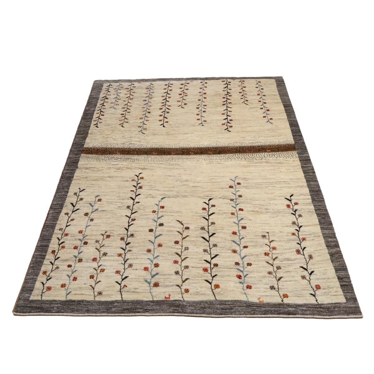 羊の毛色を生かした生成りを基調に繊細な花と蔦のモチーフが描かれた、落ち着いた雰囲気のギャッベです。中央には茶色の縦帯が印象的にデザインされ、その中には細やかな動物のモチーフも描かれています。お部屋に自然の優雅さと穏やかな雰囲気をもたらし、上品な彩りを添えます。シンプルでありながら、繊細なディテールが魅力的な一枚です。