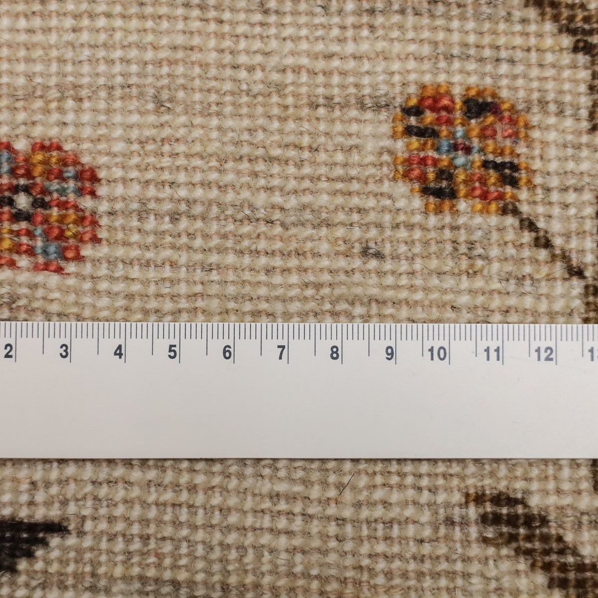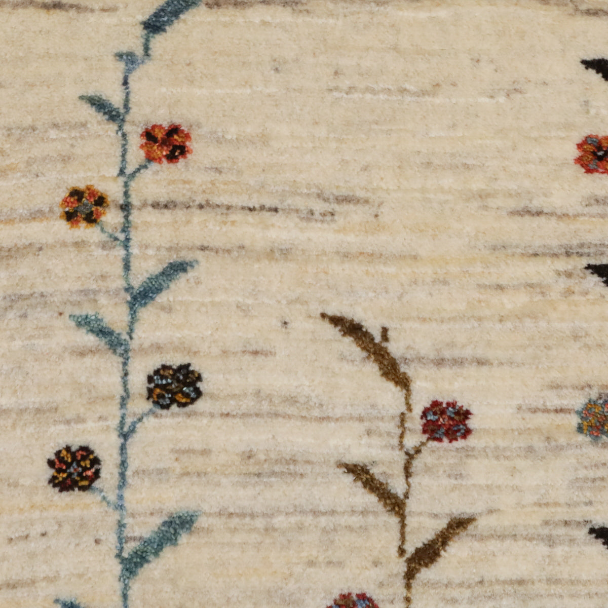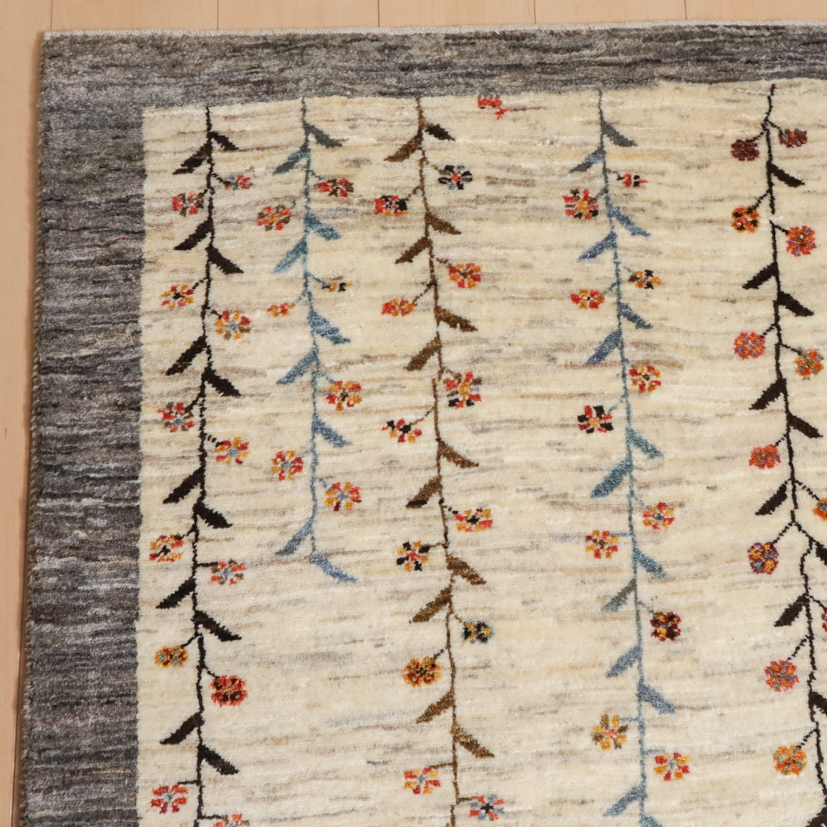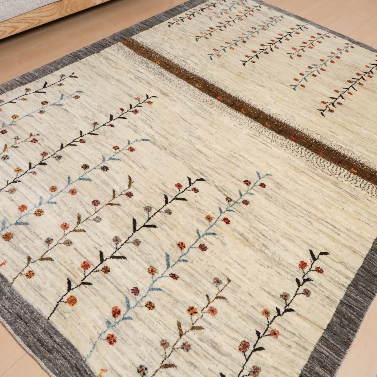 羊の毛色を生かした生成りを基調に繊細な花と蔦のモチーフが描かれた、落ち着いた雰囲気のギャッベです。中央には茶色の縦帯が印象的にデザインされ、その中には細やかな動物のモチーフも描かれています。お部屋に自然の優雅さと穏やかな雰囲気をもたらし、上品な彩りを添えます。シンプルでありながら、繊細なディテールが魅力的な一枚です。