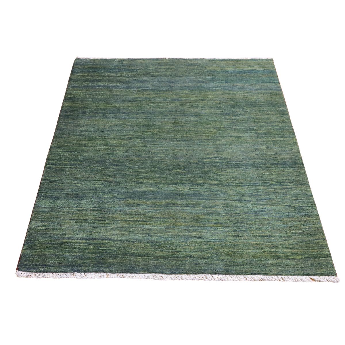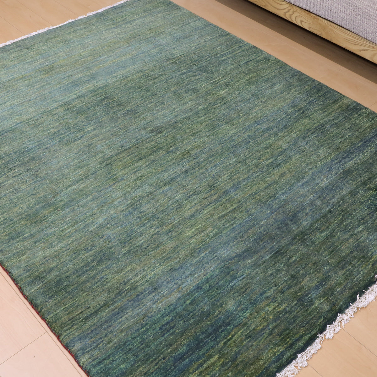 落ち着きのある濃いめのグリーンは、茶色や黄緑、青緑などの何種類もの緑が細かく重なりあったアブラシ(色のグラデーション)と呼ばれる色の揺らぎが全体に見られ、イランのギャッベならではの美しい色合いを楽しめます。シンプルな無地デザインだからこそ、自然の緑の癒しを感じさせてくれるお品です。