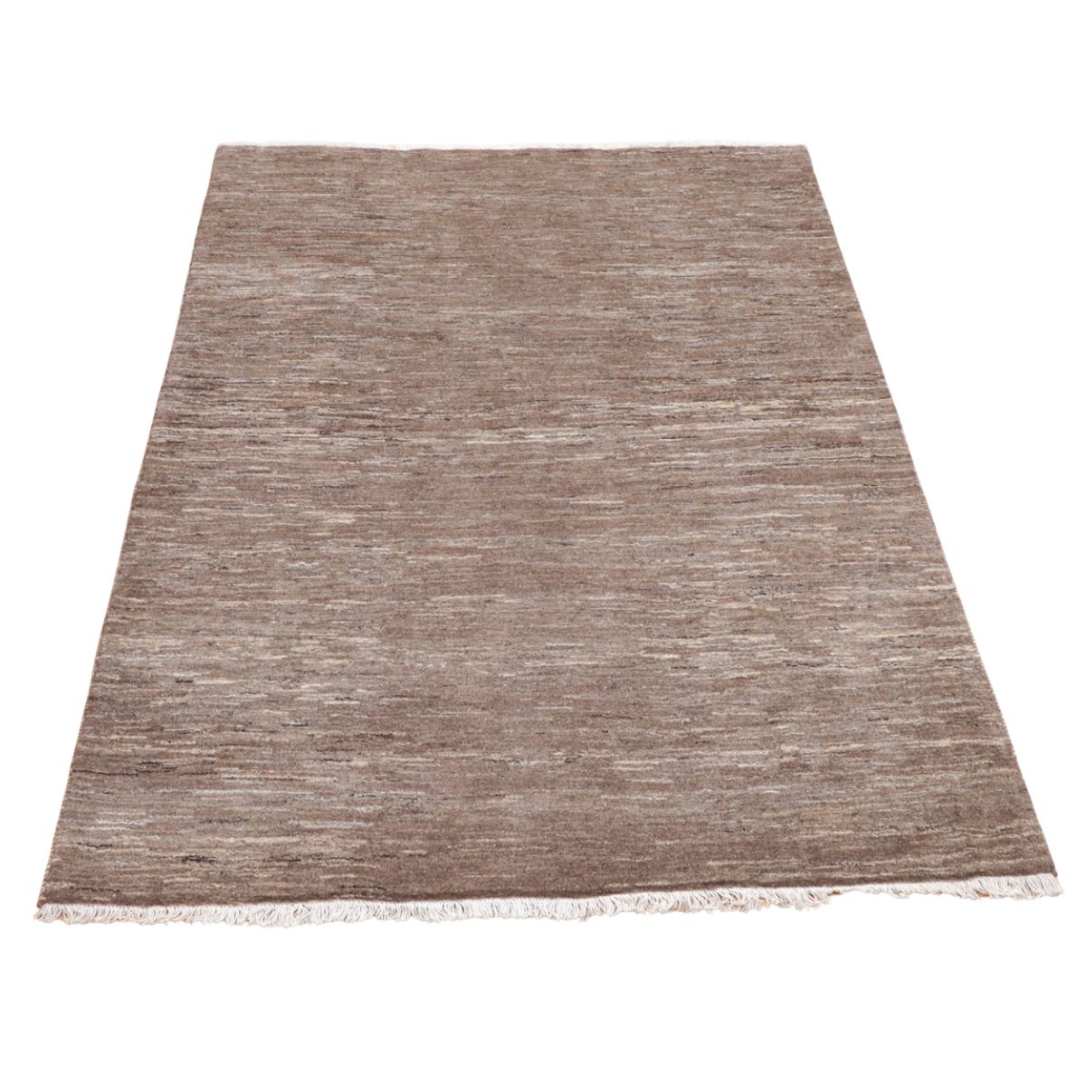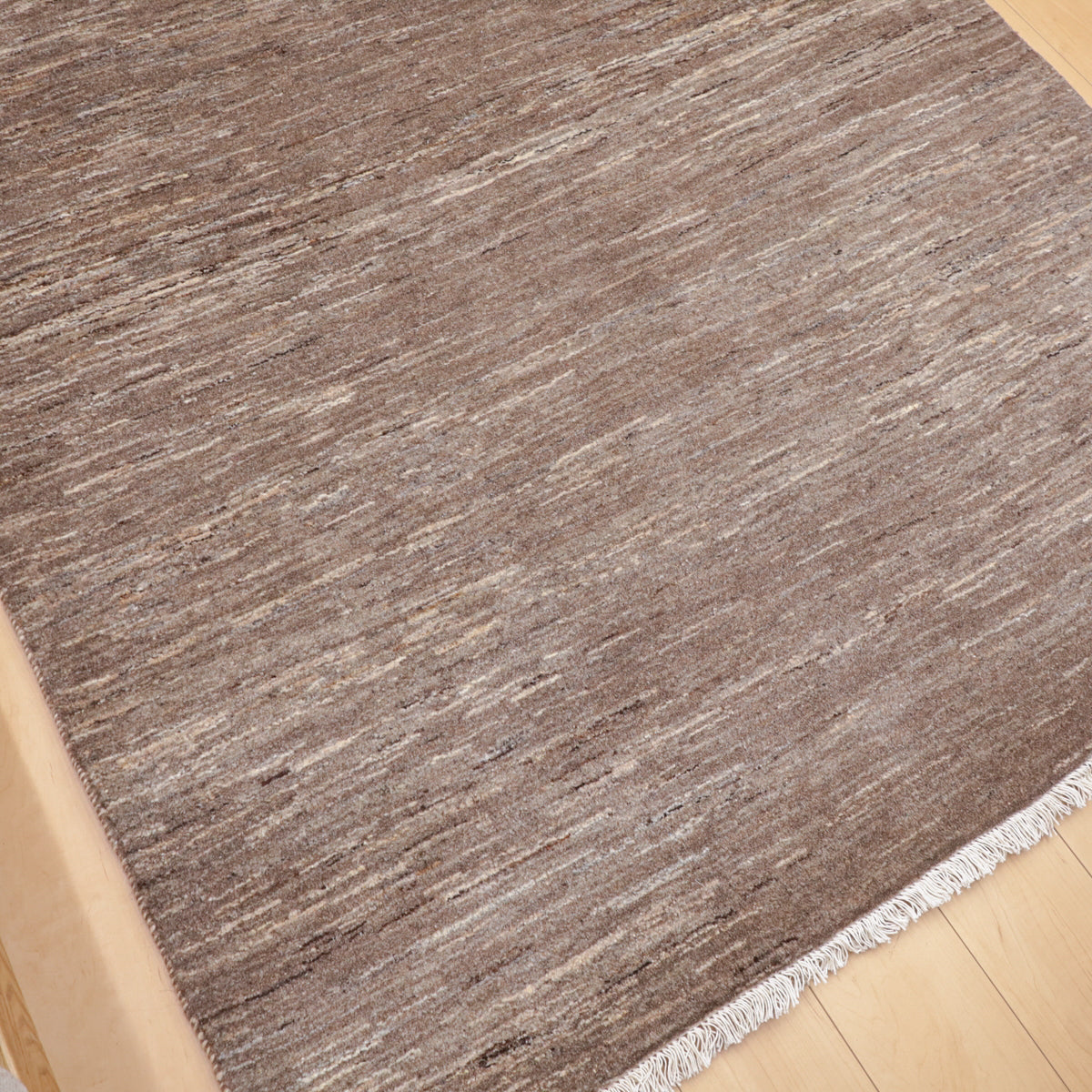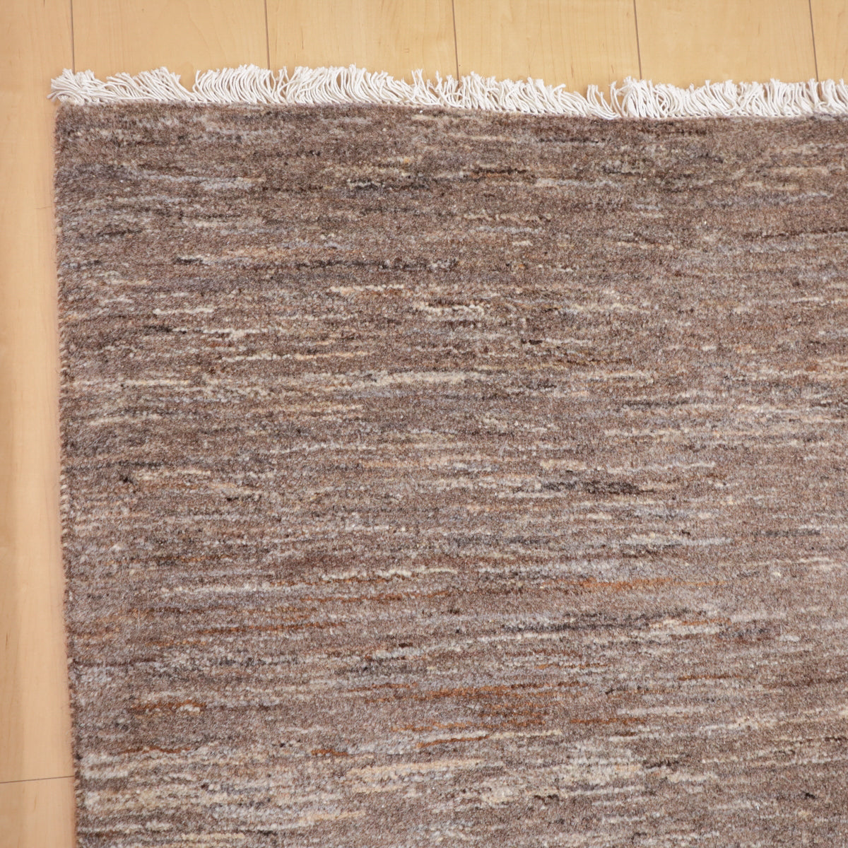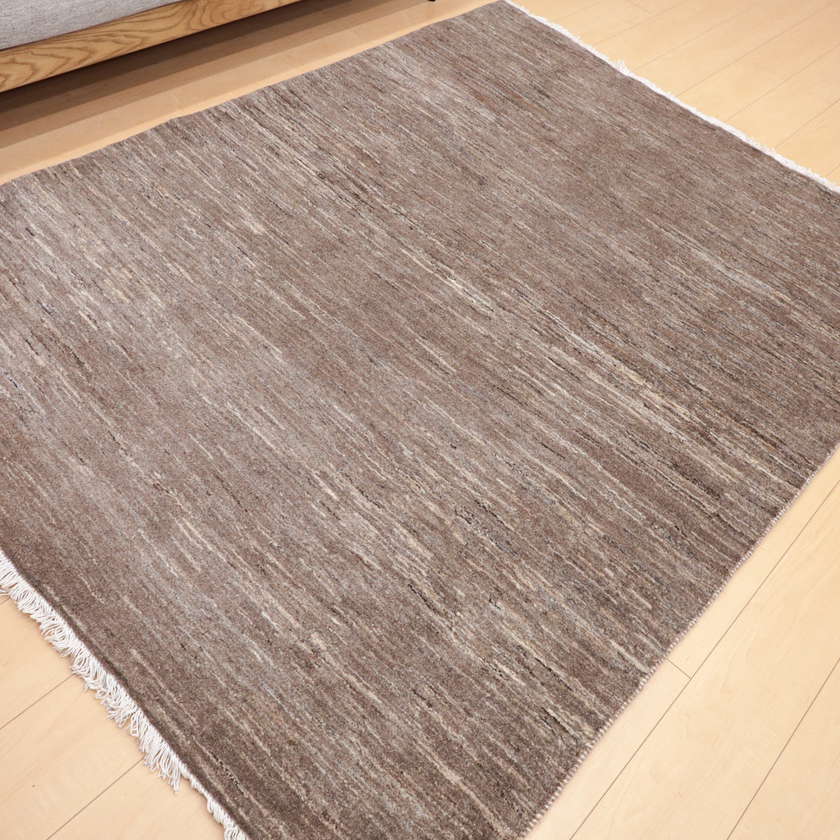 濃いめのグレーのシンプルな無地デザイン。赤みのある照明ではベージュっぽく見えるようなカラーです。細かなアブラシ(色のグラデーション)が全体に入って、イランのギャッベならではの美しい色の揺らぎを楽しむようなお品です。