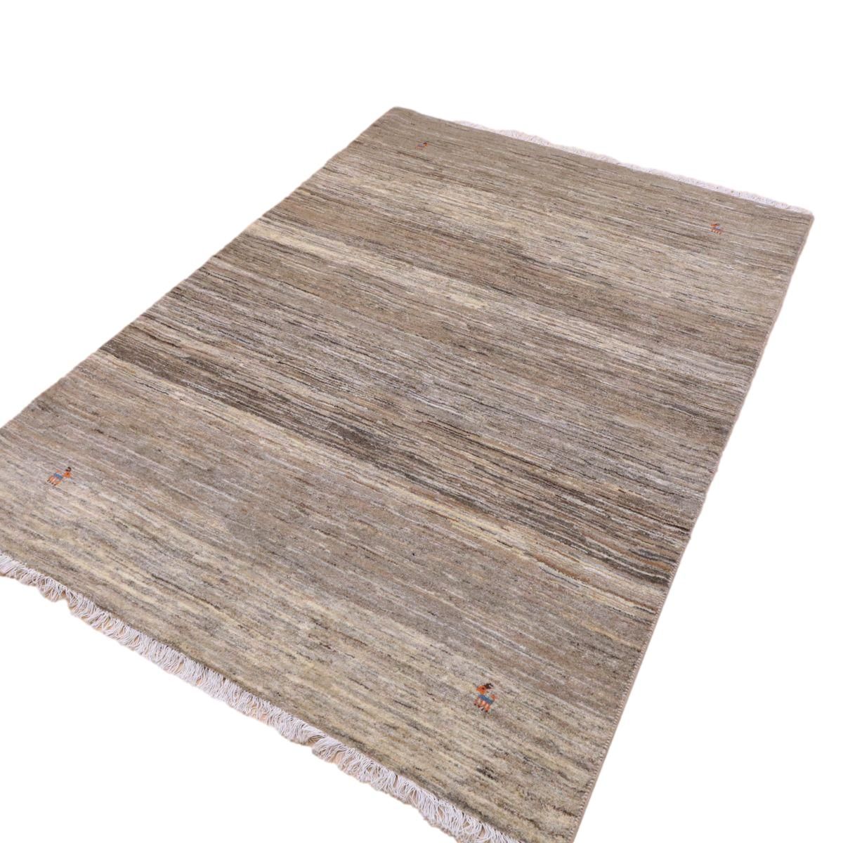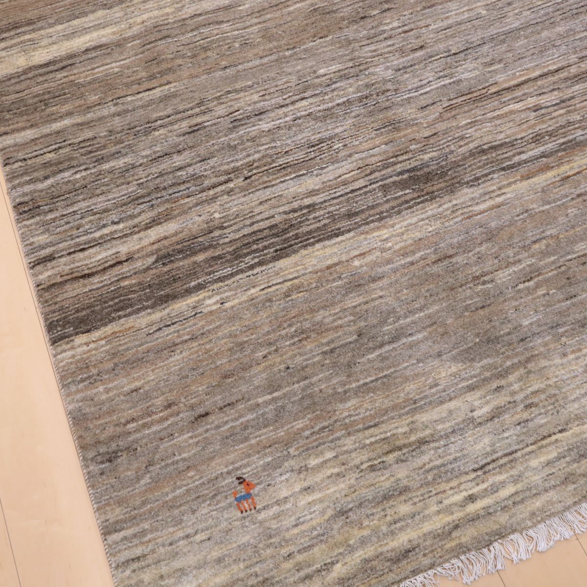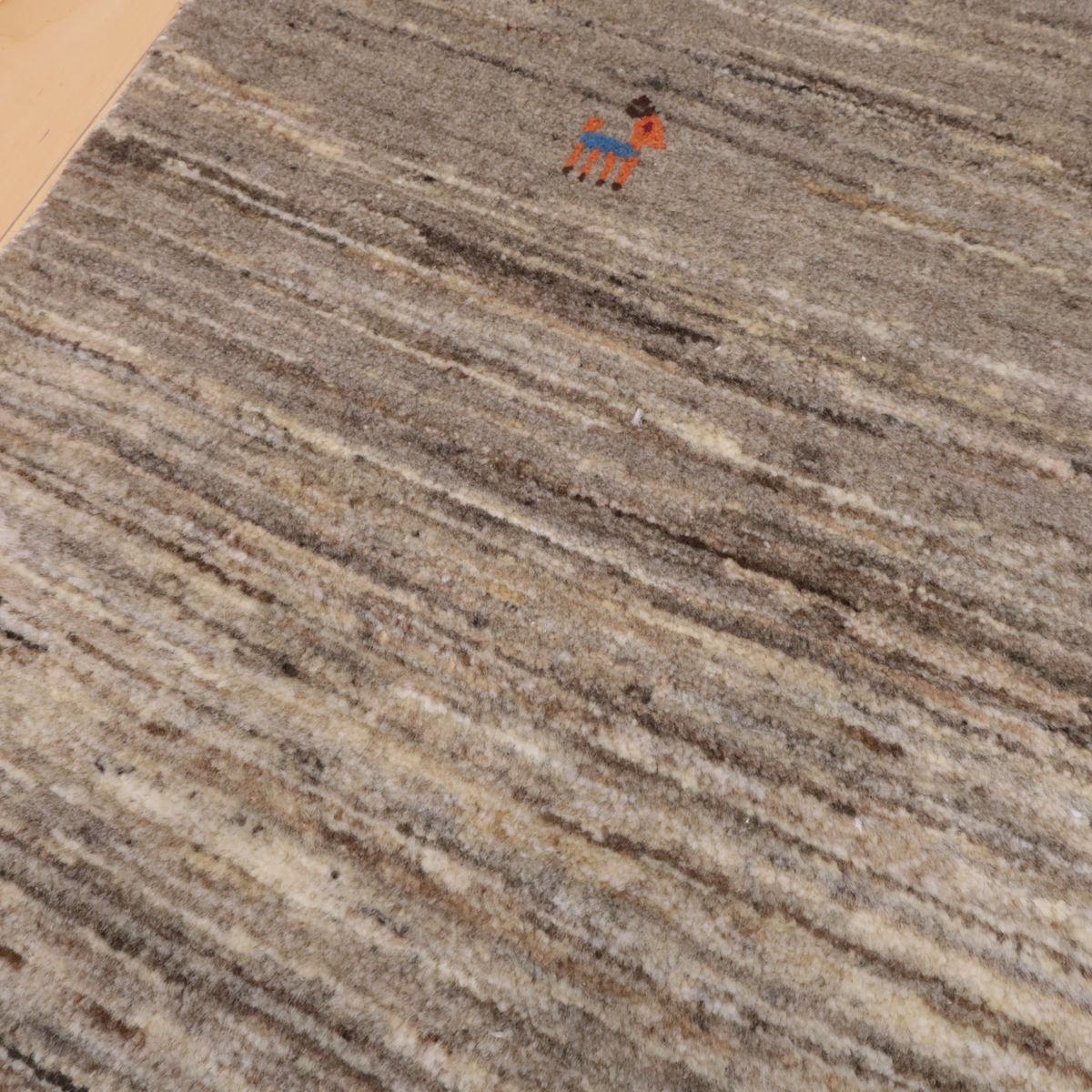 羊の毛色をそのまま活かした無染色の羊色のベースは、どんな場所にも似合うナチュラルな風合い。薄いグレーやベージュのグラデーションがやんわり入った、シンプルなデザインのギャッベです。