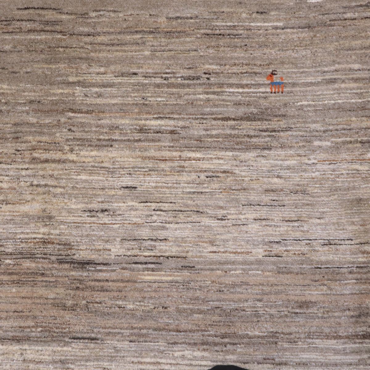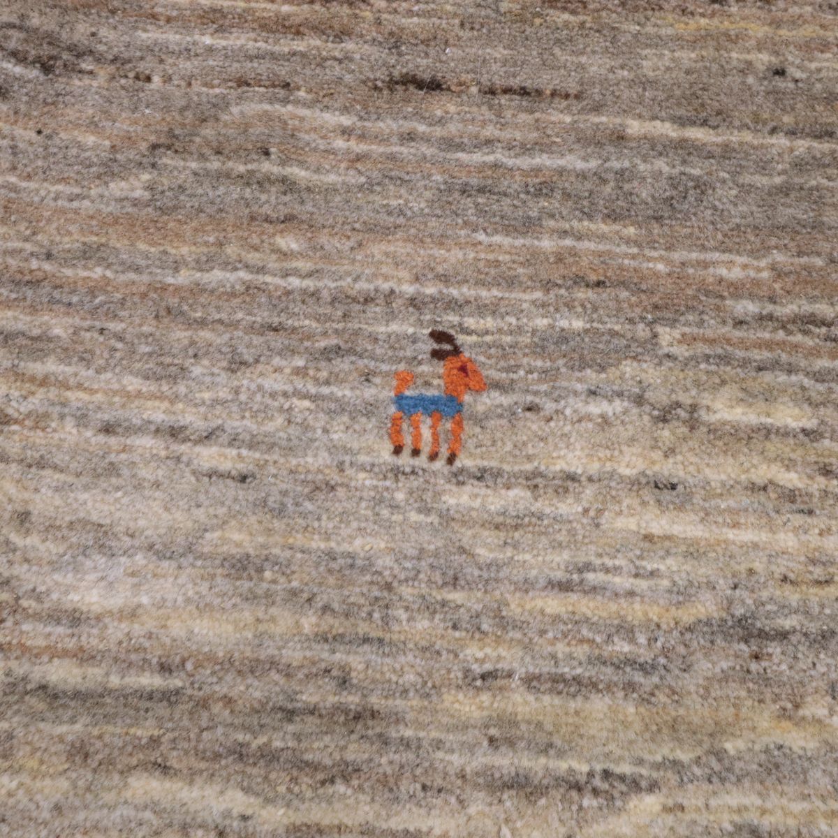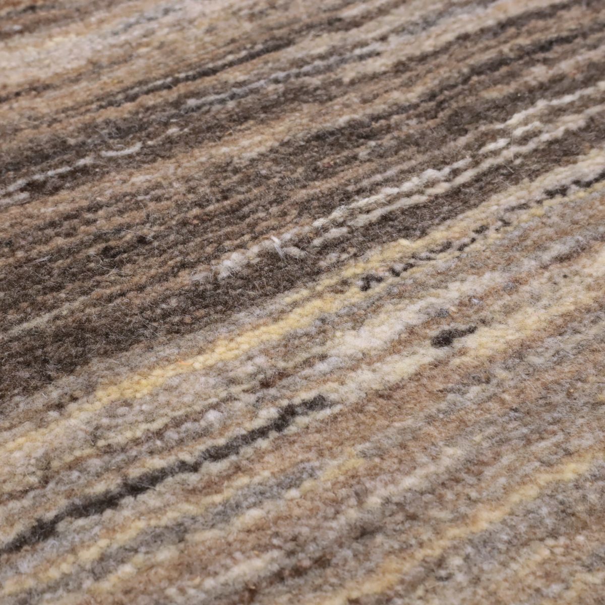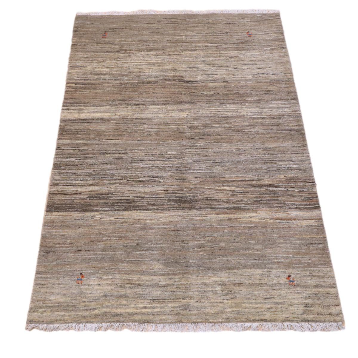 羊の毛色をそのまま活かした無染色の羊色のベースは、どんな場所にも似合うナチュラルな風合い。薄いグレーやベージュのグラデーションがやんわり入った、シンプルなデザインのギャッベです。
