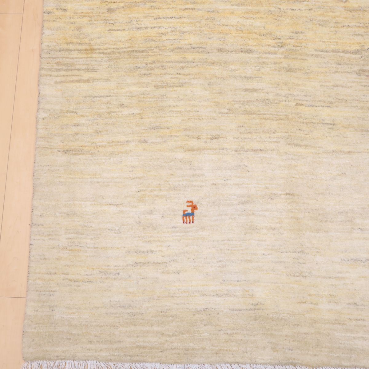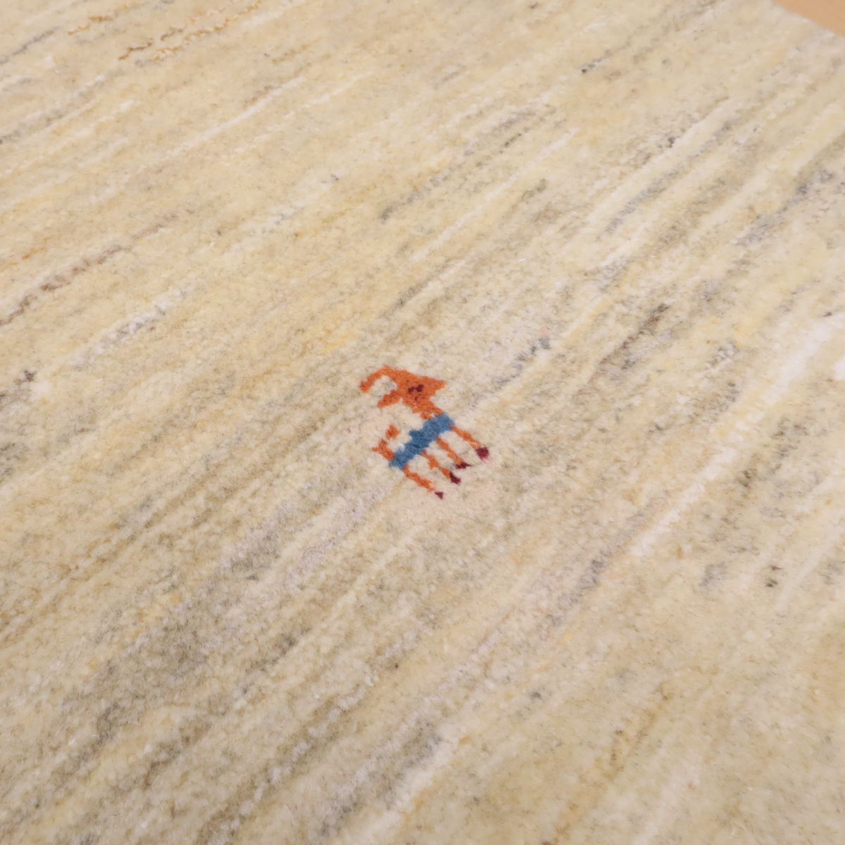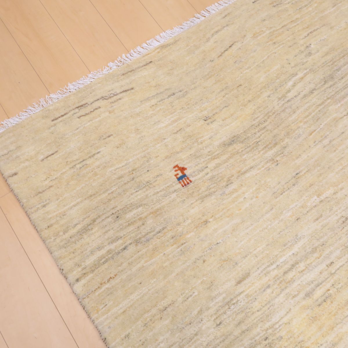 羊の毛色をそのまま活かした無染色の羊色のベースは、どんな場所にも似合うナチュラルな風合い。薄いグレーやベージュのグラデーションがやんわり入った、シンプルなデザインのギャッベです。
