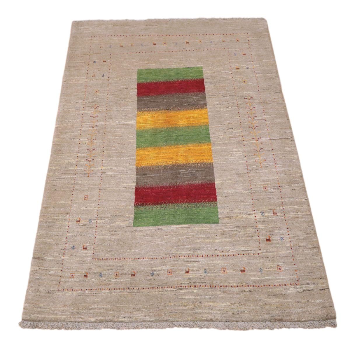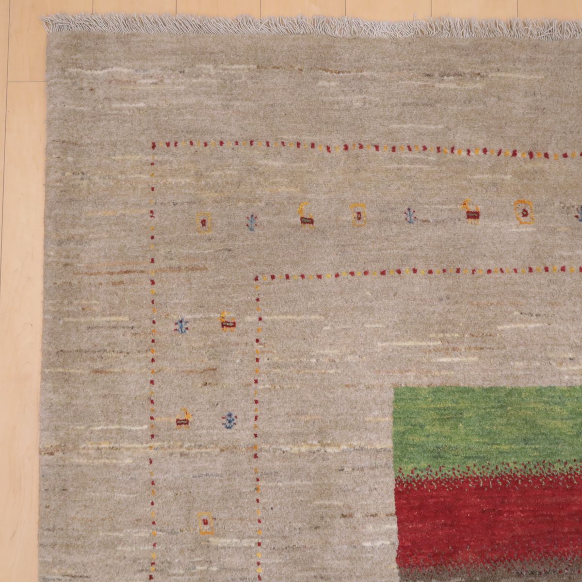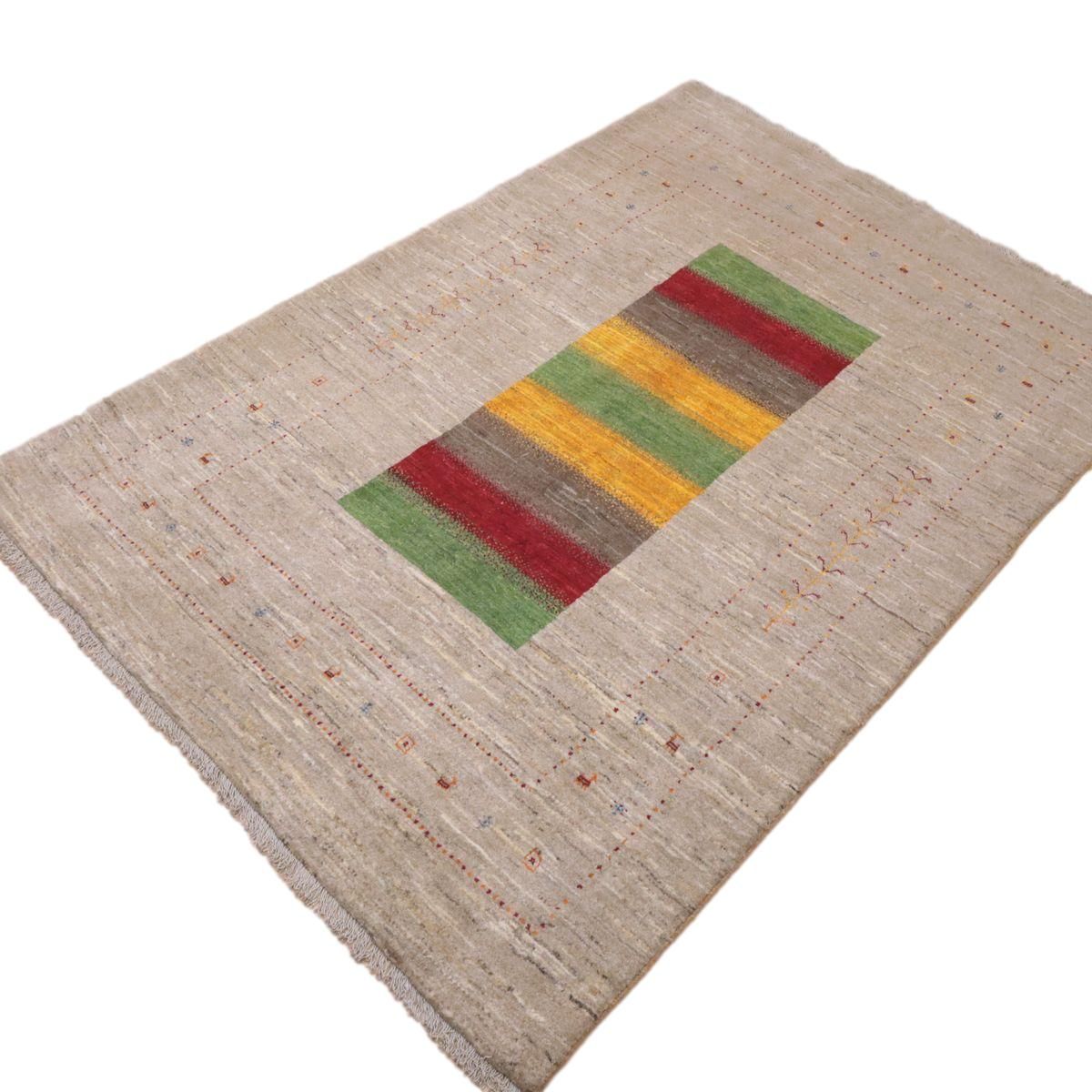 羊の毛色をそのまま活かした無染色の羊色のベースは、どんな場所にも似合うナチュラルな風合い。薄いグレーやベージュのグラデーションがやんわり入った、シンプルなデザインのギャッベです。