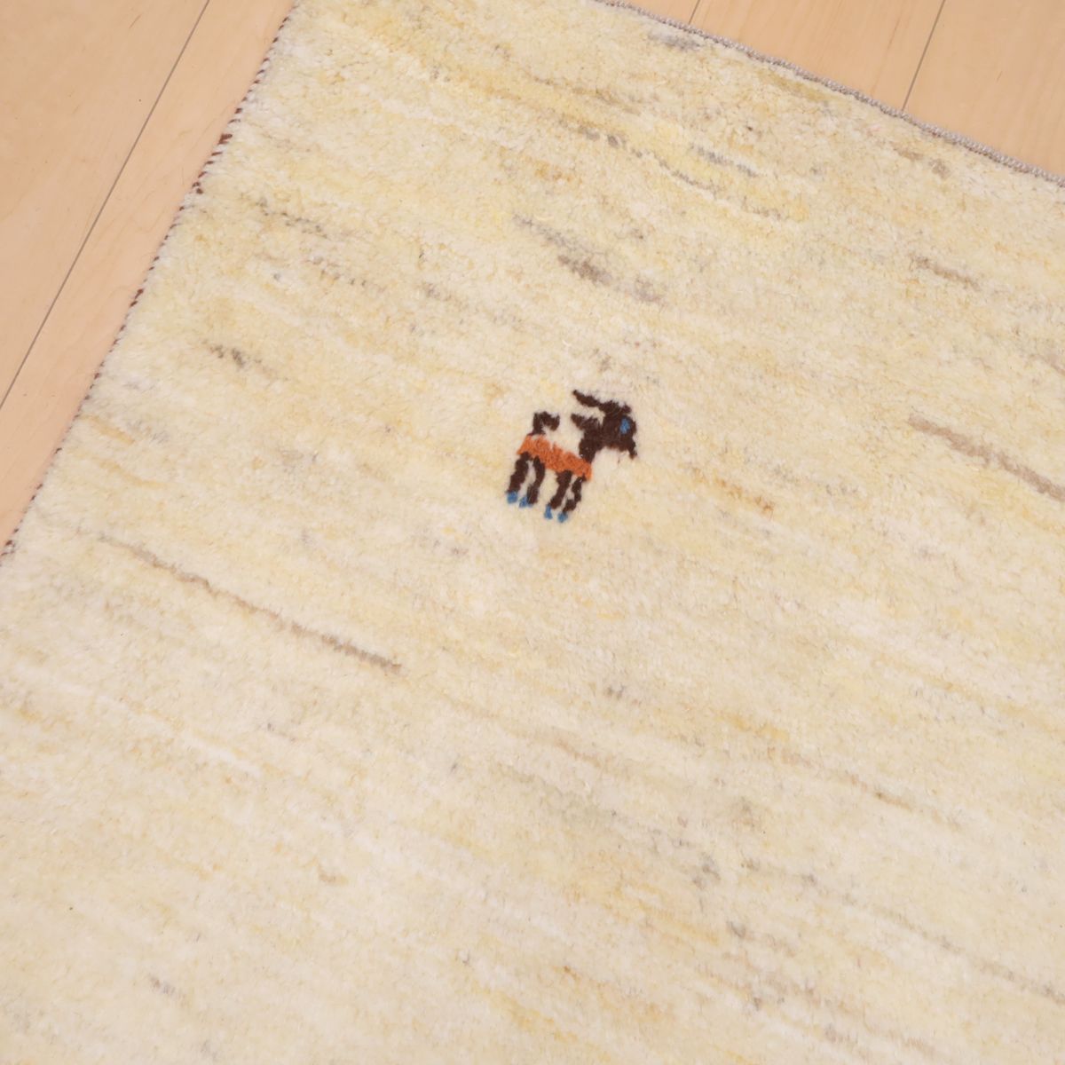 羊の毛色をそのまま活かした無染色の羊色のベースは、どんな場所にも似合うナチュラルな風合い。薄いグレーやベージュのグラデーションがやんわり入った、シンプルなデザインのギャッベです。