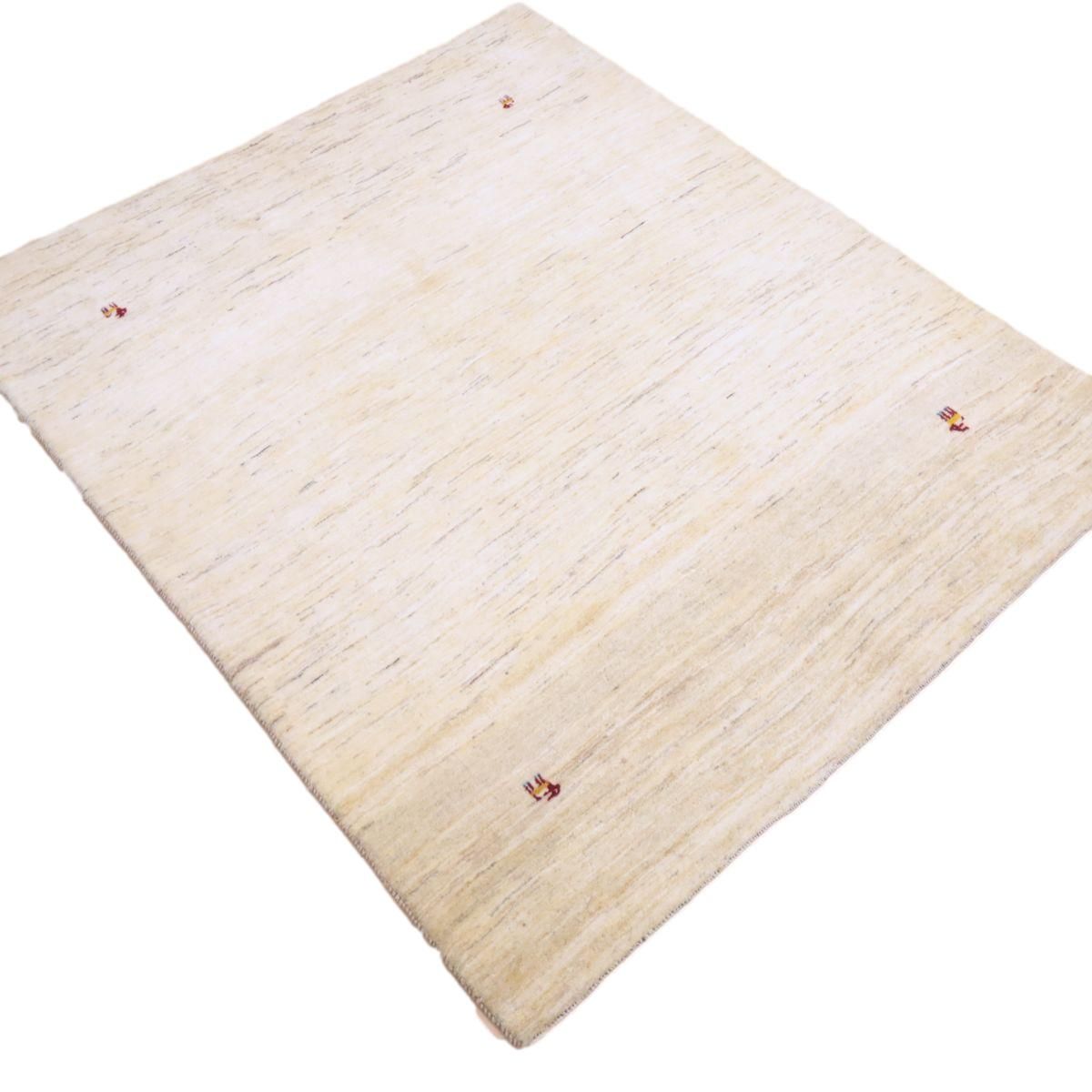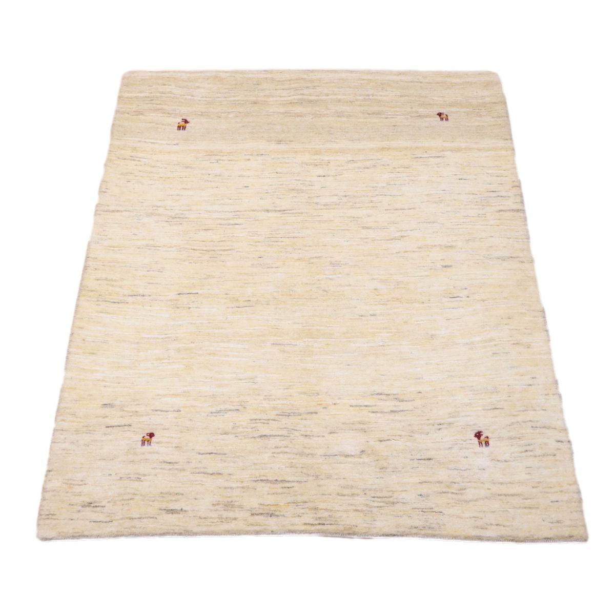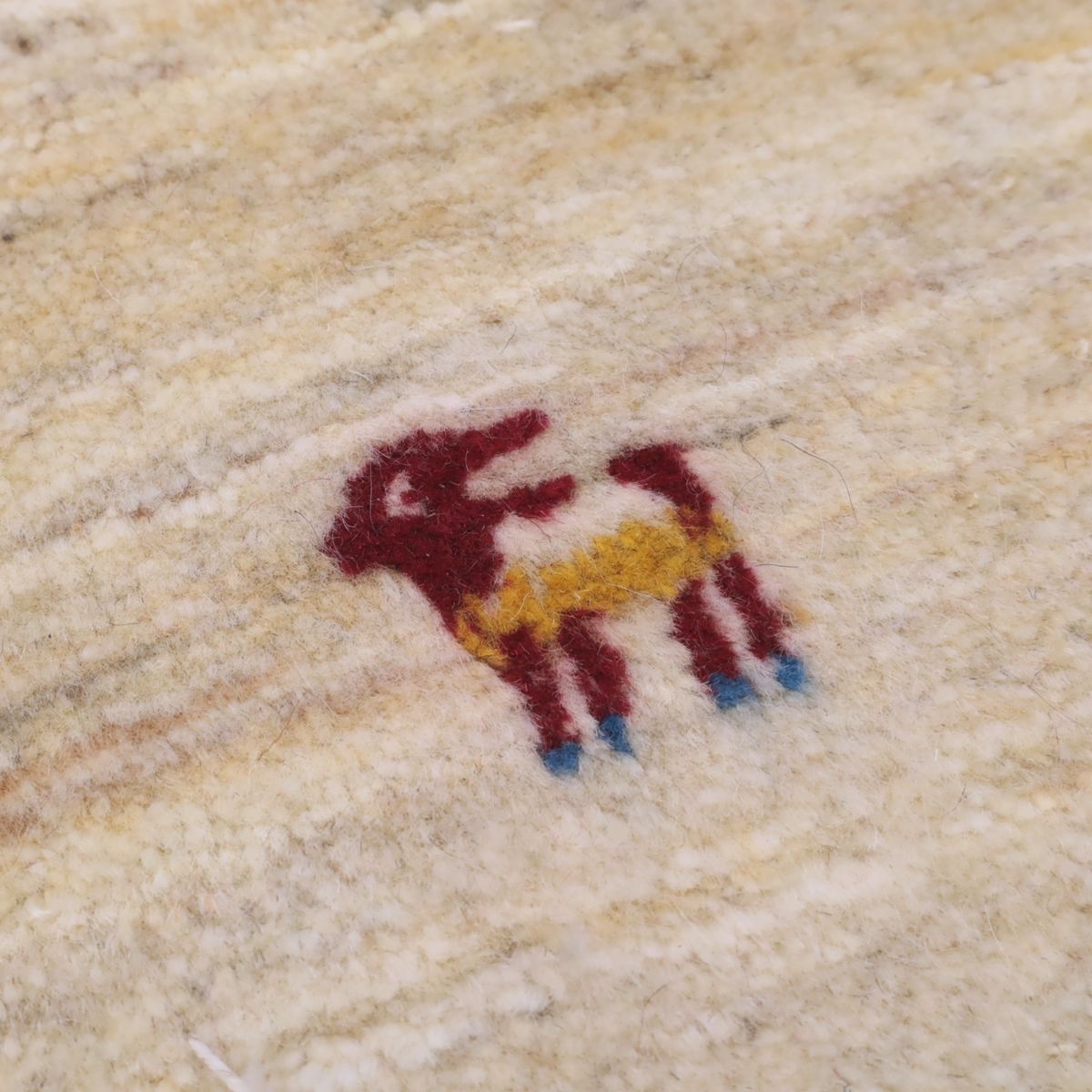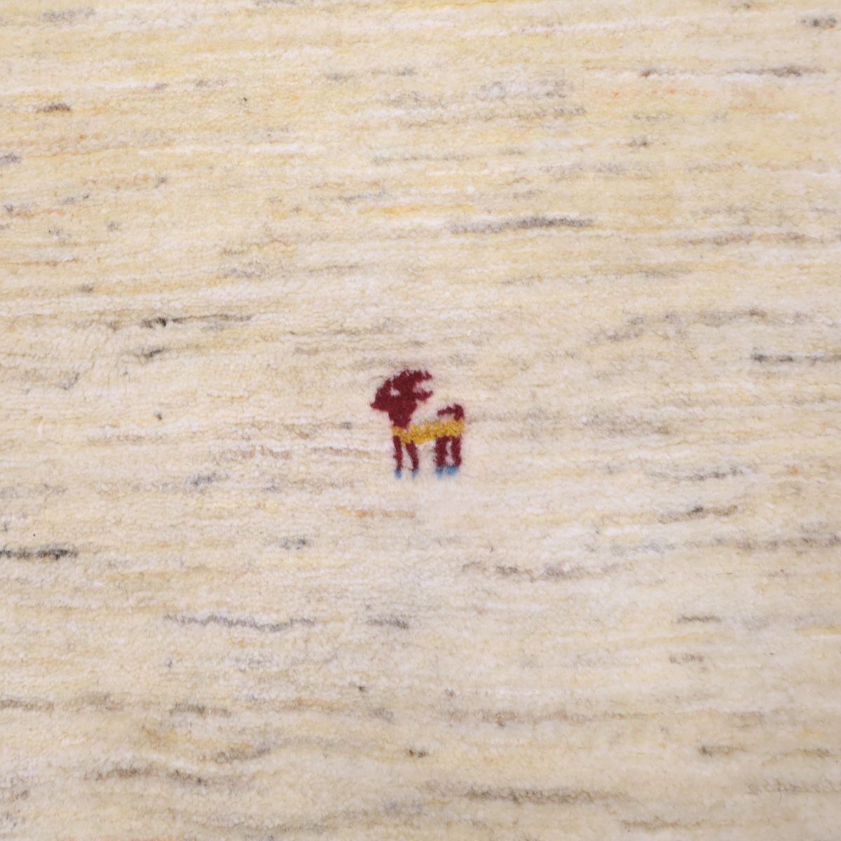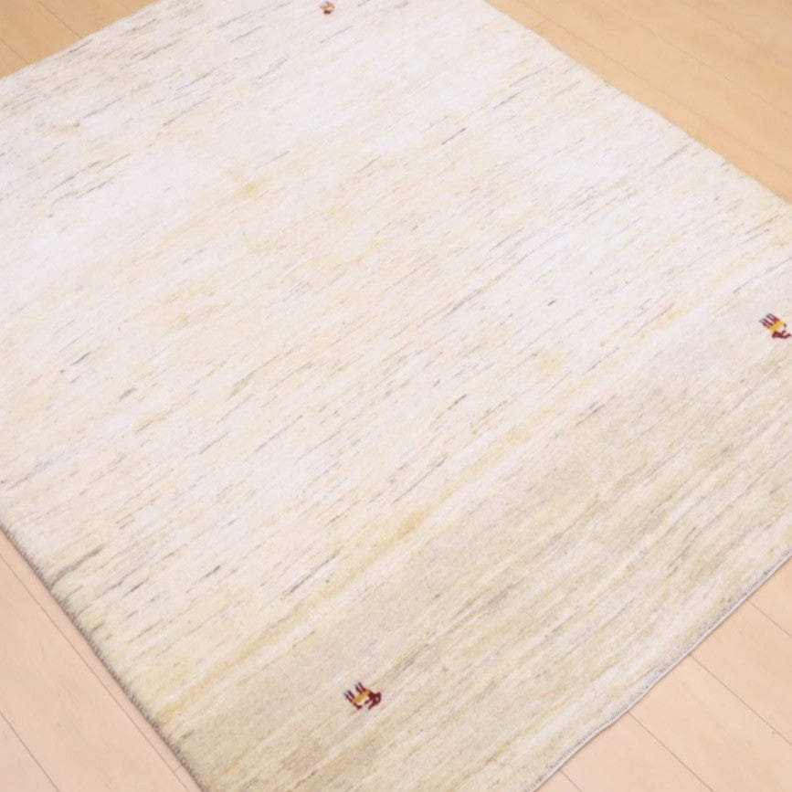 羊の毛色をそのまま活かした無染色の羊色のベースは、どんな場所にも似合うナチュラルな風合い。薄いグレーやベージュのグラデーションがやんわり入った、シンプルなデザインのギャッベです。