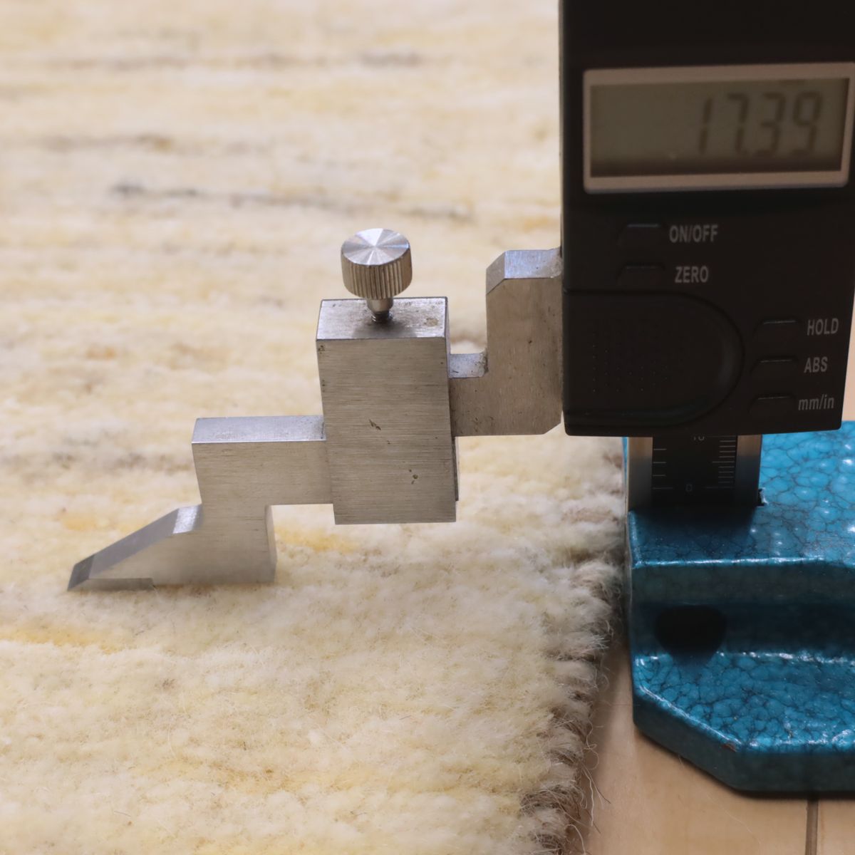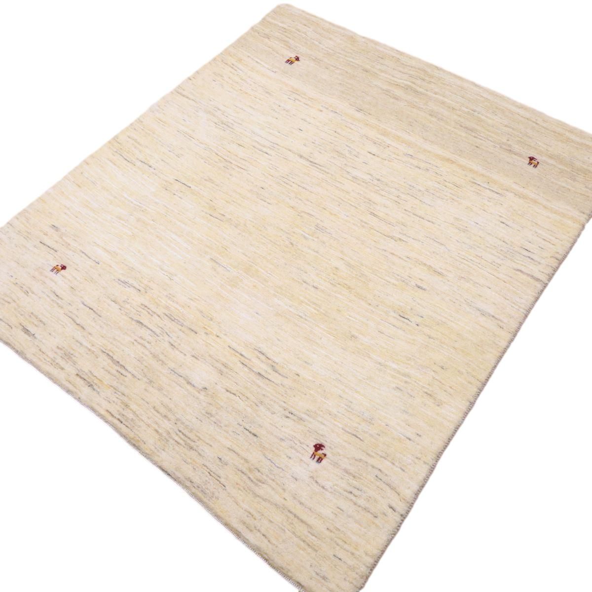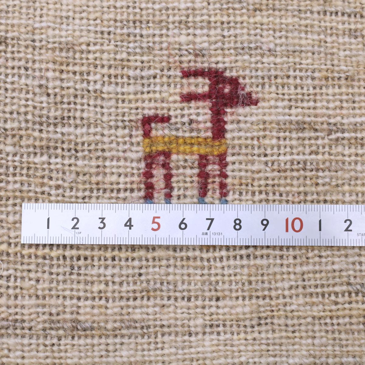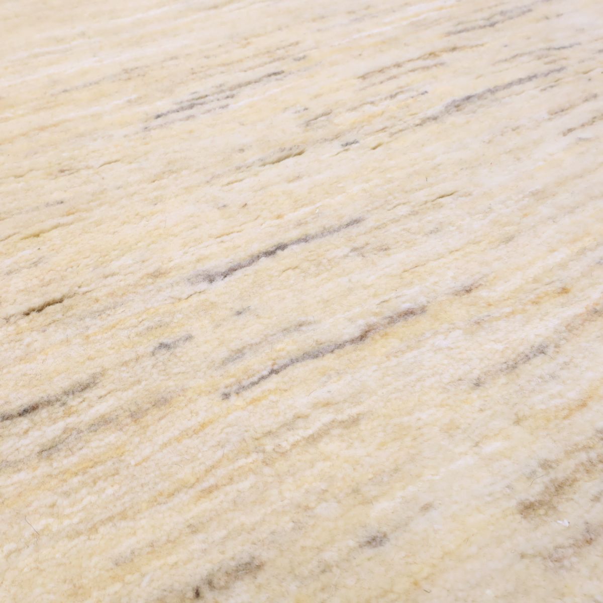 羊の毛色をそのまま活かした無染色の羊色のベースは、どんな場所にも似合うナチュラルな風合い。薄いグレーやベージュのグラデーションがやんわり入った、シンプルなデザインのギャッベです。