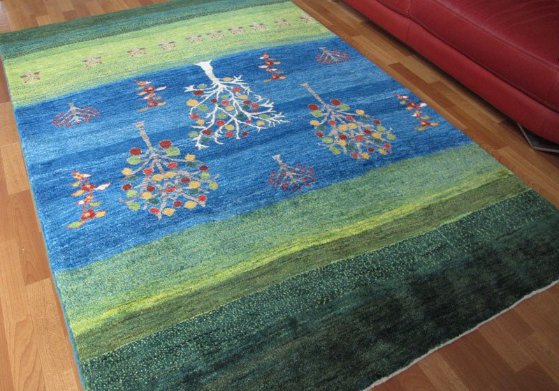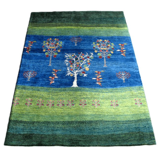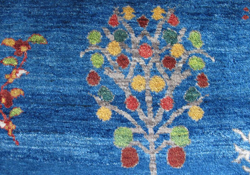 濃いめのグリーンから黄緑、そしてブルーへの同系色のつながり。また、各々のカラー自体にあるグラデーションも大変美しい、調和のとれた「生命の木」のアートデザイン。実り豊かな果実は豊かな生命のシンボルです。厚さ16、17ミリ位の程よく柔らかな踏み心地、ハリのある細やかな毛足は遊び毛も少なく、滑らかな良い手触りです。