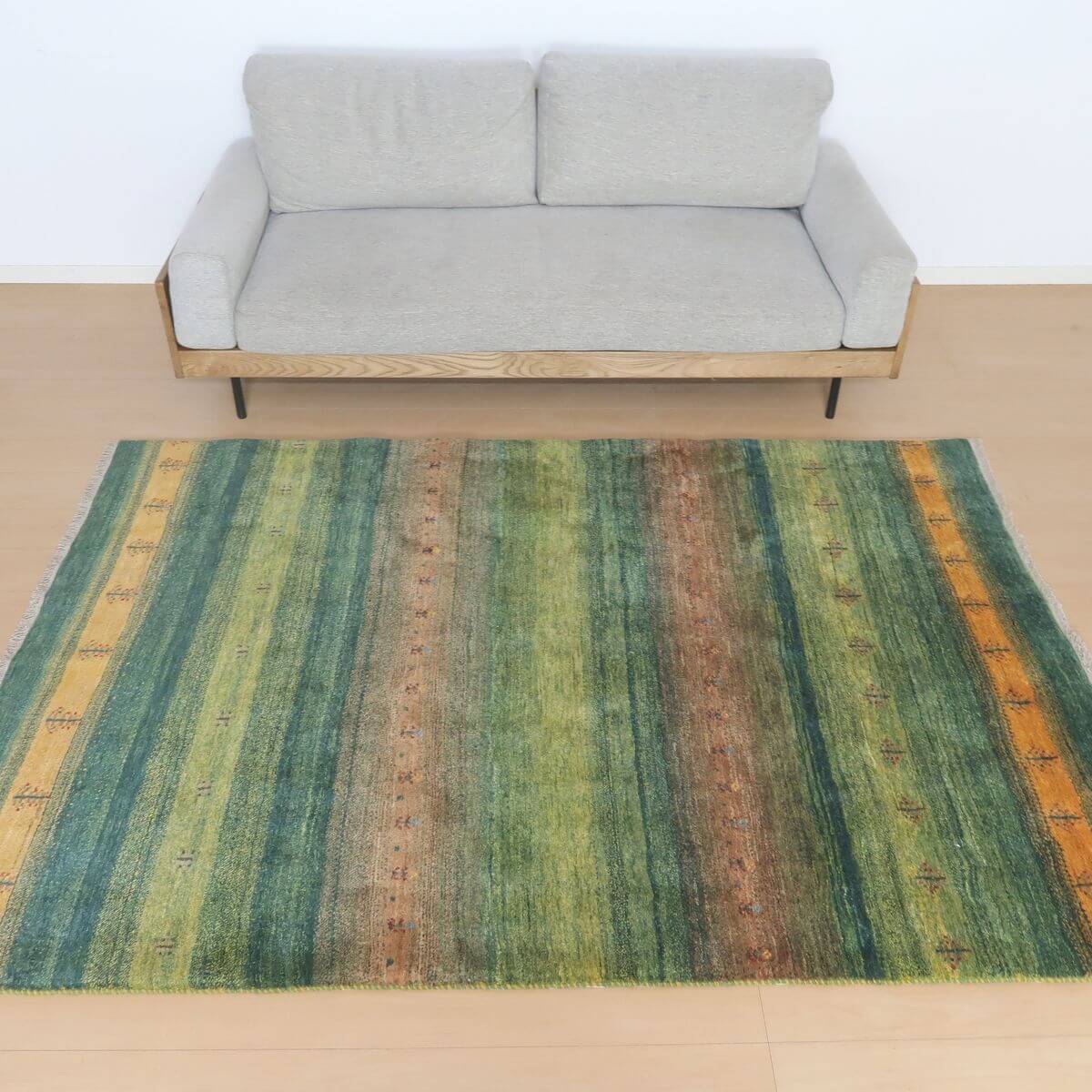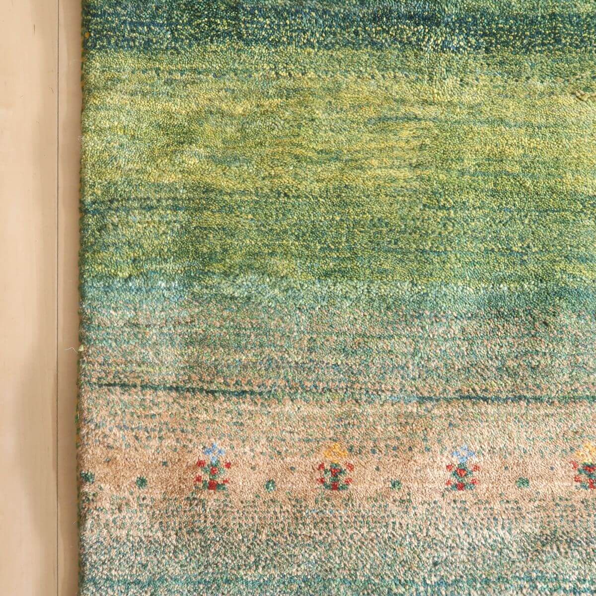 濃淡のグリーン、ベージュや黄色で、緑豊かな大地の景色を表したグラデーションの美しいギャッベです。小さな生命の木が並んだシンプルめのなデザイン。