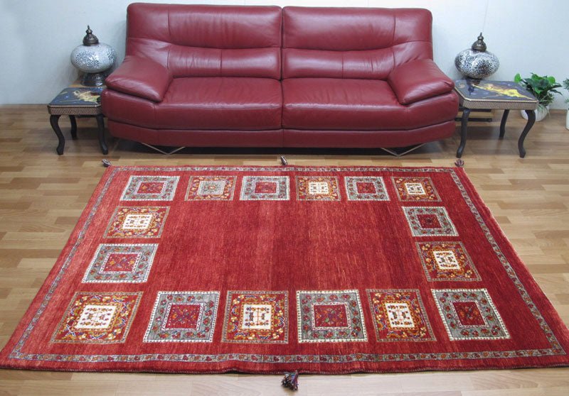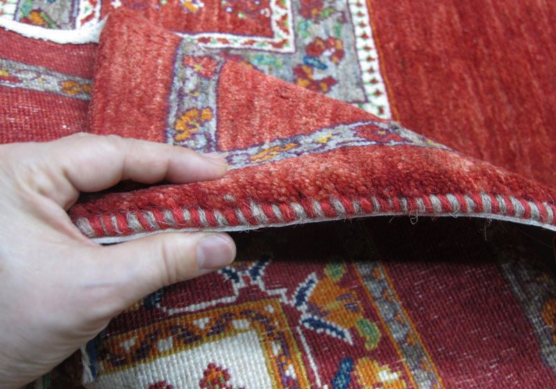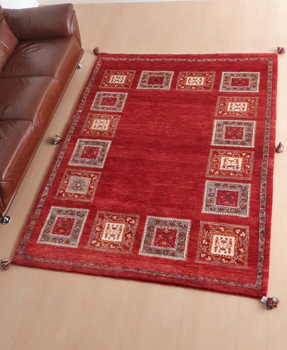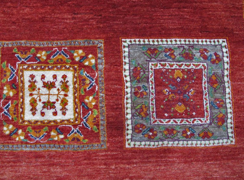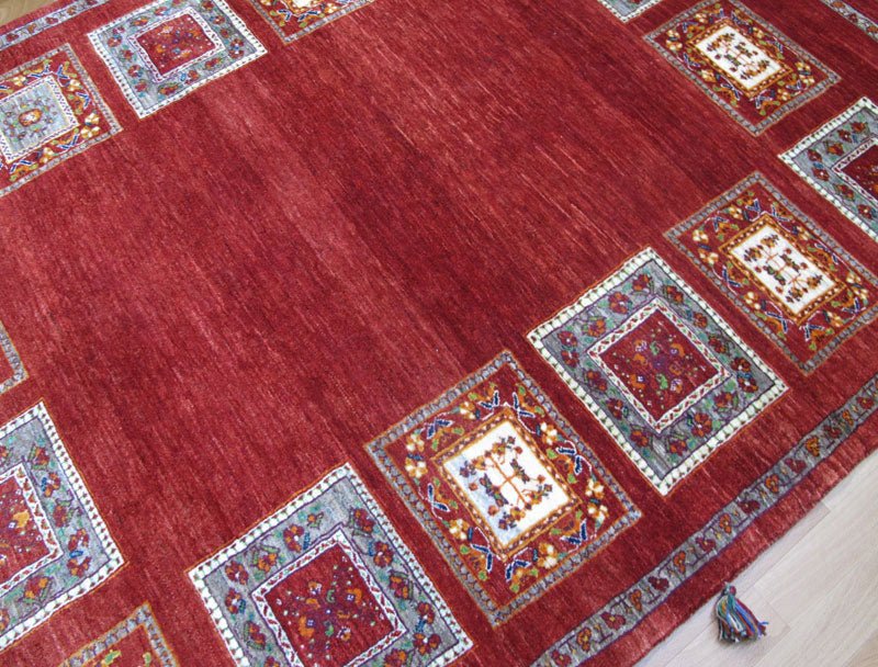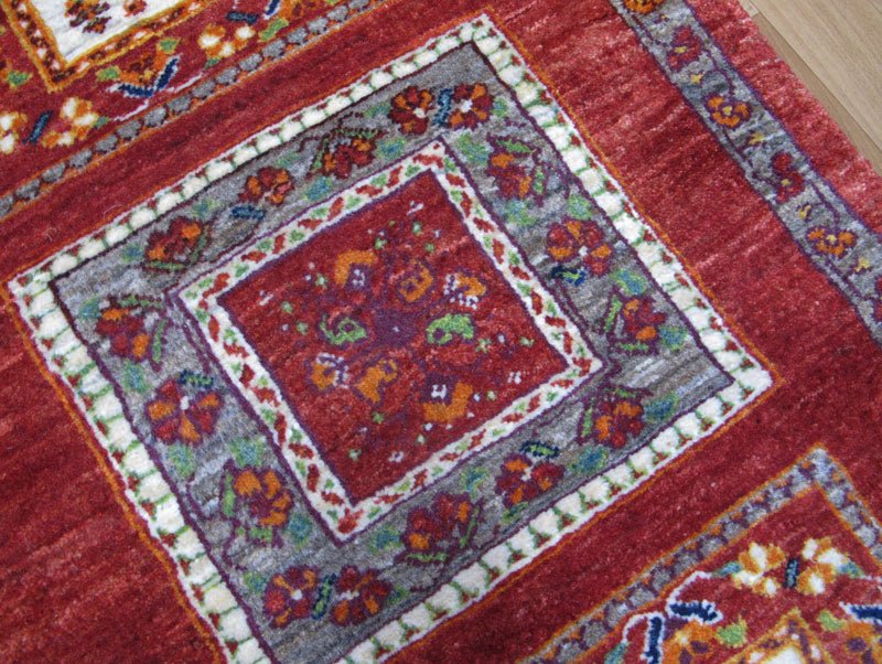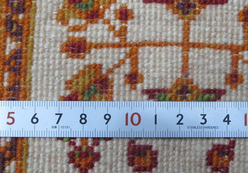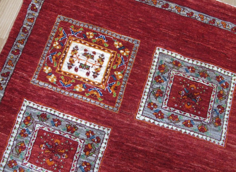 織りは、10cmあたり、およそ40から45目という普通のギャッベの数倍にもなる大変細かなルリバフ。抜け毛が少なく、手触りはふわりと柔らか。踏んだ時やんわりと沈み込む踏み心地です。腕の良い選りすぐられた織り子だけが手掛ける極上の手仕事です。
