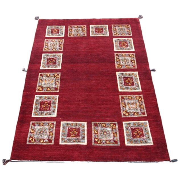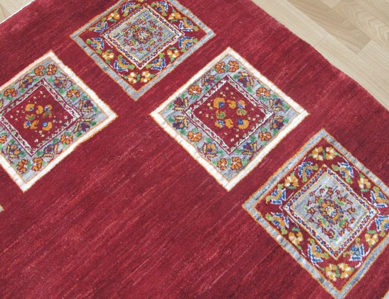 濃淡のグラデーションが細かく揺らぐ温かみのある赤を基調に、花をモチーフとしたタイル柄がくるりと囲んだ、やさしげで明るい雰囲気の伝統的なルリバフデザインです。 生成りのクリームやグレーベージュ、オレンジ、青、緑などの色使いです。