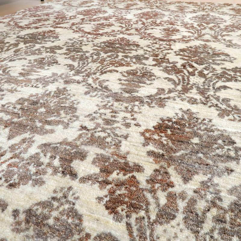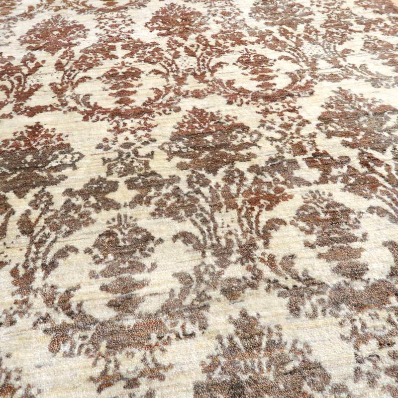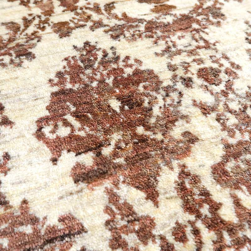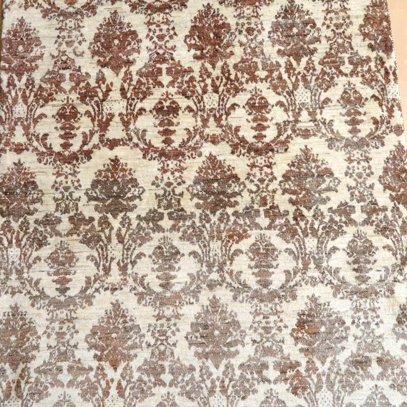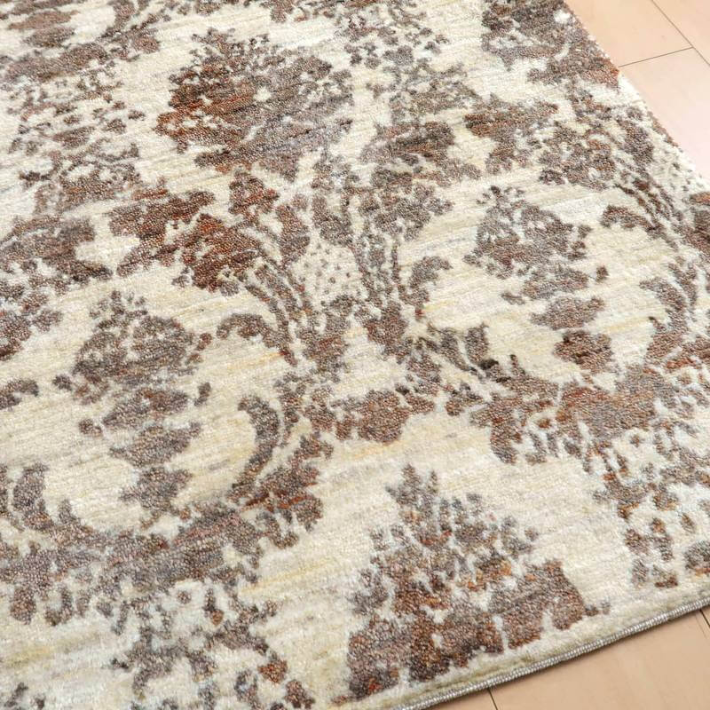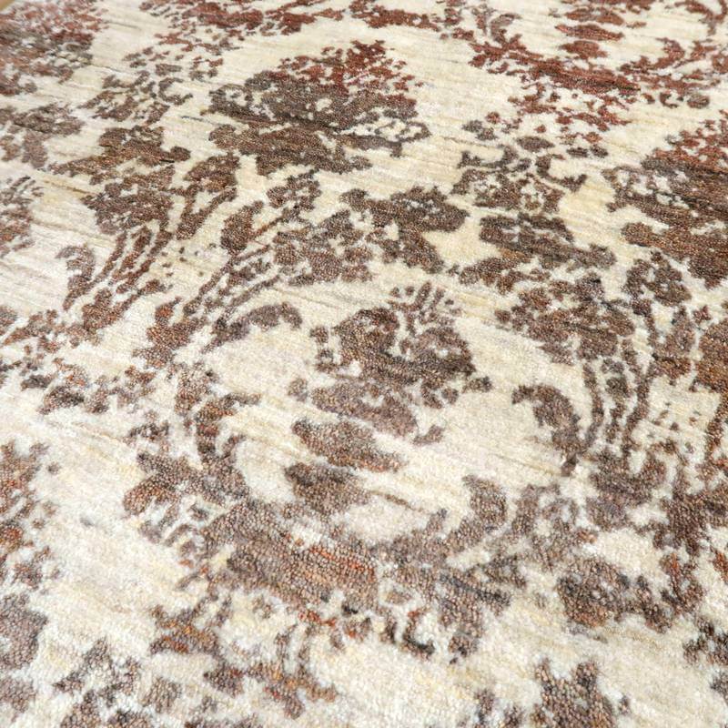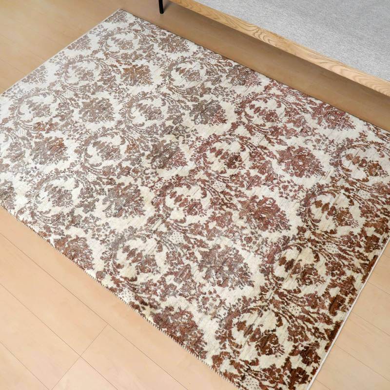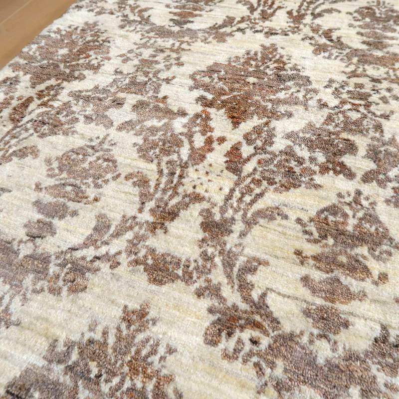 羊の毛色そのままの生成りが基調。伝統の草花のモチーフを抽象的な連続模様に進化させたモダンな新しいタイプのデザイン、ブラウンと赤みのある茶の色の変化が味わいのある美しいグラデーションとなっています。