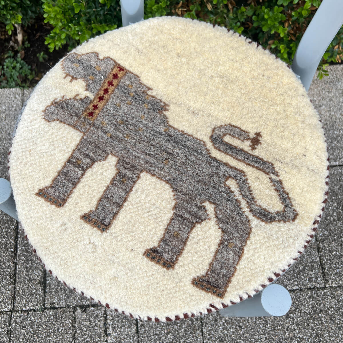 ・丸型の中に、ギャッベらしい素朴なライオンが大胆に描かれたデザイン