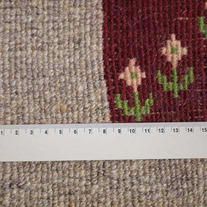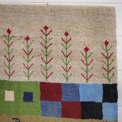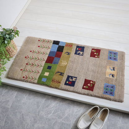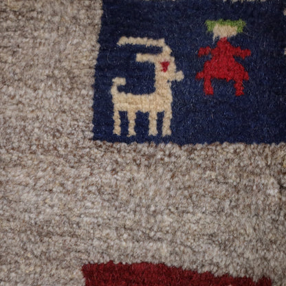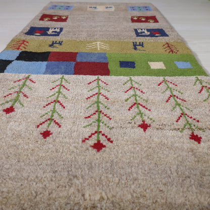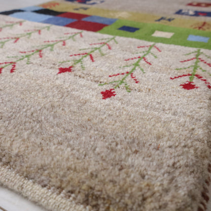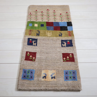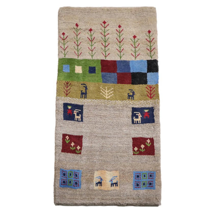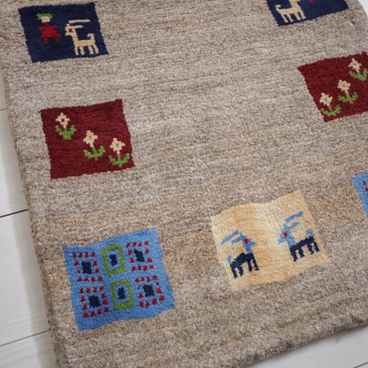 羊の毛色を生かしたグレージュを基調にしたギャッベです。モチーフはカラフルでありつつも深みのある色使いで、全体として落ち着いた印象になっています。楽し気な雰囲気を演出してくれる一枚です。