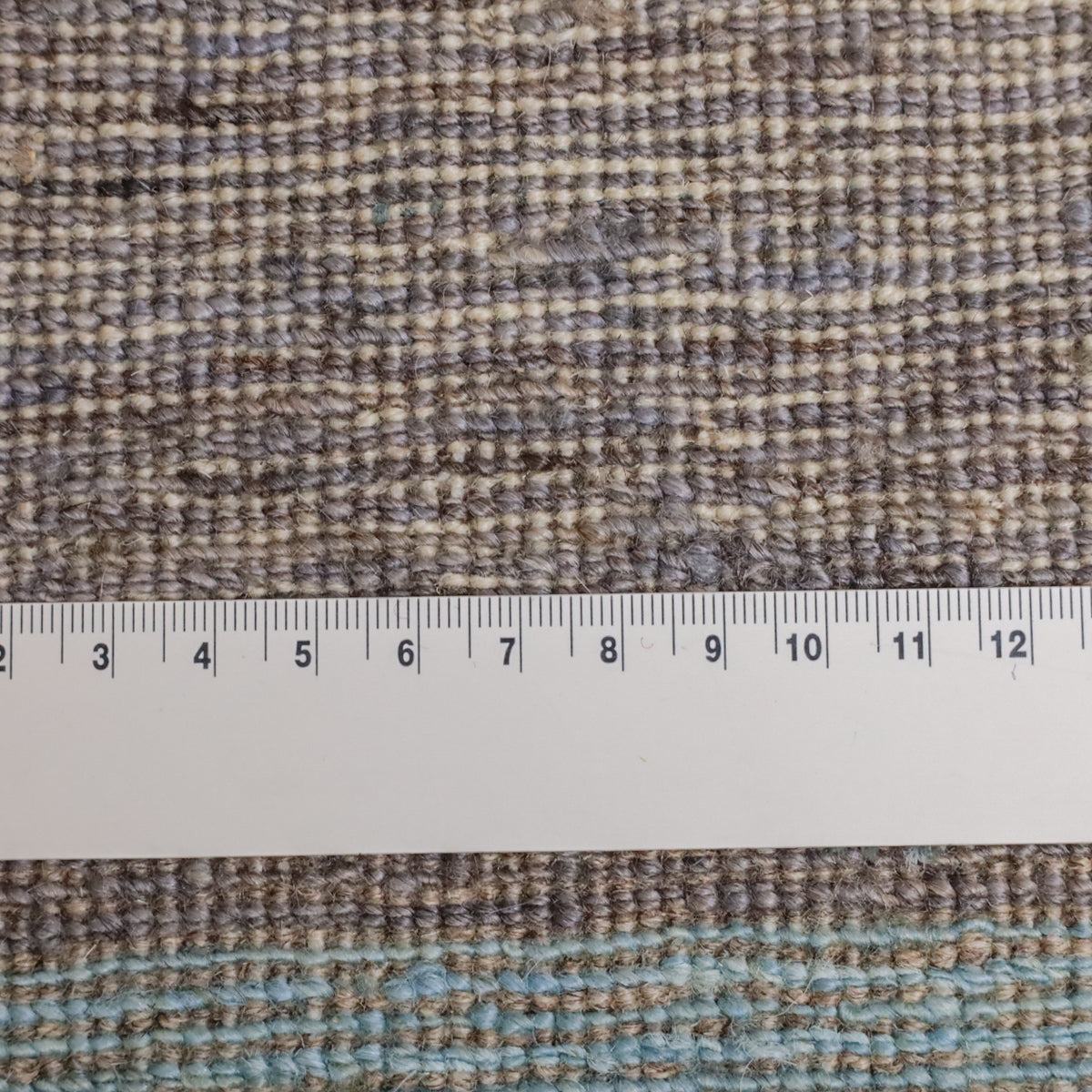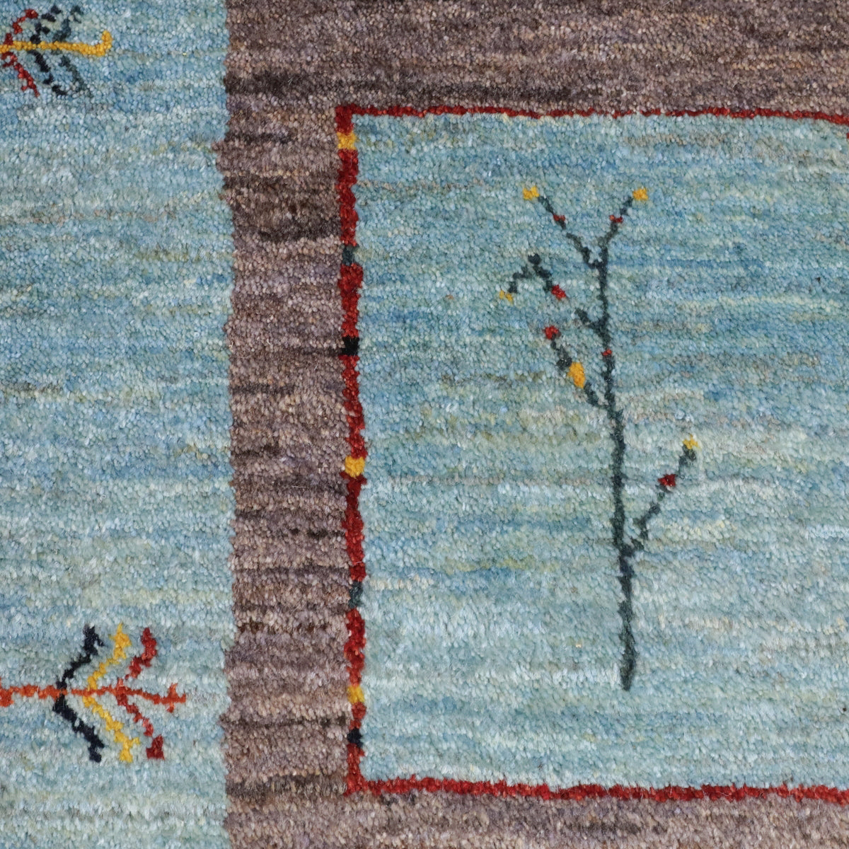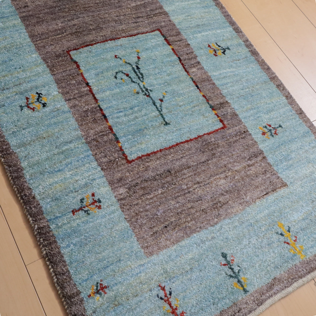 淡い黄色味がかった水色とグレーを基調にしたこのギャッベは、シンプルでありながらも個性的なデザインが魅力です。上下の四角の中には繊細な木のモチーフが描かれており、周囲には小さな花や木々がカラフルに配置されています。柔らかな色合いがお部屋に落ち着きと和やかさをもたらします。