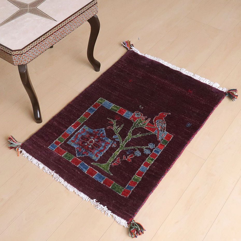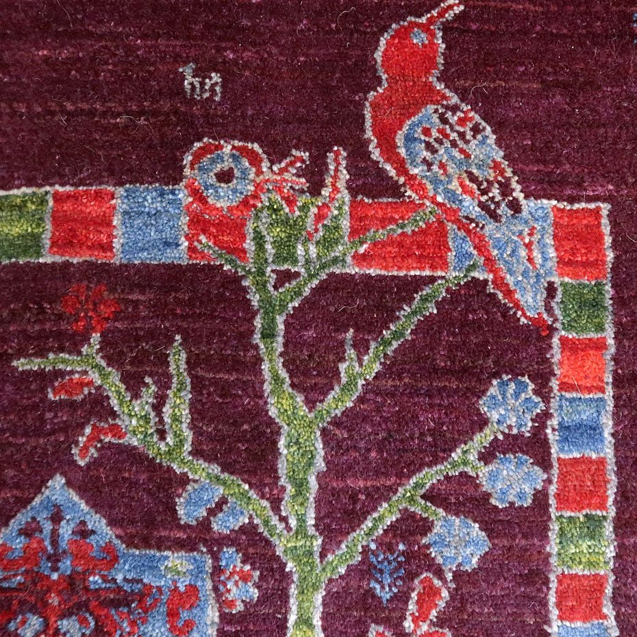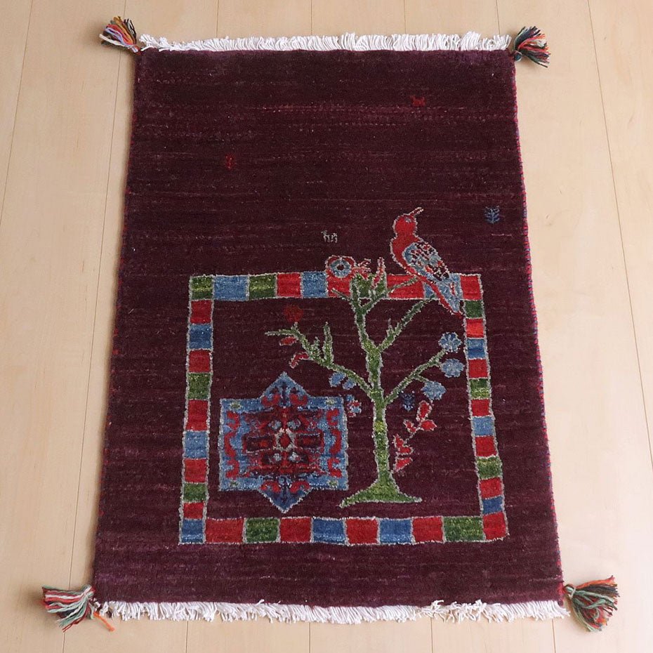 濃い紫色のやんわりしたグラデーションを背景に、生命の木にとまる鳥が詩的な雰囲気で描かれています。詩の国イランらしい詩集の挿絵のようなモダンなギャッベです。絵としても飾れるデザイン。