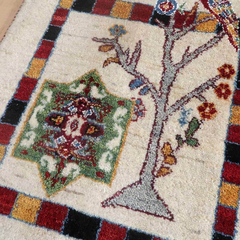 羊の毛色をそのまま活かした原毛のグラデーションが細かく入ったナチュラルなカラー。生命の木にとまる鳥が詩的な雰囲気で描かれています。詩の国イランらしい詩集の挿絵のようなモダンなギャッベです。絵としても飾れるデザイン。デザインを引き立てる為のコットンシルクが一部(特に白く見える部分)に使われています。