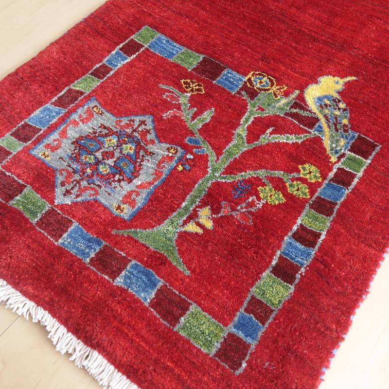 濃淡の細かなアブラシ(グラデーション)が綺麗な明るい赤、生命の木にとまる鳥が詩的な雰囲気で描かれています。詩の国イランらしい詩集の挿絵のようなモダンなギャッベです。絵としても飾れるデザイン。