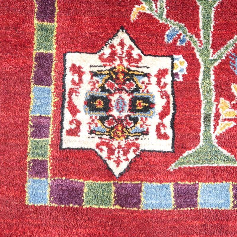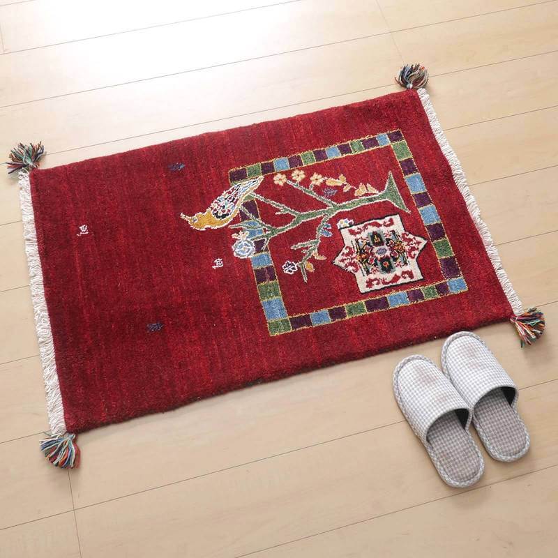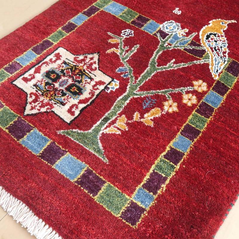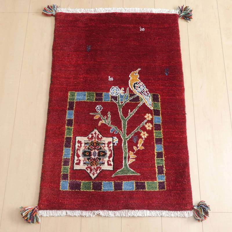 やんわりとしたグラデーションが楽しめる、しっとりと深みのある赤。生命の木にとまる鳥が詩的な雰囲気で描かれています。詩の国イランらしい詩集の挿絵のようなモダンなギャッベです。絵としても飾れるデザイン。