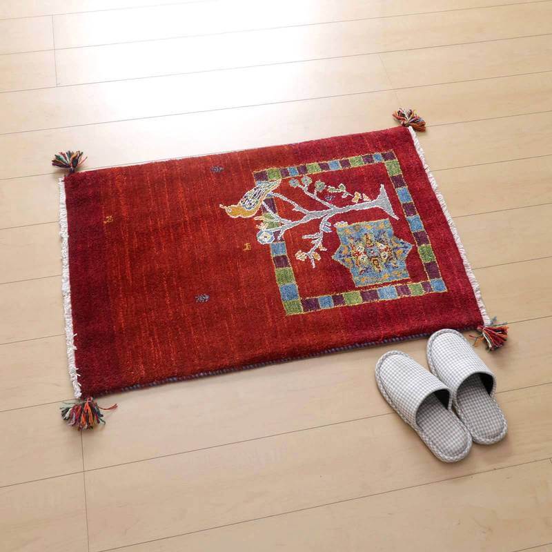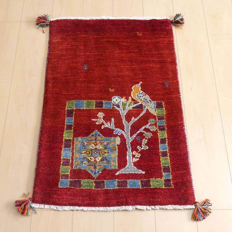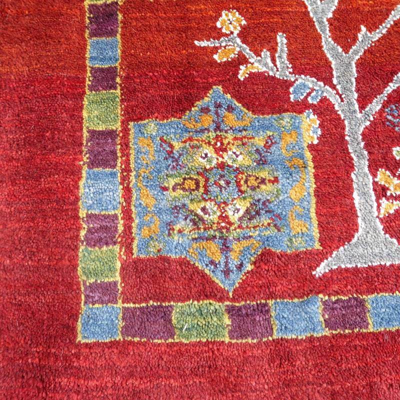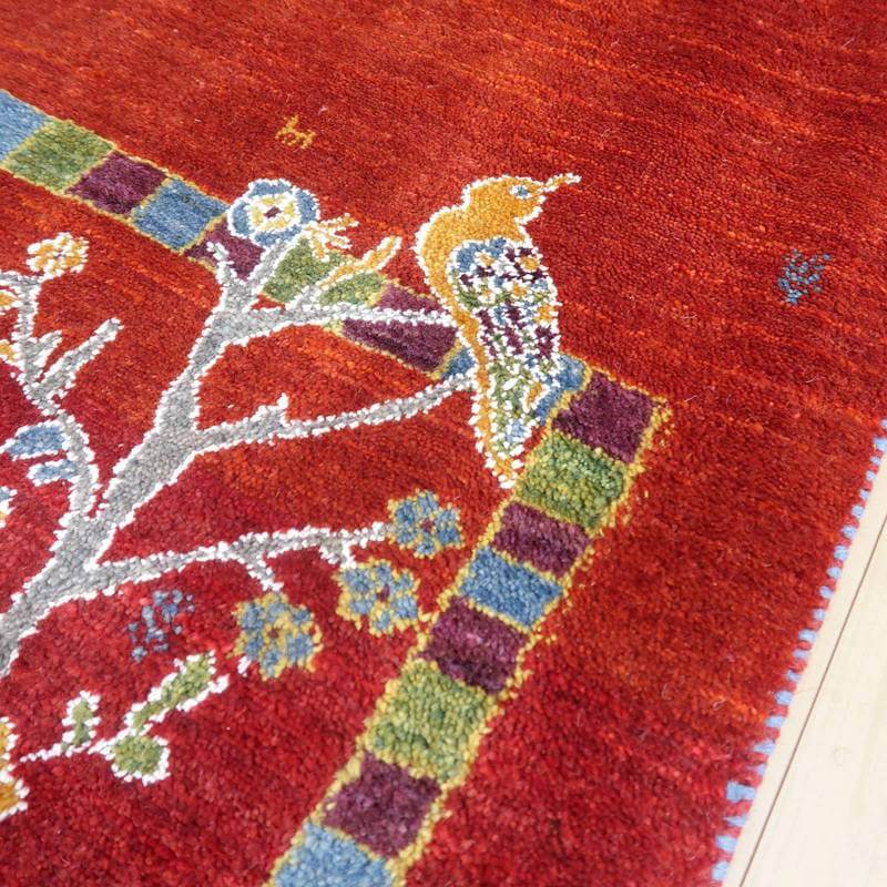 濃淡の細かなアブラシ(グラデーション)が綺麗な明るい赤、生命の木にとまる鳥が詩的な雰囲気で描かれています。詩の国イランらしい詩集の挿絵のようなモダンなギャッベです。絵としても飾れるデザイン。デザインを引き立てる為のコットンシルクが一部(特に白く見える部分)に使われています。形に手織りならではの歪みがございます。デザインを引き立てる為のコットンシルクが一部(特に白く見える部分)に使われています。