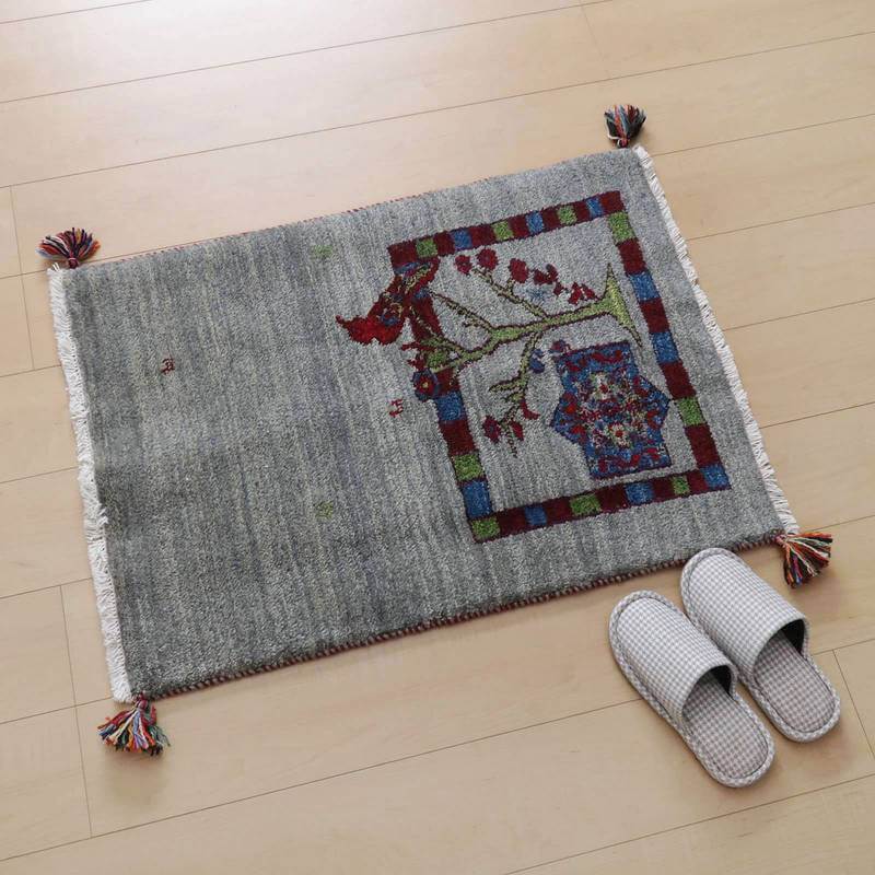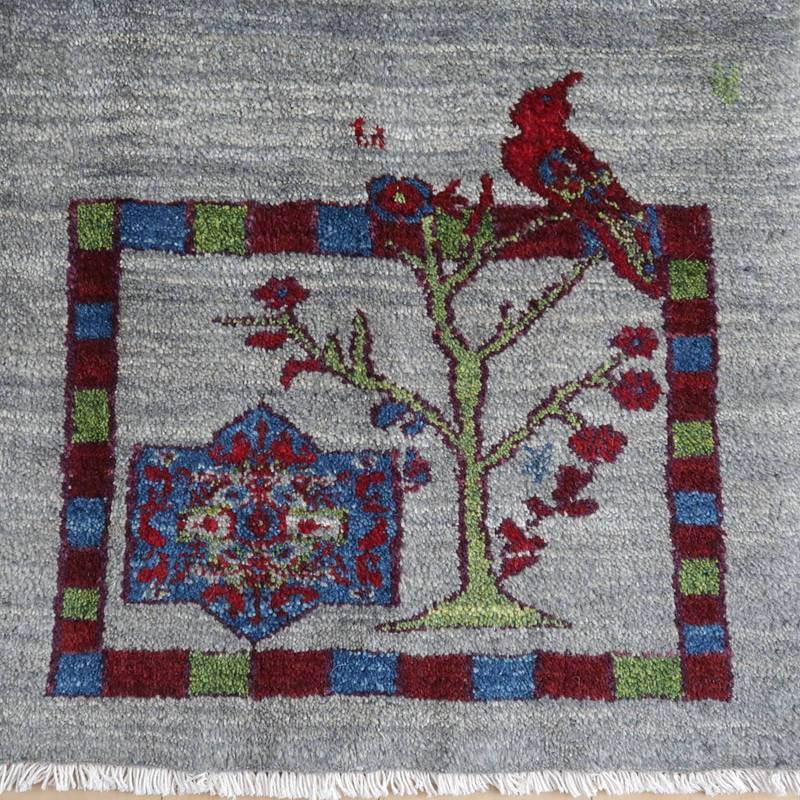 グレーを基調とした落ち着いたトーンを背景に、生命の木にとまる鳥が詩的な雰囲気がシックな色合いで描かれています。詩の国イランらしい詩集の挿絵のようなモダンなギャッベです。絵としても飾れるデザイン。