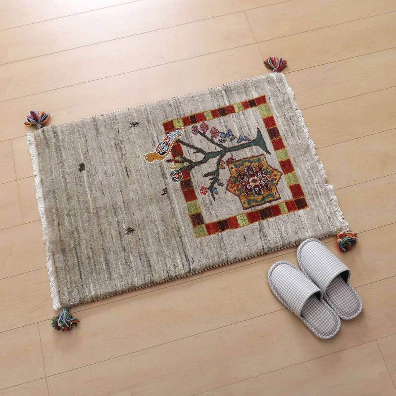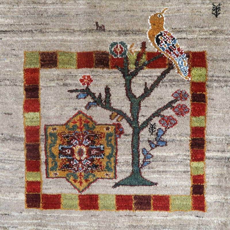 グレーやベージュなどの羊の毛色をそのまま活かした原毛のグラデーションが細かく入ったナチュラルなカラー。生命の木にとまる鳥が詩的な雰囲気で描かれています。詩の国イランらしい詩集の挿絵のようなモダンなギャッベです。絵としても飾れるデザイン。