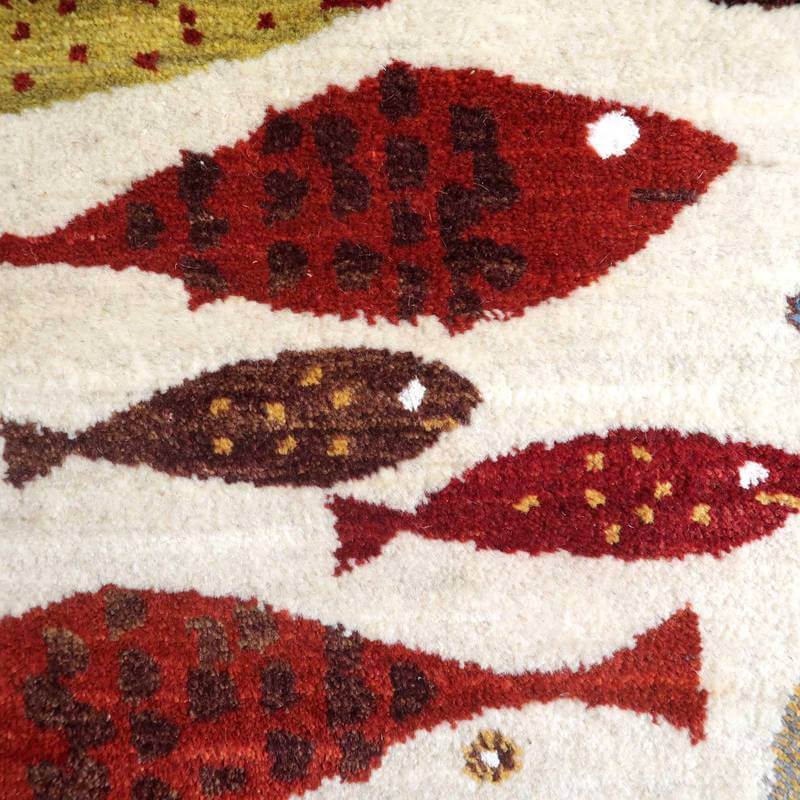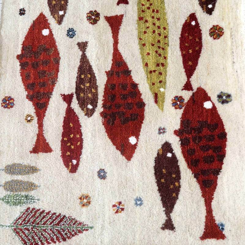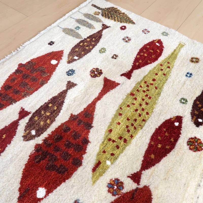 ギャッベの中ではたいてい小さく部分的に使われている魚のモチーフがメインとなった新しいデザイン。アクアリウムの中を覗いたような様々に泳ぐ様子が楽しい絵になるギャッベです。羊の原毛のナチュラルカラー。