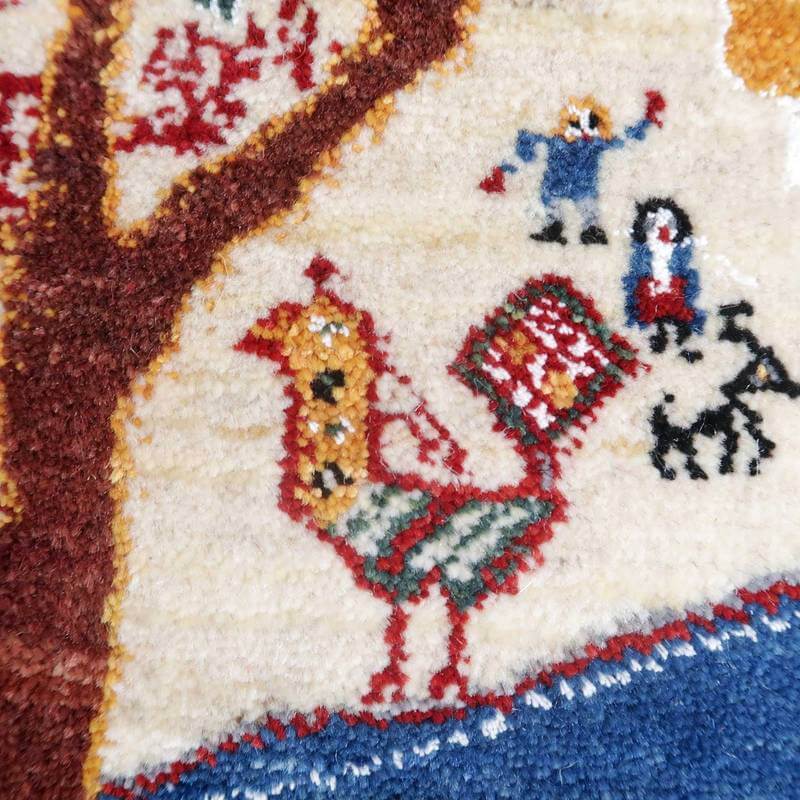 山並みのあちこちに張られたテントと鳥や生命の木そして小さな人々も。生活の様子を遠近感をつけて表現された絵画ギャッベです。