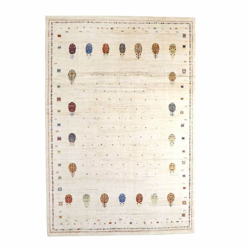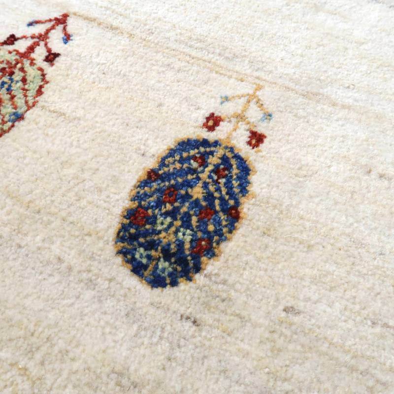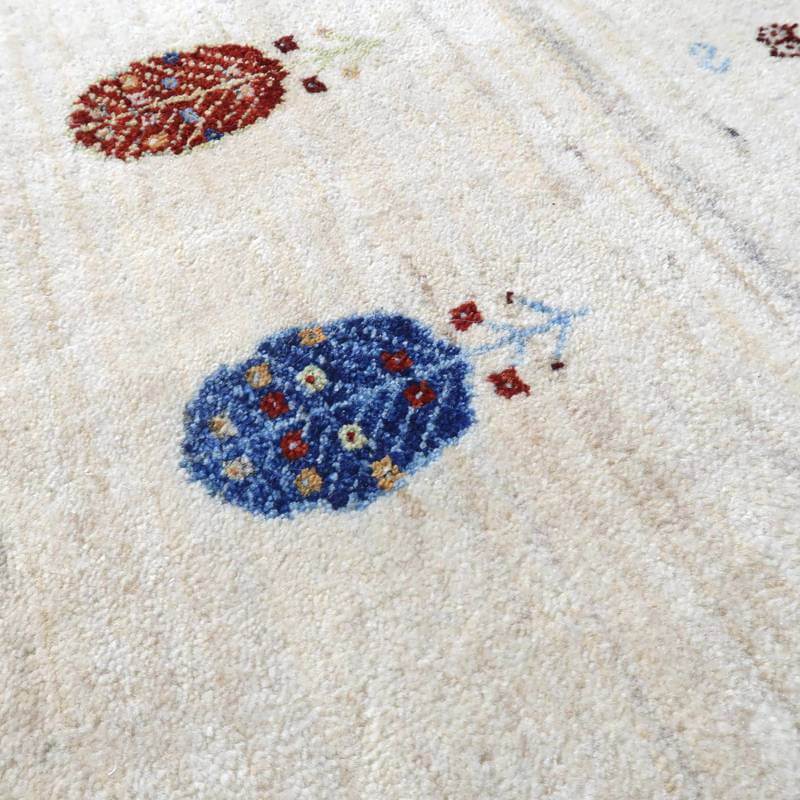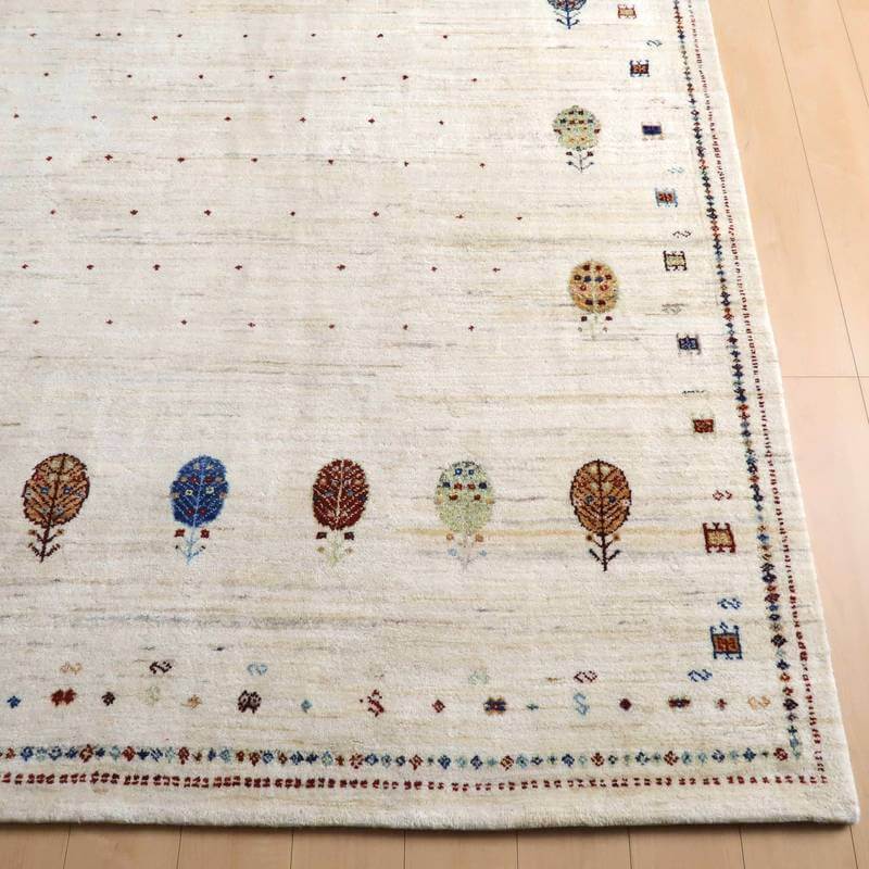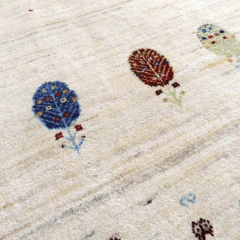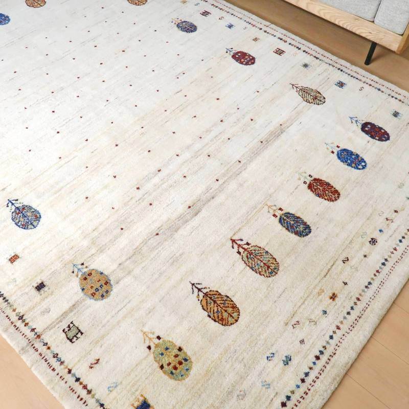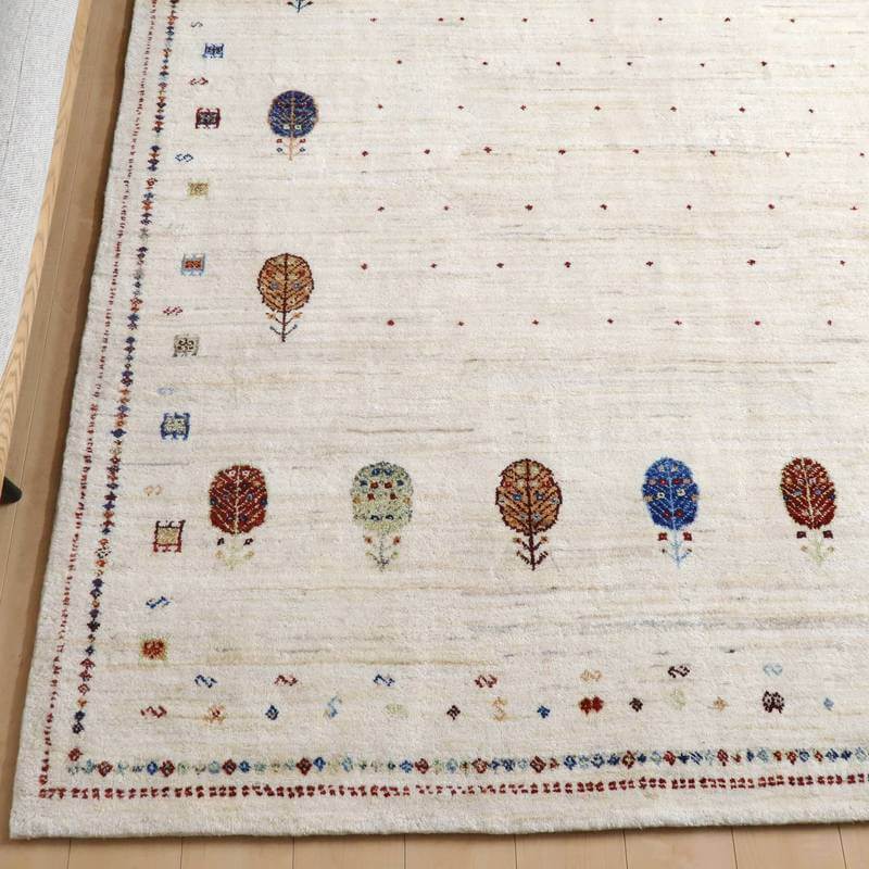 刈り取った羊の毛を染めずにそのまま使用した天然のアイボリーを基調に、ころんと丸い生命の木と、小さな花、囲いが明るい彩で描かれた、かわいらしさのあるデザイン。小さなモチーフたちは細かな織りの証。冬毛の柔らかな最高部位のウールのみを使用して細かく編んだ最上級のソフトな手触り。無染色のタイプの中では白っぽく、明るいカラーになります。