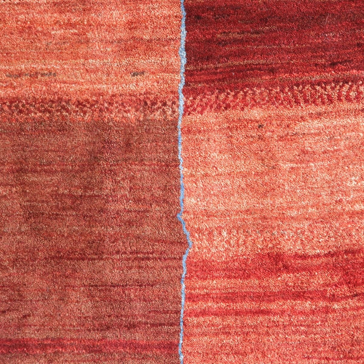 濃淡や色調の違う幾つもの赤色を使用した赤系のギャッベ。つながりある同系色のグラデーションを切り替えて、浮かび上がるような枠柄にデザインした美しい色のつながりの上に、小さなモチーフが入ったシンプルでスタイリッシュなモダンデザインです。