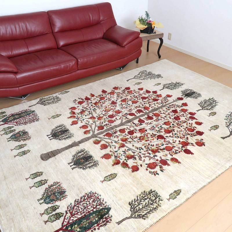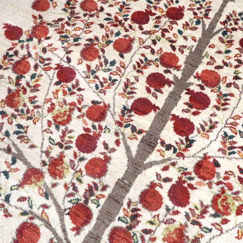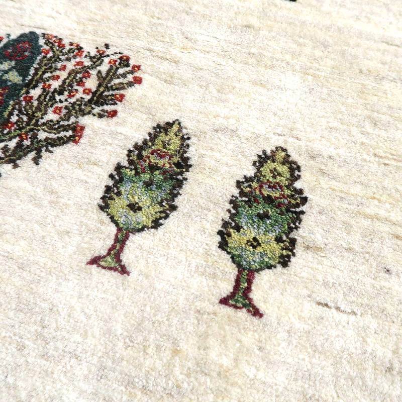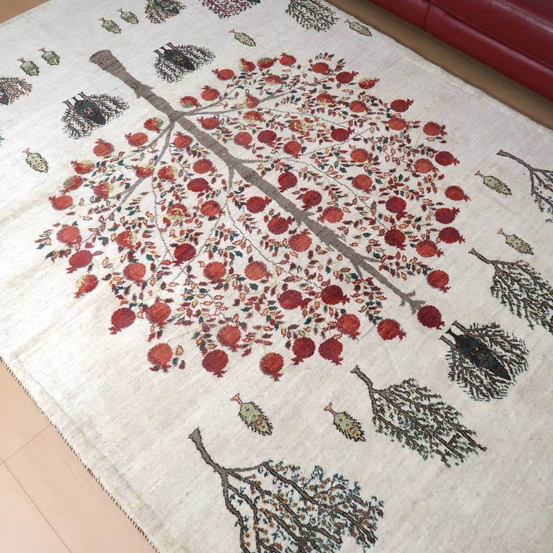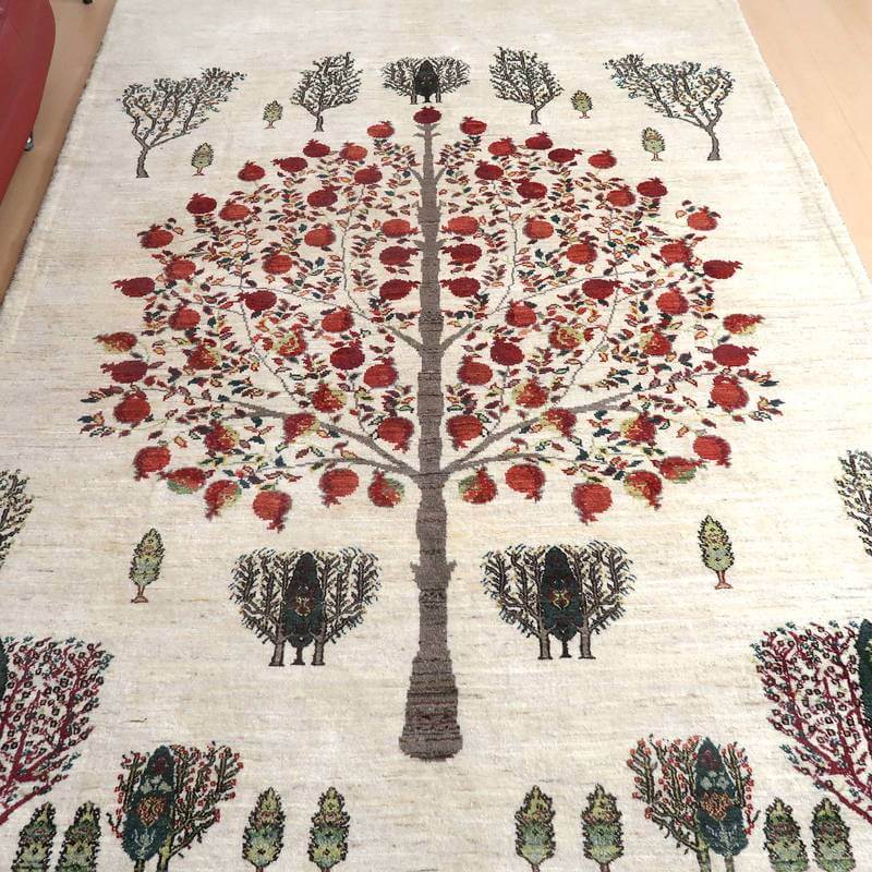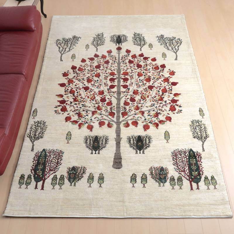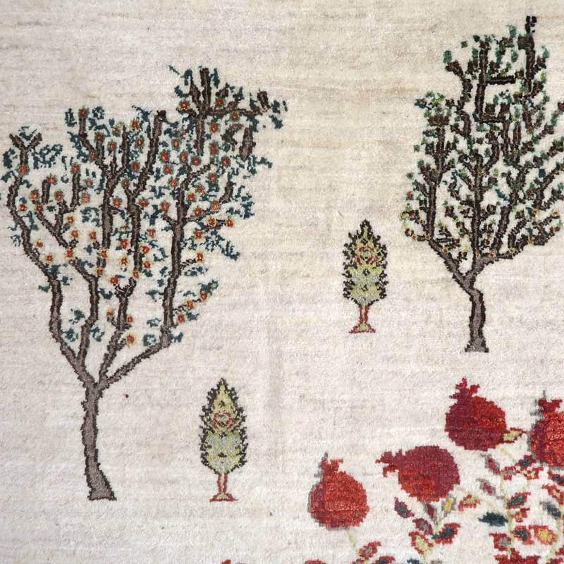 大きな実をたくさん実らせた大きな柘榴(ザクロ)をセンターに大きく配したザクロのギャッベ。羊の毛色をそのまま活かした無染色のウールでナチュラルな風合いが大きく感じられます。イラン人にとって身近な食べ物である柘榴(ザクロ)は昔から子宝の薬でもありますが、子孫繁栄の願いが込められています。強い生命力のシンボルである糸杉が遠近描かれたランドスケープデザイン。