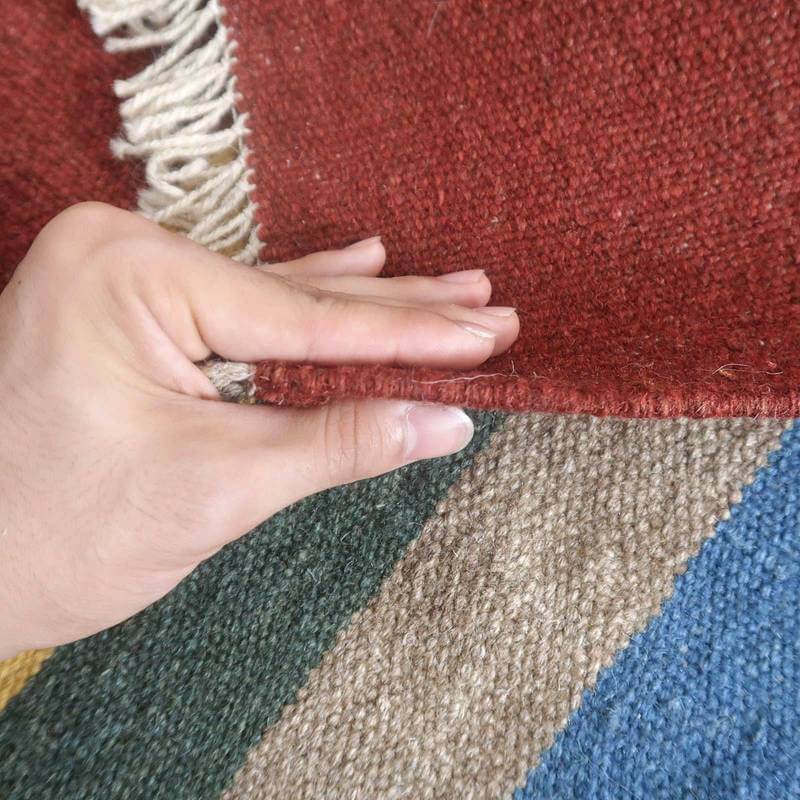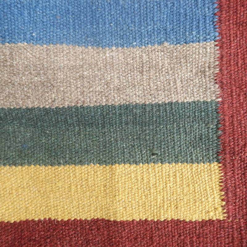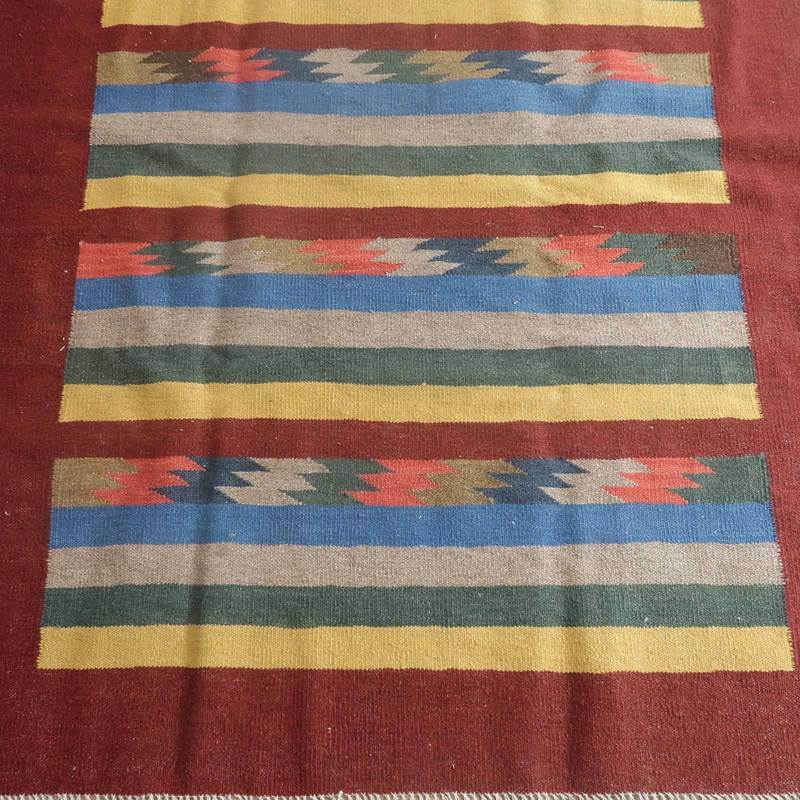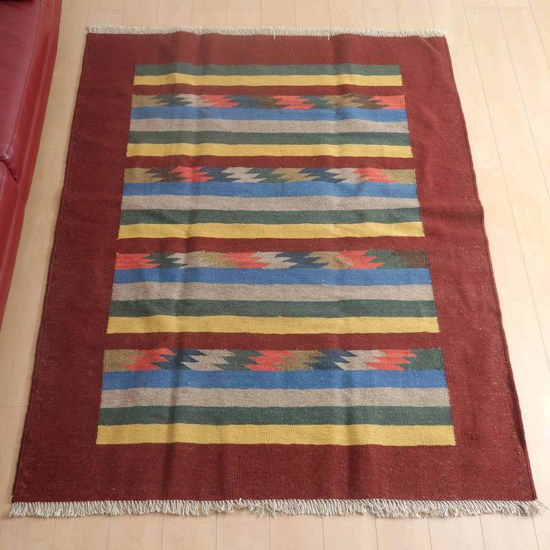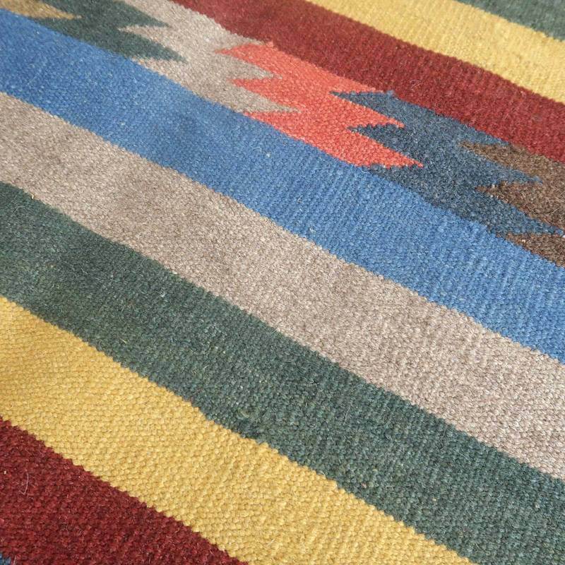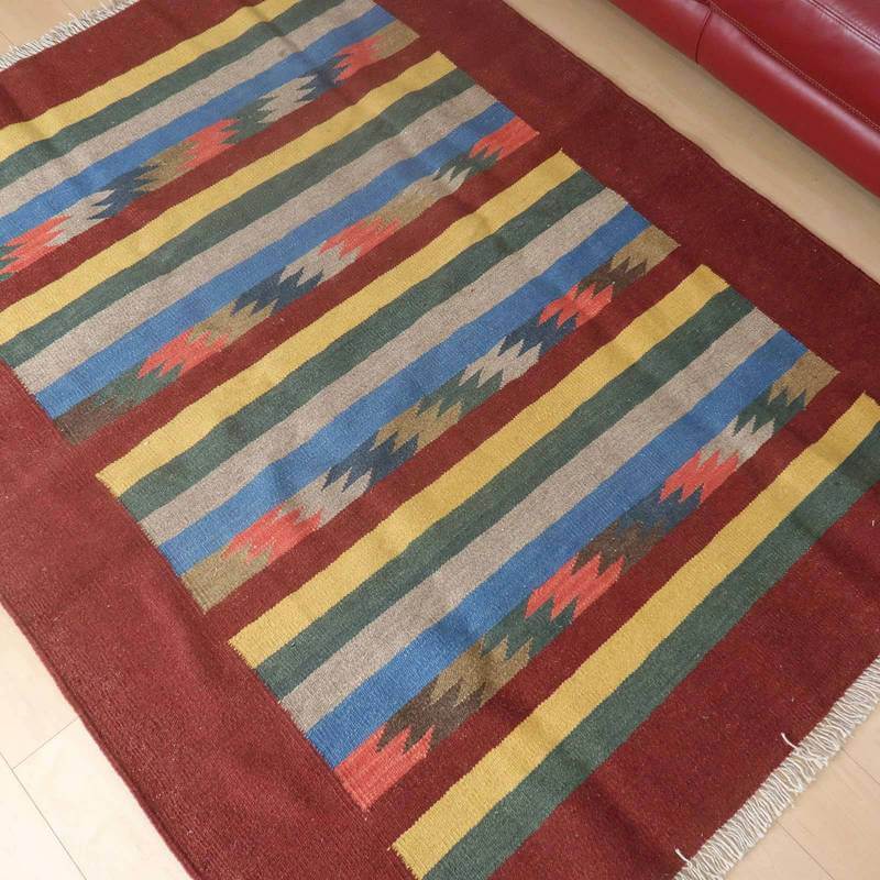 イラン南部シラーズ地方のキリムです。いくつかの色を使用した幾何学柄やギザギザ文様はリズムのある明るい雰囲気。程よく落ち着いた色とウールの風合いが、やさしくインテリアに馴染みます。カシュガイの女性が昔ながらに織り上げたキリムなので、よく締まった丈夫な織り目で、早く仕上げる為、ゆるく粗く織られる商用生産のキリムには無い、誠実さが伝わってくる一枚です。また、平織り(ひらおり)という裏表の無い織り方で両面使えます。カシュガイ族の遊牧のテント生活用の為、丈夫に織られ、洗濯も簡単、床なじみの良い適度な厚さで、普段使いのラグとして大変使いやすいキリムです。