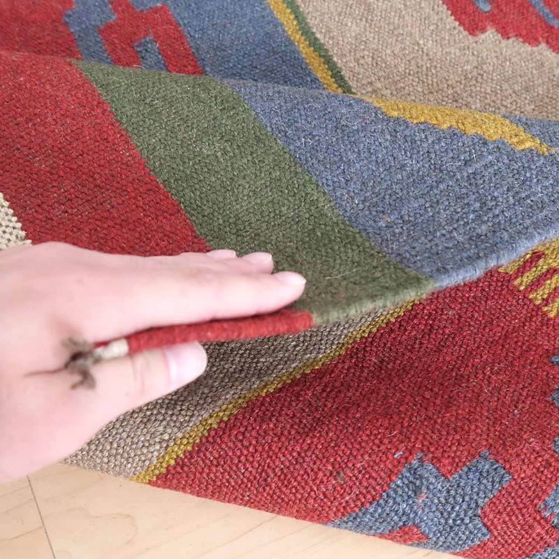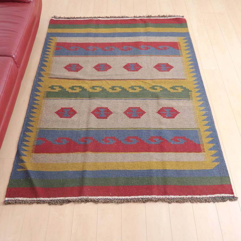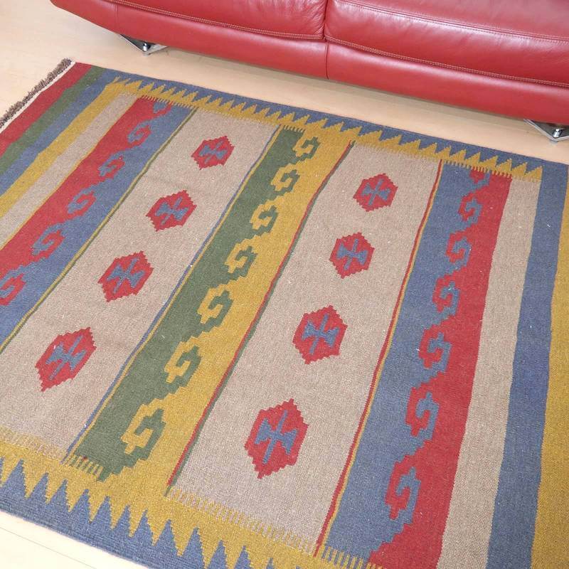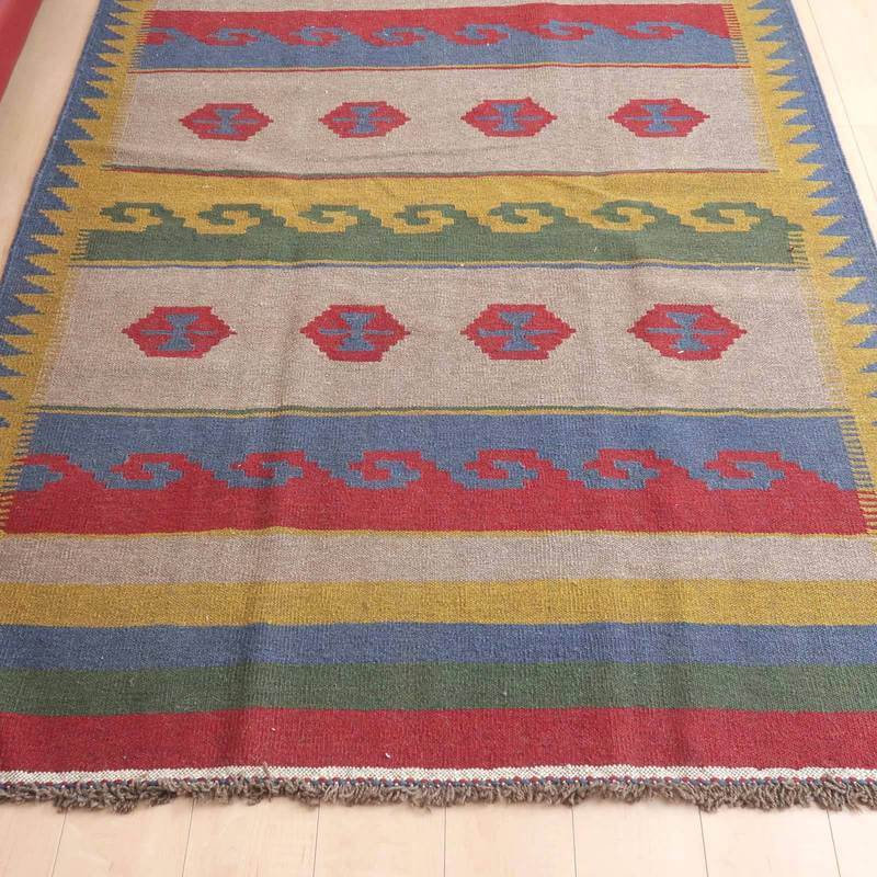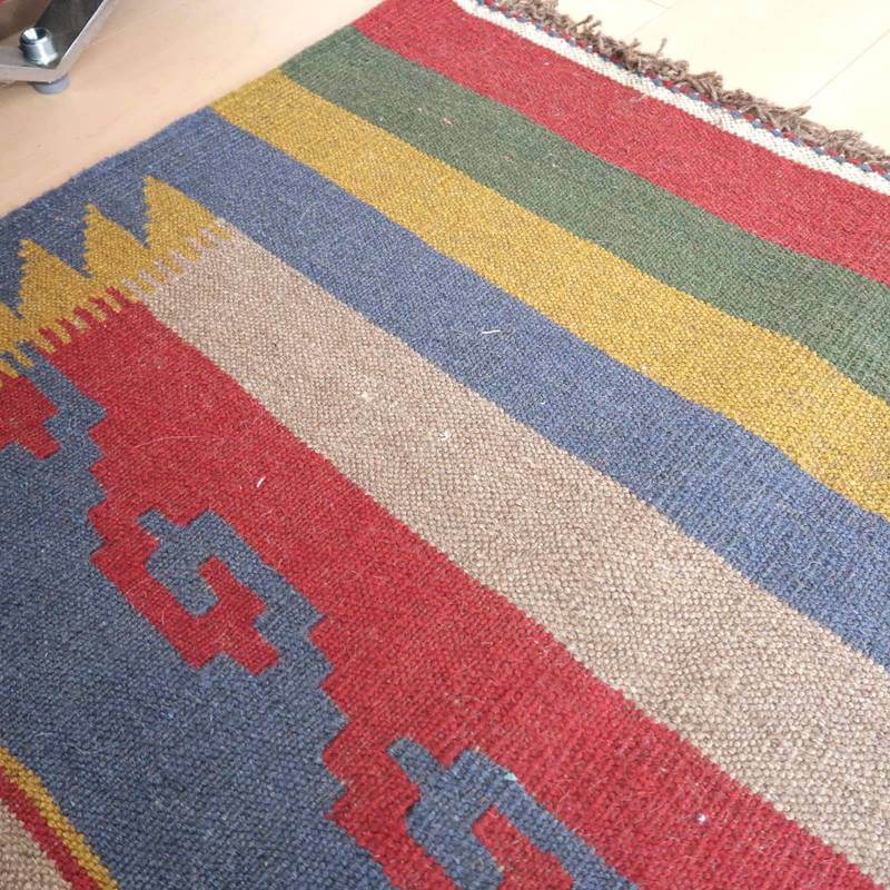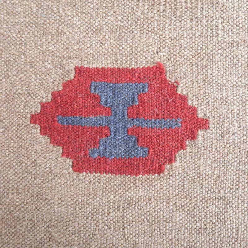 イラン南部シラーズ地方のキリムです。いくつかの色を使用した幾何学柄やギザギザ文様はリズムのある明るい雰囲気。使用している色はどれも、くすみのある落ち着いた色なので、目立たずインテリアに馴染みます。カシュガイの女性が昔ながらに織り上げたキリムなので、よく締まった丈夫な織り目で、早く仕上げる為、ゆるく粗く織られる商用生産のキリムには無い、誠実さが伝わってくる一枚です。また、平織り(ひらおり)という裏表の無い織り方で両面使えます。カシュガイ・キリムは遊牧のテント生活用の為、丈夫に織られ、洗濯も簡単、普段使いのラグとして扱いやすいキリムです。