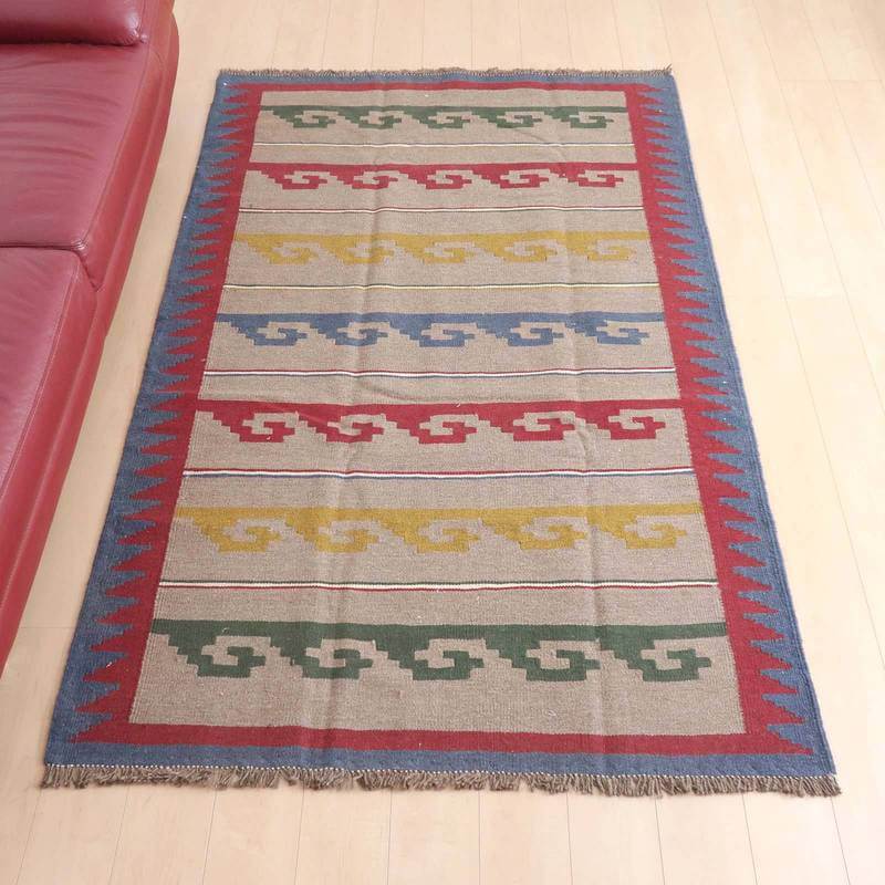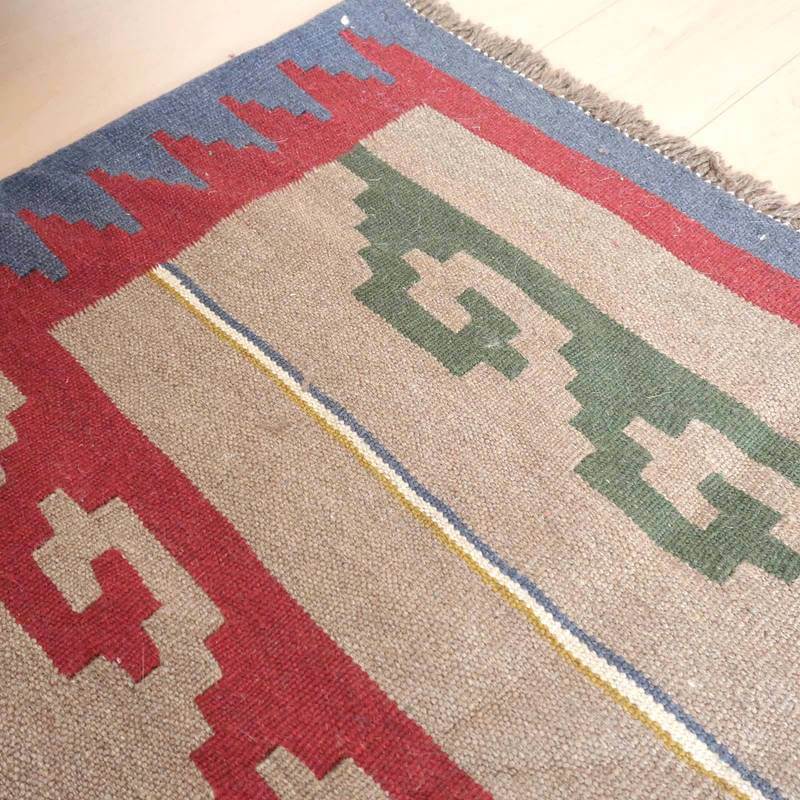 イラン南部シラーズ地方のキリムです。いくつかの色を使用した幾何学柄やギザギザ文様はリズムのある明るい雰囲気。使用している色はどれも、くすみのある落ち着いた色なので、目立たずインテリアに馴染みます。カシュガイの女性が昔ながらに織り上げたキリムなので、よく締まった丈夫な織り目で、早く仕上げる為、ゆるく粗く織られる商用生産のキリムには無い、誠実さが伝わってくる一枚です。また、平織り(ひらおり)という裏表の無い織り方で両面使えます。カシュガイ・キリムは遊牧のテント生活用の為、丈夫に織られ、洗濯も簡単、普段使いのラグとして扱いやすいキリムです。