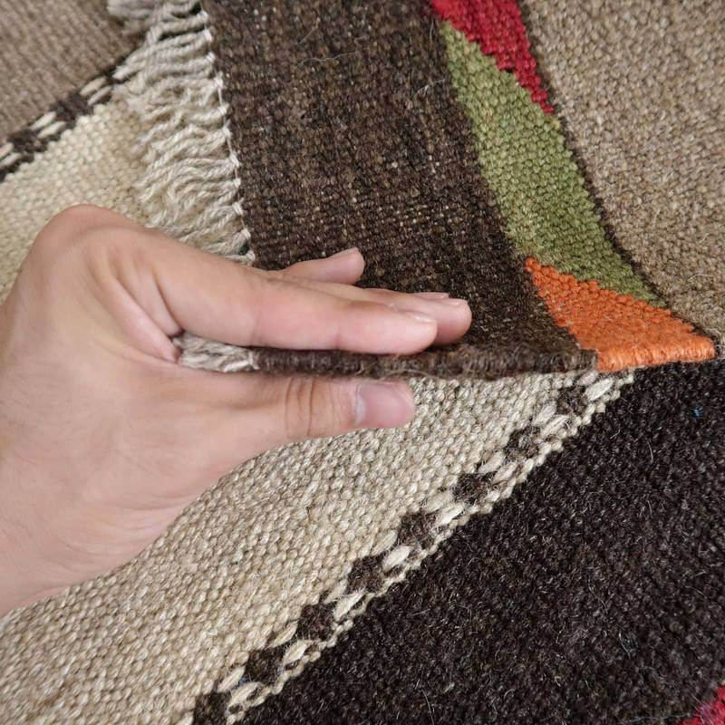 ギャッベでお馴染みのシラーズ地方カシュガイ族に伝わるキリムです。生成りや茶、グレーなどの元々の羊の毛色をそのまま活かした無染色のウールを使用したナチュラルカラーなので、敷く場所を選ばず、落ち着いた雰囲気で馴染みます。幾何学やギザギザ文様のシンプルな中にもリズムのあるモダンなデザイン。カシュガイの女性が昔ながらに織り上げたキリムなので、よく締まった丈夫な織り目で、早く仕上げる為、ゆるく粗く織られる商用生産のキリムには無い、誠実さが伝わってくる一枚です。また、平織り(ひらおり)という裏表の無い織り方で両面使えます。カシュガイ族の遊牧のテント生活用の為、丈夫に織られ、洗濯も簡単、床なじみの良い適度な厚さで、普段使いのラグとして大変使いやすいキリムです。
