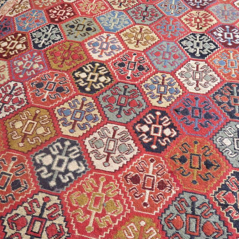 刺繍のように細かな文様が全面に施された美しいスマック織りのキリム。赤を基調に様々な色で文様が入った多色使いですが柄が細かいので落ち着きもあります。一目一目の模様をじっくり眺めて味わえるキリムでたいへん上質感があります。スマック織りは裏面に模様の糸を渡してあるので片面使いのキリムになります。