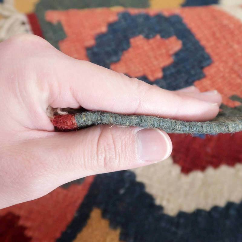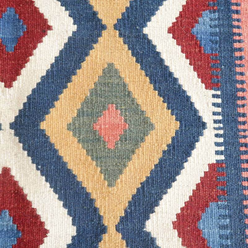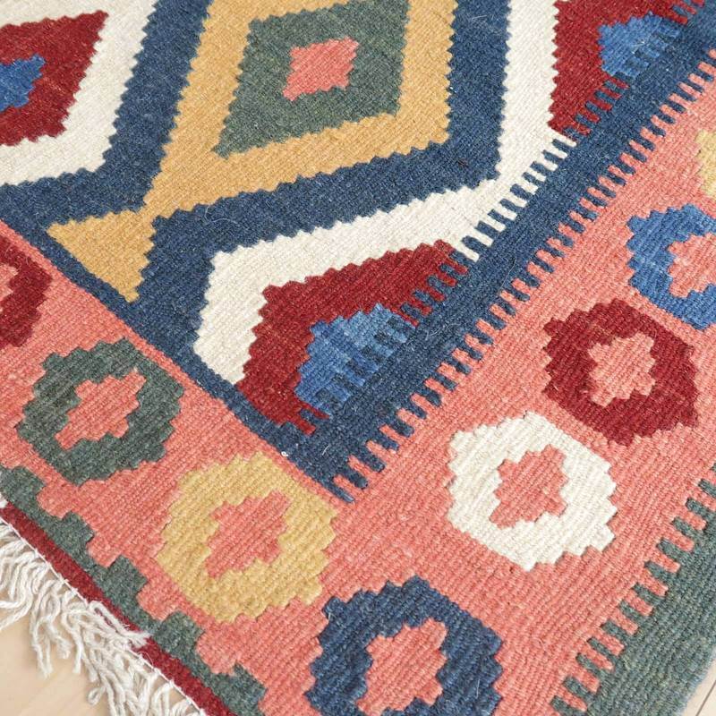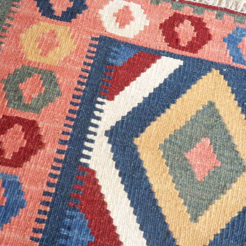 イラン南部シラーズ地方のキリムです。いくつかの色を使用した幾何学柄やギザギザ文様はリズムのある明るい雰囲気。程よく落ち着いた色とウールの風合いが、やさしくインテリアに馴染みます。カシュガイの女性が昔ながらに織り上げたキリムなので、よく締まった丈夫な織り目で、早く仕上げる為、ゆるく粗く織られる商用生産のキリムには無い、誠実さが伝わってくる一枚です。また、平織り(ひらおり)という裏表の無い織り方で両面使えます。カシュガイ族の遊牧のテント生活用の為、丈夫に織られ、洗濯も簡単、床なじみの良い適度な厚さで、普段使いのラグとして大変使いやすいキリムです。
