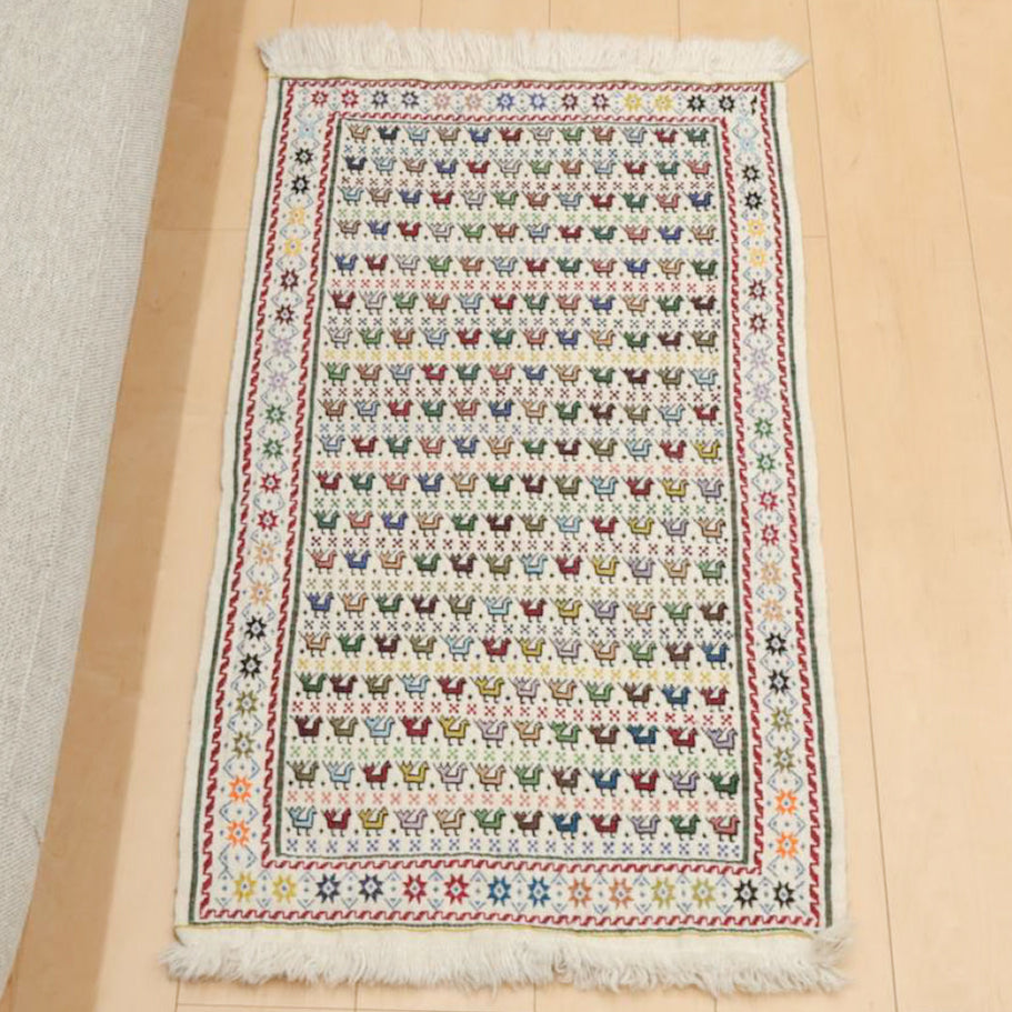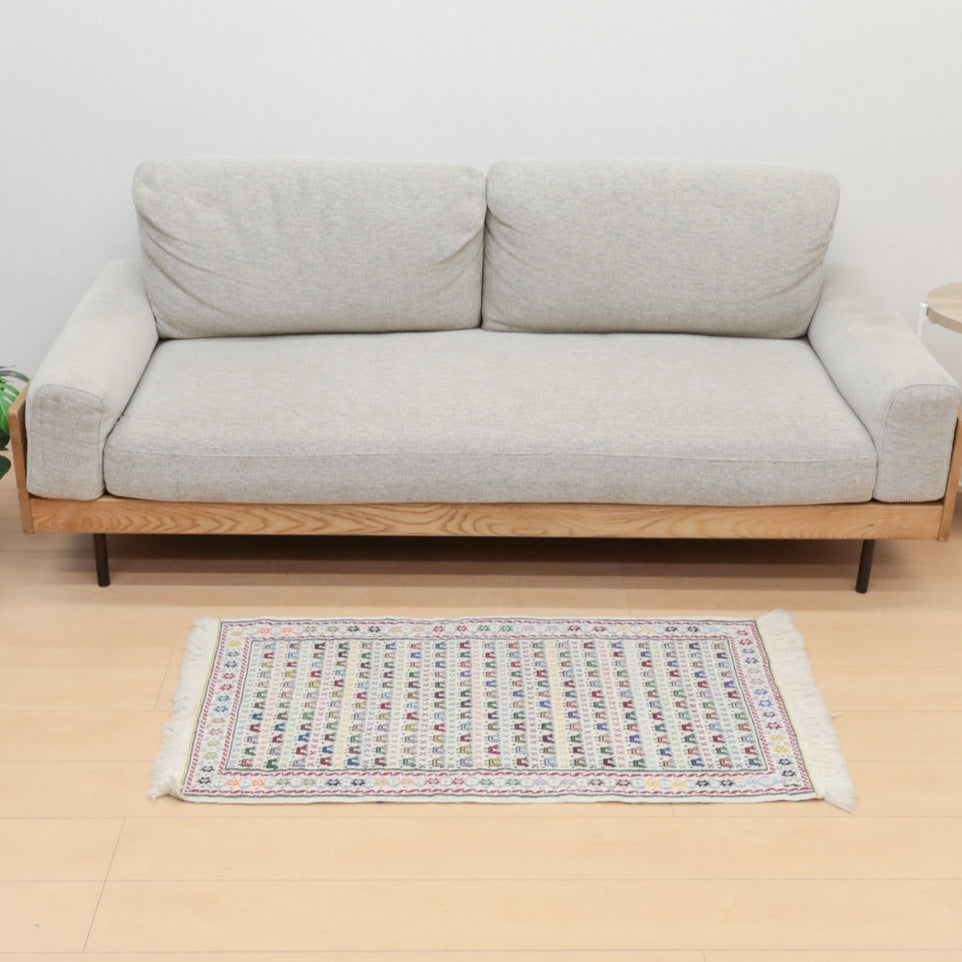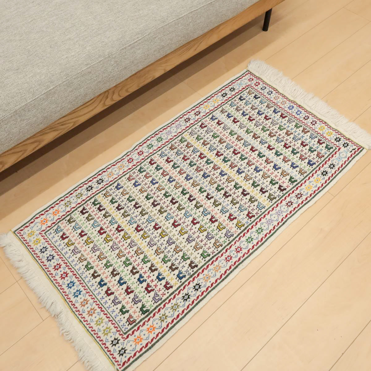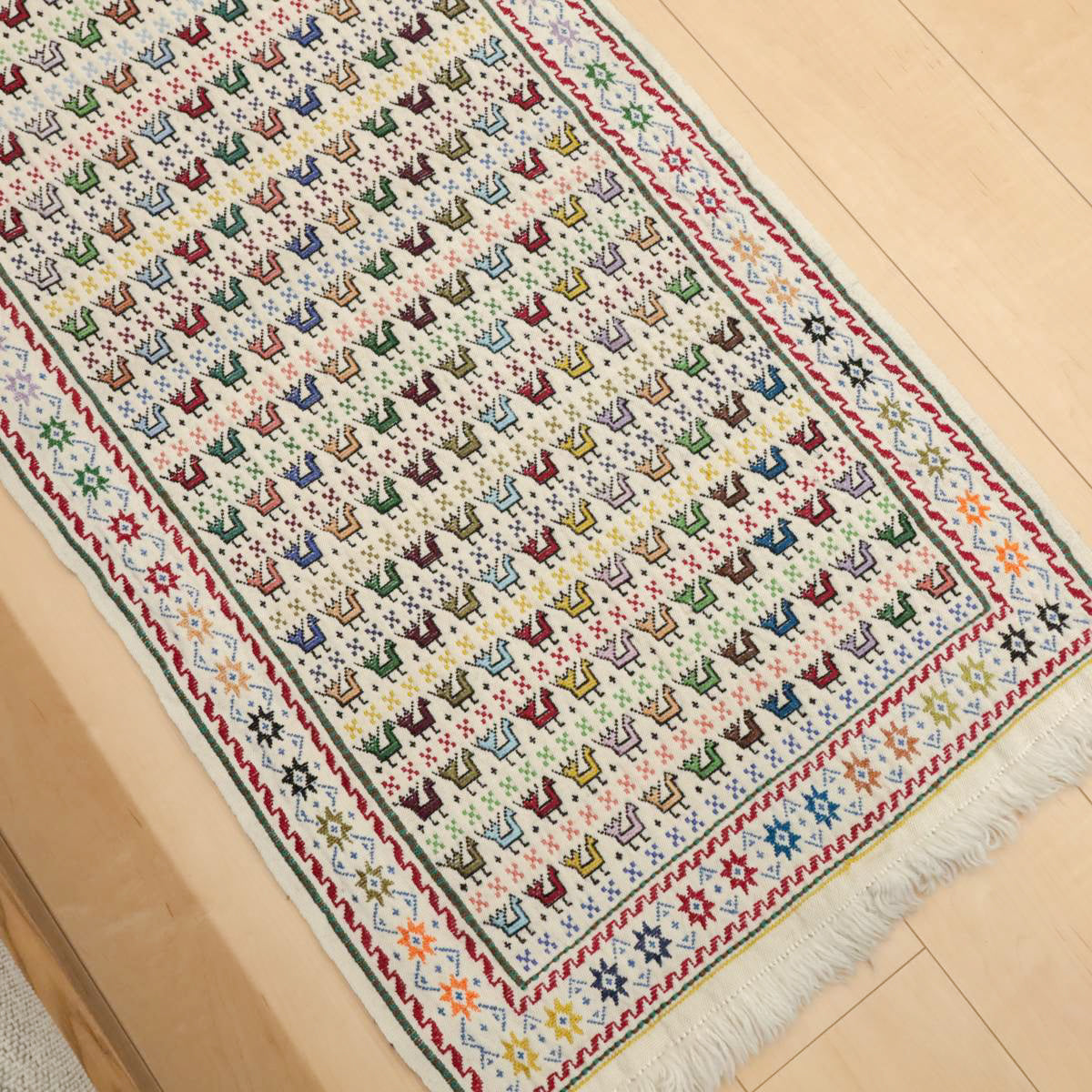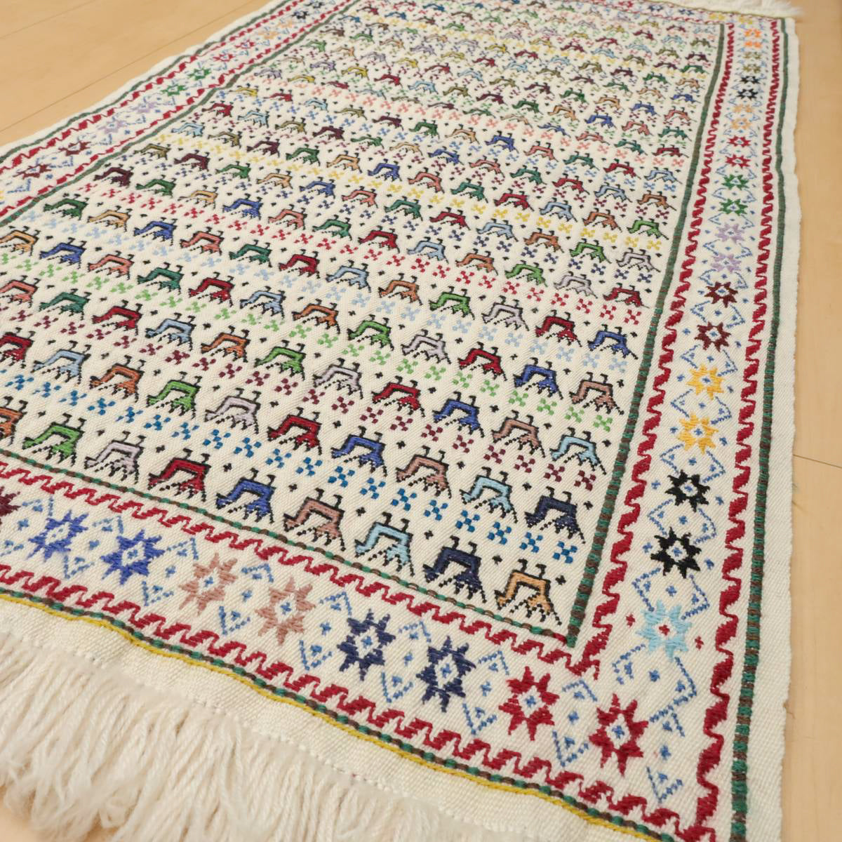 ギャッベでお馴染みのシラーズ地方のキリムです。昔ながらに織り上げたキリムなので、よく締まった丈夫な織り目で、誠実さが伝わってくる一枚です。