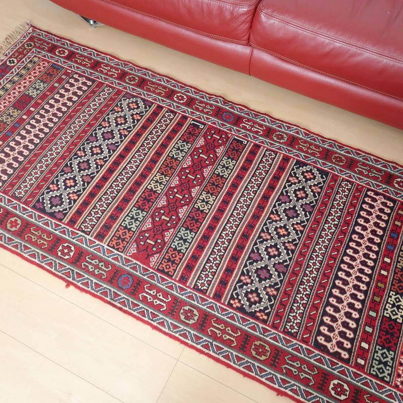 刺繍のように細かな文様が全面に施された美しいスマック織りのキリム。赤を基調に様々な色で文様が入った多色使いですが柄が細かいので落ち着きもあります。一目一目の模様をじっくり眺めて味わえるキリムでたいへん上質感があります。スマック織りは裏面に模様の糸を渡してあるので片面使いのキリムになります。スマック織りとは、イランのキリムの織り方の技法です。生地は刺繍のような仕上がりですが、これは後から刺したものではなく、土台の縦糸と横糸の上にもう一本横糸を絡めるように巻き込んで織っていく高度なテクニックで、生地を二重に織るため通常の平織りのキリムより倍の手間ひまが掛かる分高価になりますが、非常に堅固で丈夫、また普通より細かなデザインを描けるという長所がありますので、価格以上の価値を感じて頂けるキリムです。