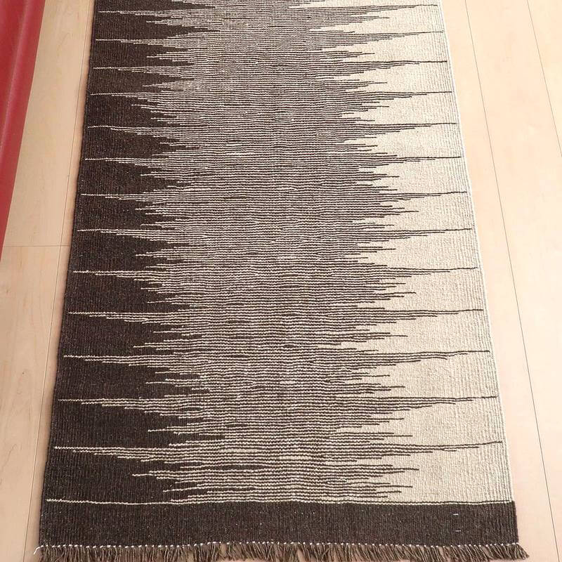 イラン南部シラーズ地方のキリムです。生成りや茶、グレーなどの元々の羊の毛色をそのまま活かした無染色のウールを使用したナチュラルカラーなので、敷く場所を選ばず、落ち着いた雰囲気で馴染みます。幾何学やギザギザ文様のシンプルな中にもリズムのあるモダンなデザイン。カシュガイの女性が昔ながらに織り上げたキリムなので、よく締まった丈夫な織り目で、早く仕上げる為、ゆるく粗く織られる商用生産のキリムには無い、誠実さと愛着が感じられる味わい深さがあります。作りは、平織り(ひらおり)という裏表の無い、両面を使える織り方。カシュガイ・キリムは遊牧のテント生活用の為、丈夫に織られ、洗濯も簡単、普段使いのラグとして扱いやすいキリムです。