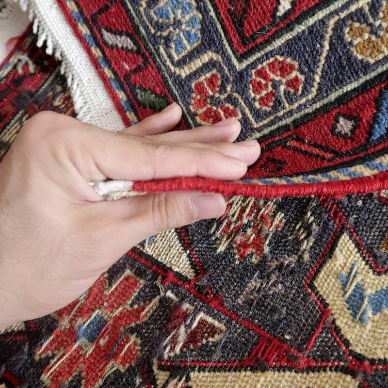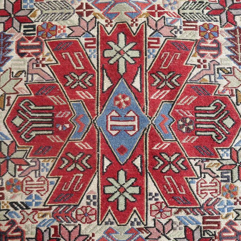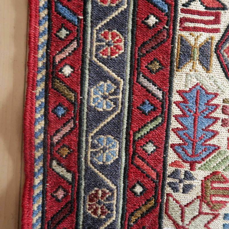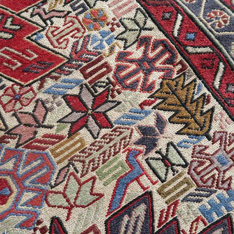 刺繍のように細かな文様が全面に施された美しいスマック織りのキリム。赤を基調に様々な色で文様が入った多色使いですが柄が細かいので落ち着きもあります。一目一目の模様をじっくり眺めて味わえるキリムでたいへん上質感があります。スマック織りは裏面に模様の糸を渡してあるので片面使いのキリムになります。スマック織りとは、イランのキリムの織り方の技法です。生地は刺繍のような仕上がりですが、これは後から刺したものではなく、土台の縦糸と横糸の上にもう一本横糸を絡めるように巻き込んで織っていく高度なテクニックで、生地を二重に織るため通常の平織りのキリムより倍の手間ひまが掛かる分高価になりますが、非常に堅固で丈夫、また普通より細かなデザインを描けるという長所がありますので、価格以上の価値を感じて頂けるキリムです。